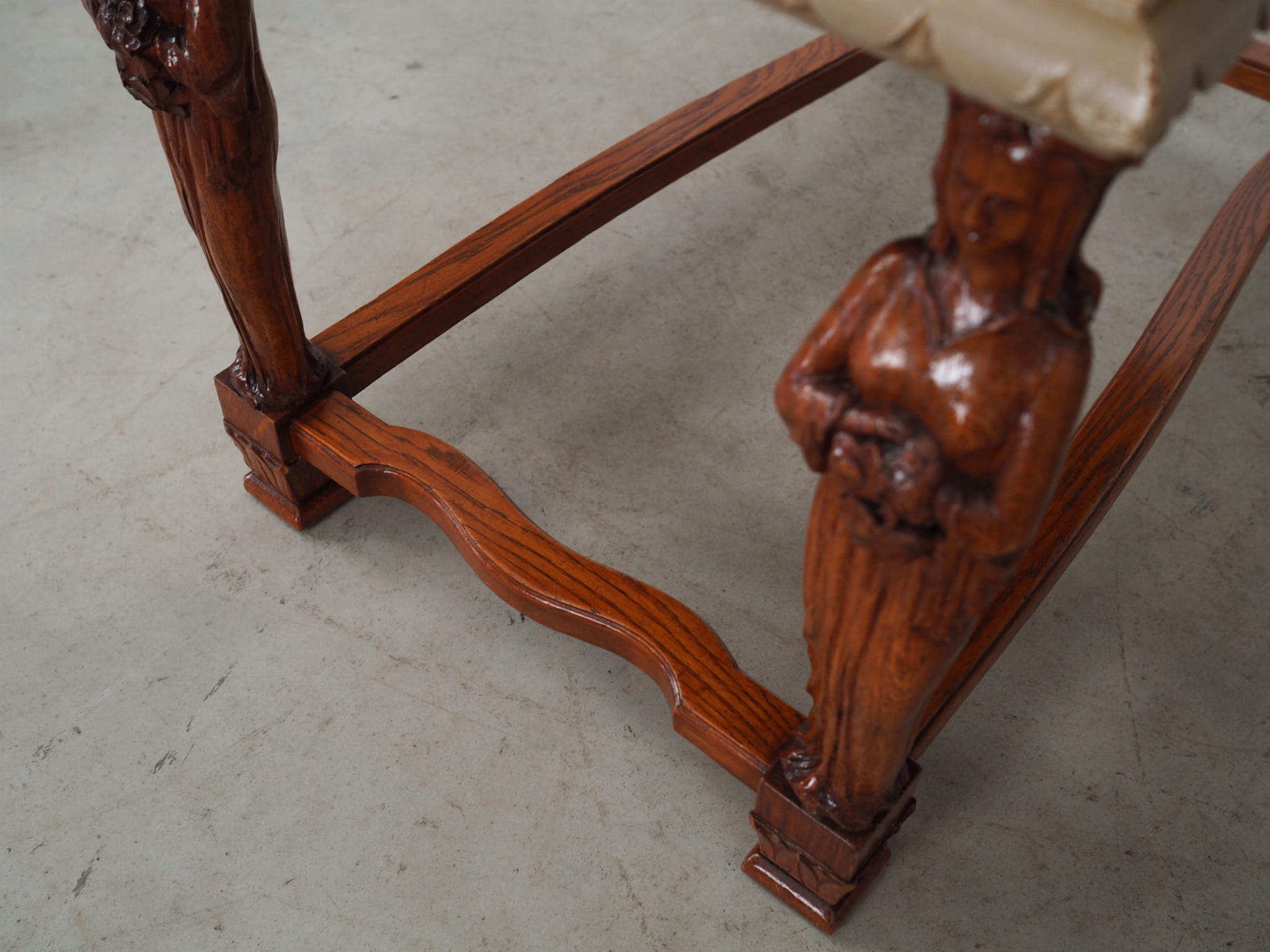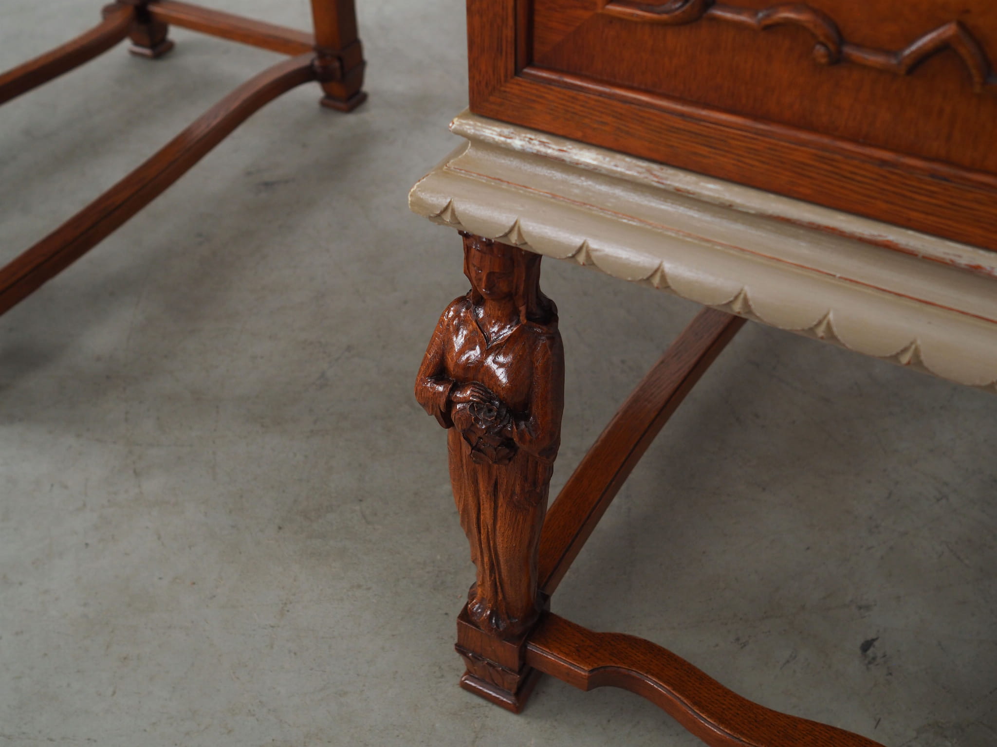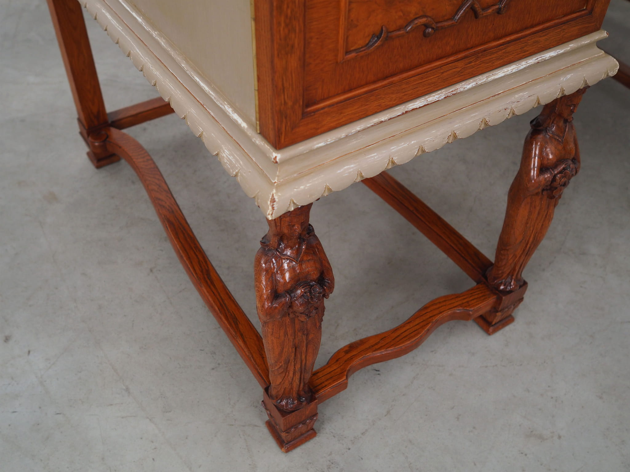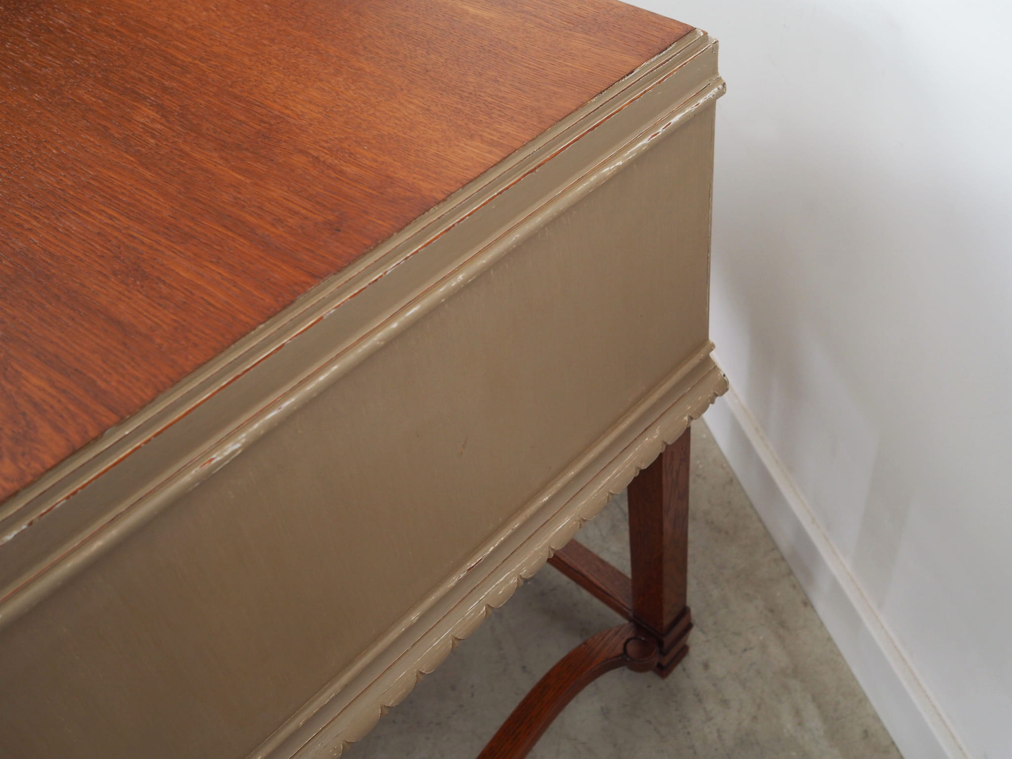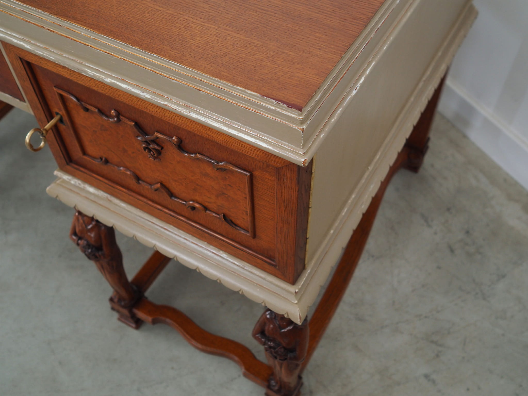 Blat pokryty został fornirem dębowym. Nogi wykonane z litego drewna dębowego. Fronty szafek i szuflady ozdobione czeczotą. Poszczególne elementy mebla zostały wybarwione na kolor beżowy metodą shabby chic. Powierzchnia po odświeżeniu. Od frontu biurko posiada dwie pojemne szafki oraz praktyczną szufladę. Wewnątrz jednej z szafek znajdują się dwie dodatkowe szuflady. Klucz w zestawie.