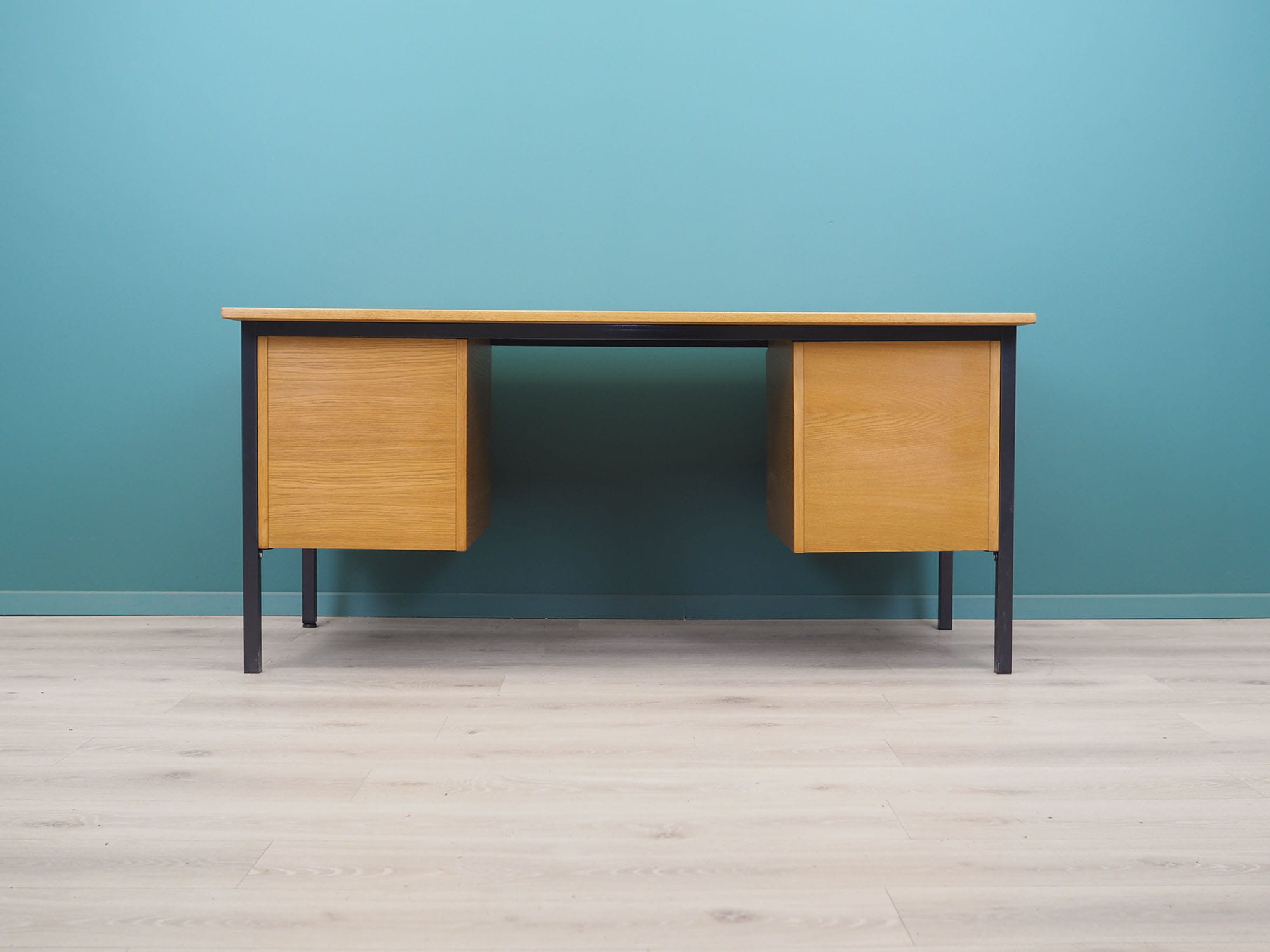 Blat pokryty jest fornirem jesionowym. Nogi wykonane z metalu, uchwyty z litego drewna. Powierzchnia po odświeżeniu. Od frontu biurko posiada cztery praktyczne szuflady. Brak klucza w zestawie.