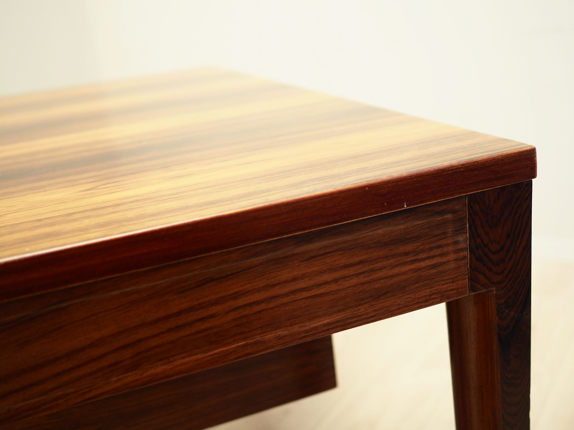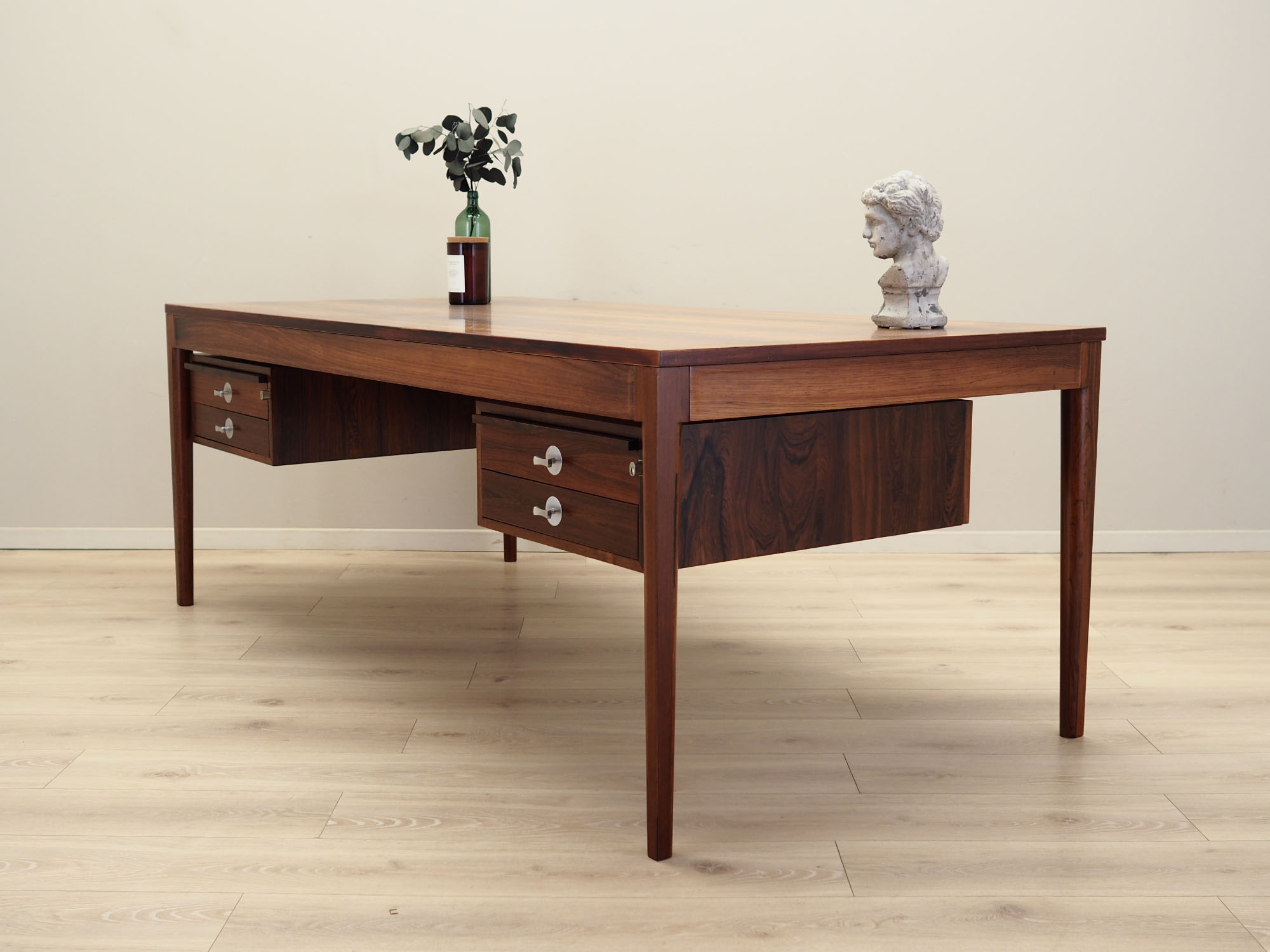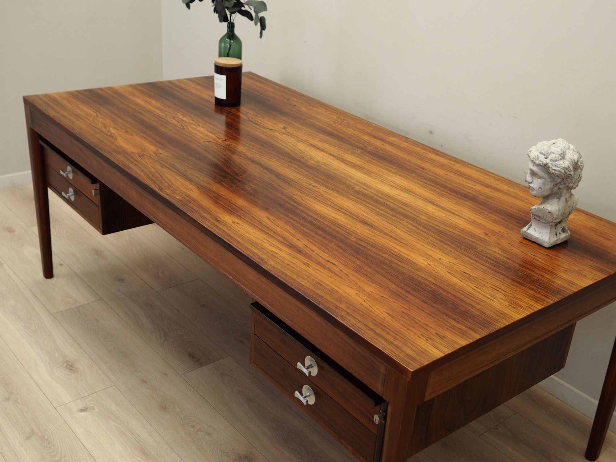 Konstrukcja oraz blat zostały pokryte fornirem palisandrowym. Nogi wykonane z litego drewna, perfekcyjnie wkomponowane w konstrukcję biurka. Powierzchnia po odświeżeniu. Od frontu biurko posiada cztery praktyczne szuflady. Dodatkowym atutem są dwa pomocnicze wysuwane blaty. Klucz w zestawie.