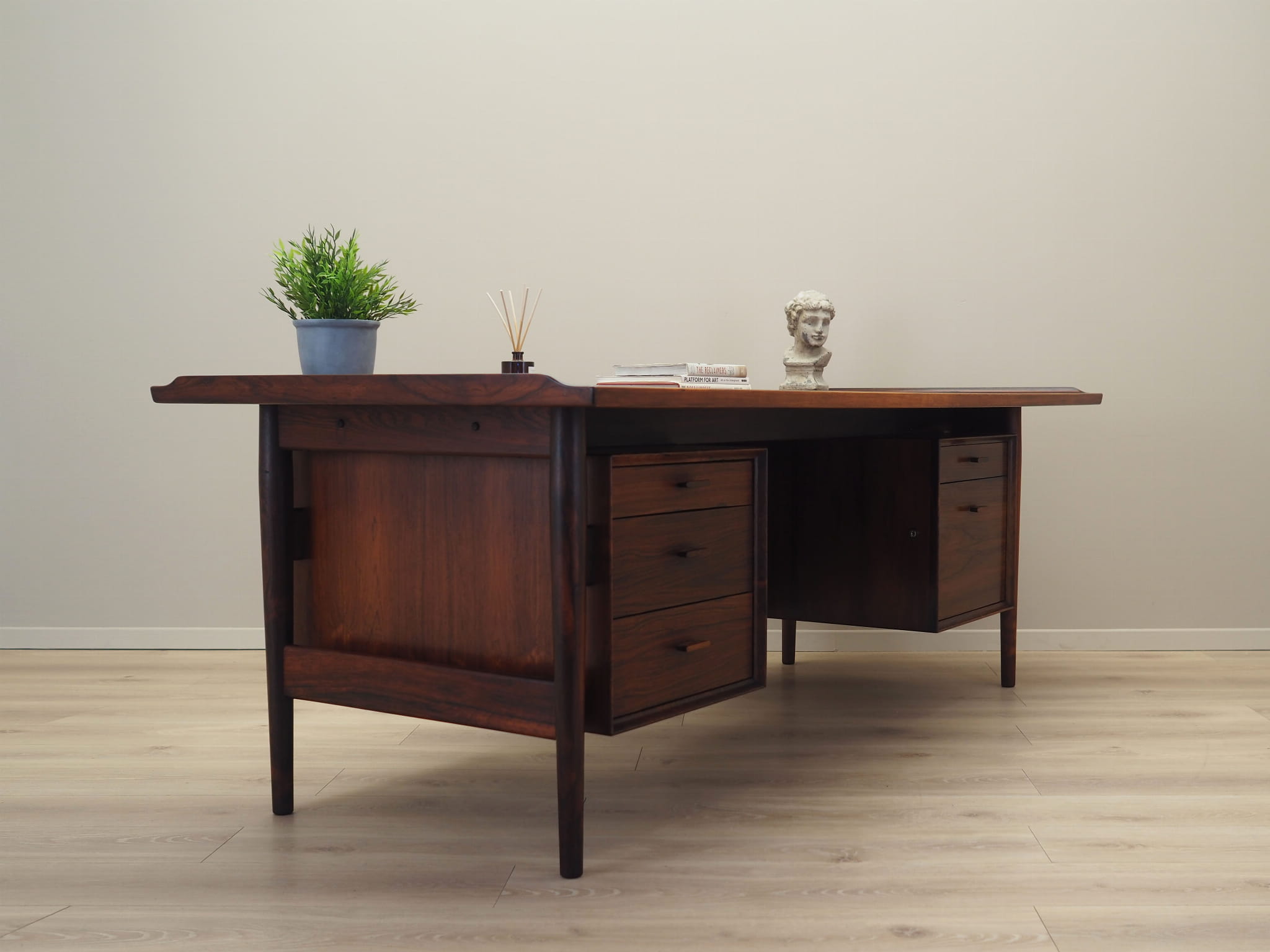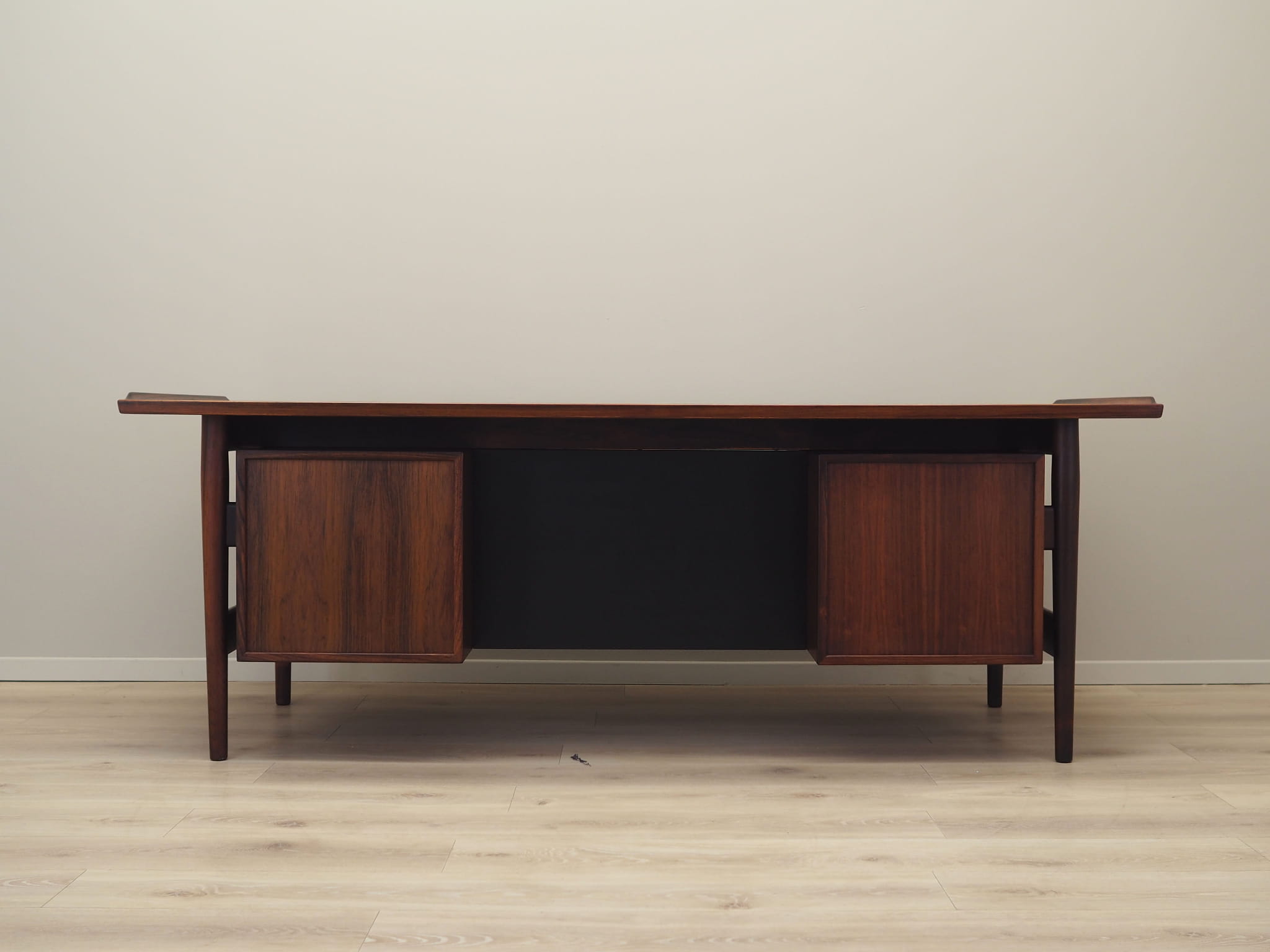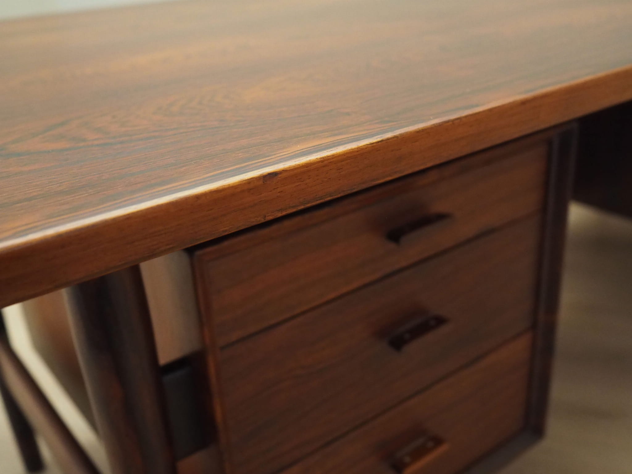 Konstrukcja oraz blat zostały pokryte fornirem palisandrowym. Nogi wykonane z litego drewna palisandrowego, perfekcyjnie wkomponowane w konstrukcję biurka. Powierzchnia po odświeżeniu. Od frontu biurko posiada pięć praktycznych szuflad. W komplecie klucz do jednego zamka.
