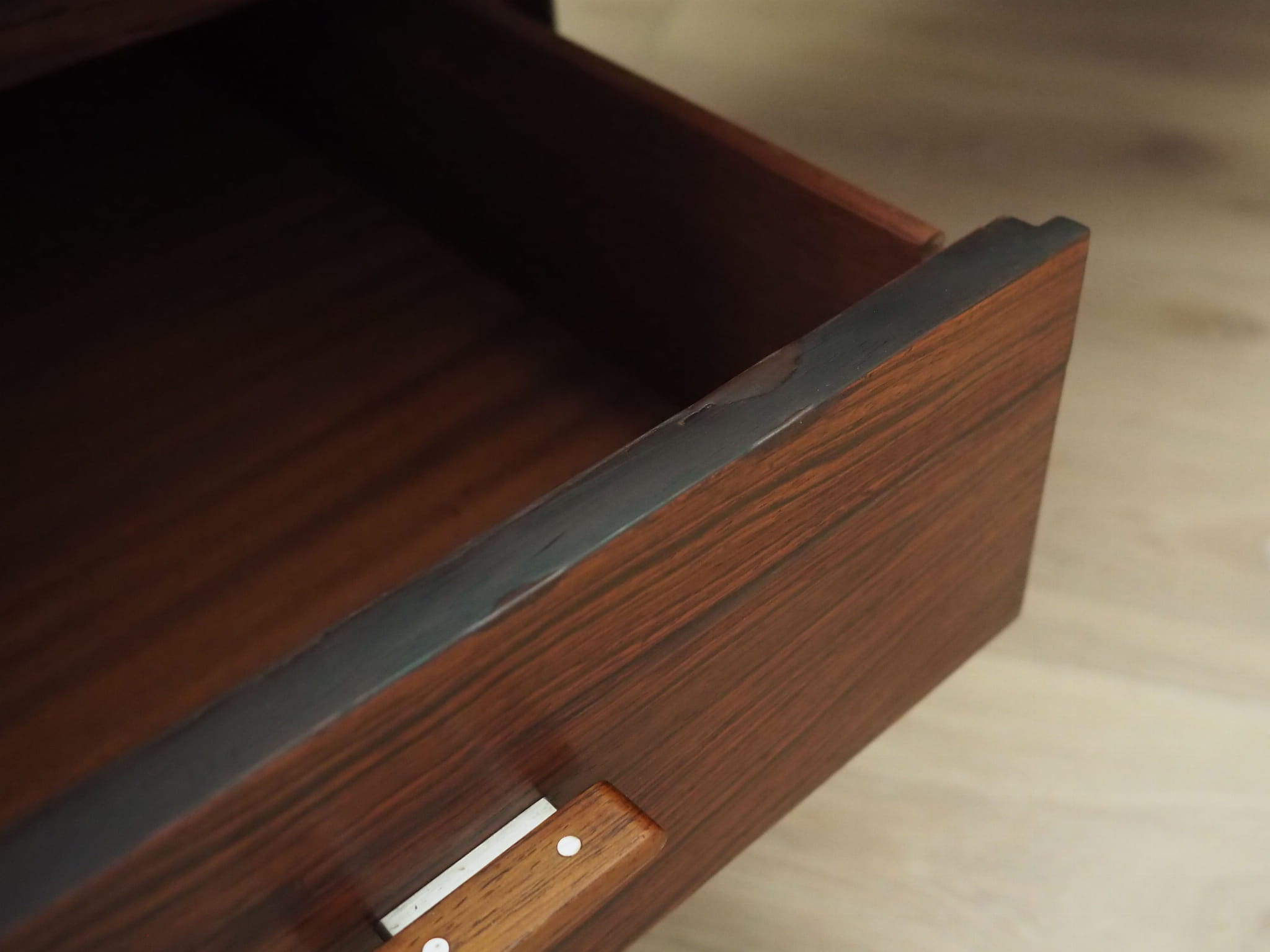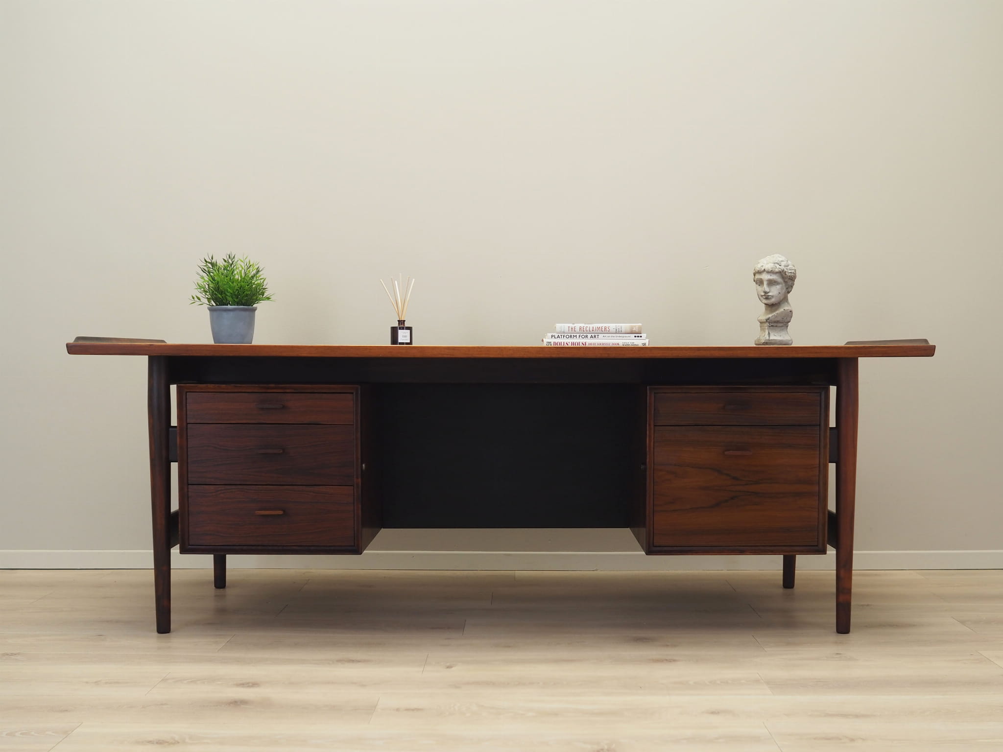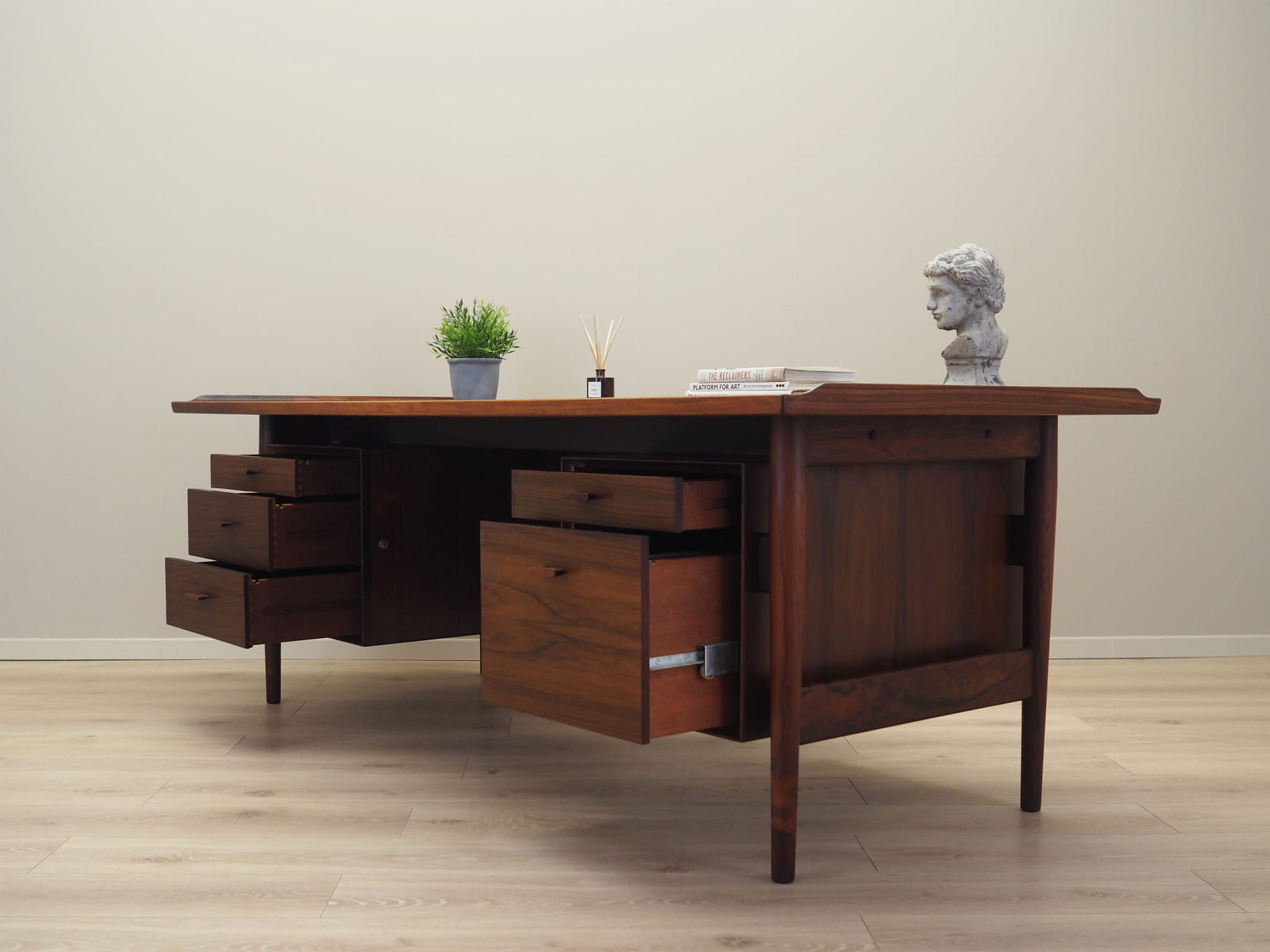 Konstrukcja oraz blat zostały pokryte fornirem palisandrowym. Nogi wykonane z litego drewna palisandrowego, perfekcyjnie wkomponowane w konstrukcję biurka. Powierzchnia po odświeżeniu. Od frontu biurko posiada pięć praktycznych szuflad. W komplecie klucz do jednego zamka.