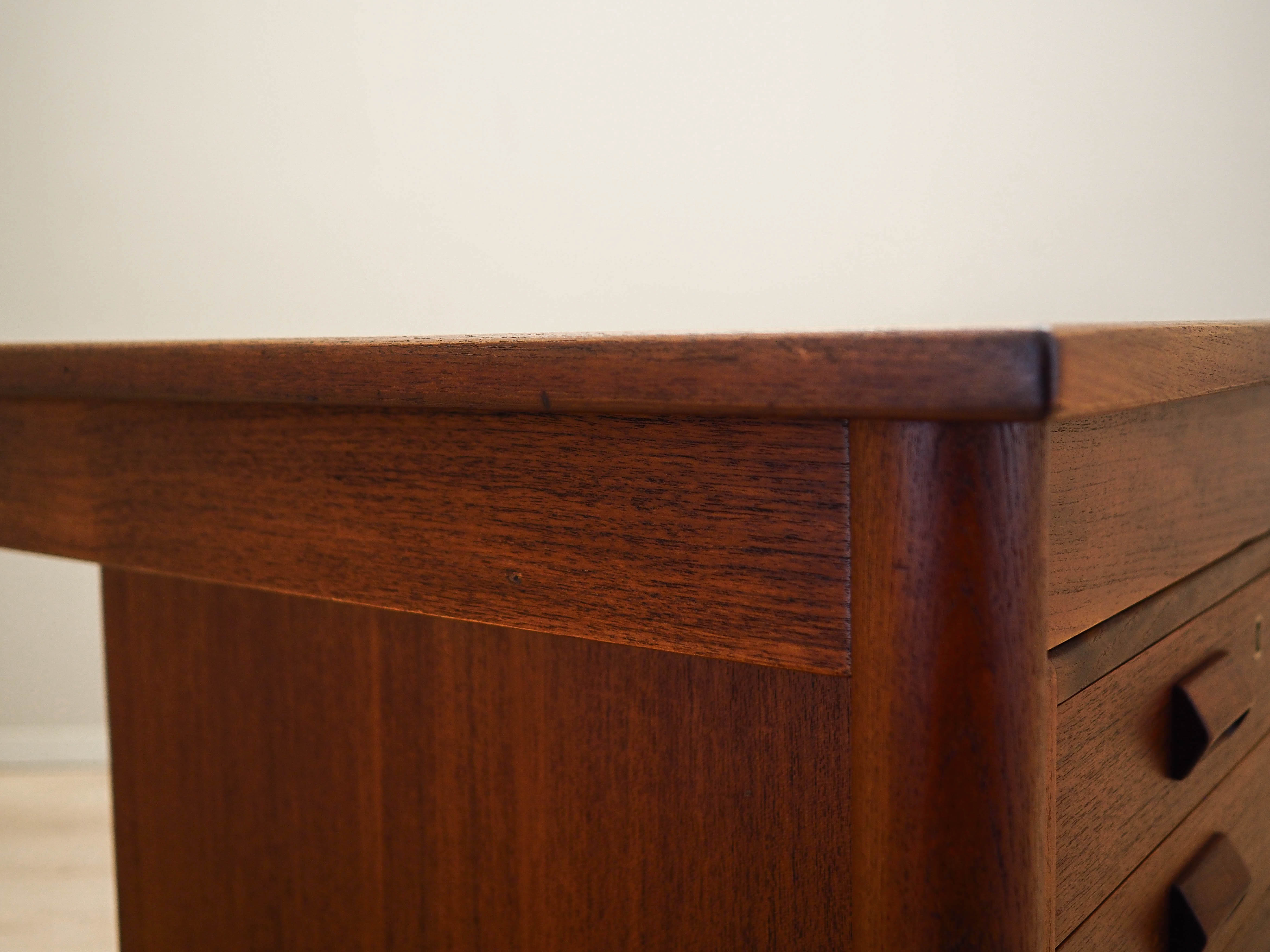 Konstrukcja oraz blat zostały pokryte fornirem tekowym. Nogi wykonane z litego drewna, perfekcyjnie wkomponowane w konstrukcję biurka. Powierzchnia po odświeżeniu. Od frontu biurko posiada sześć praktycznych szuflad. Brak klucza w zestawie.