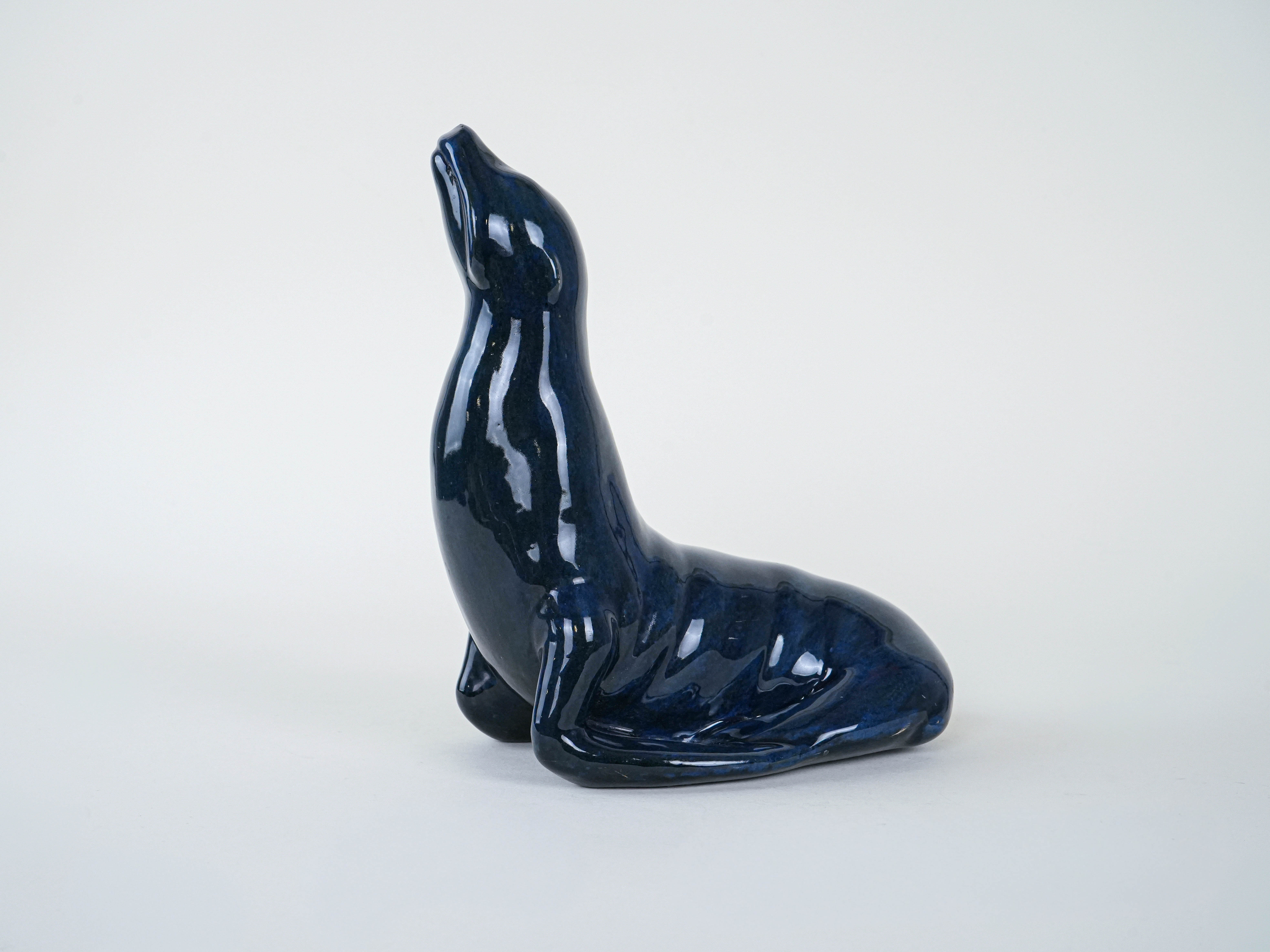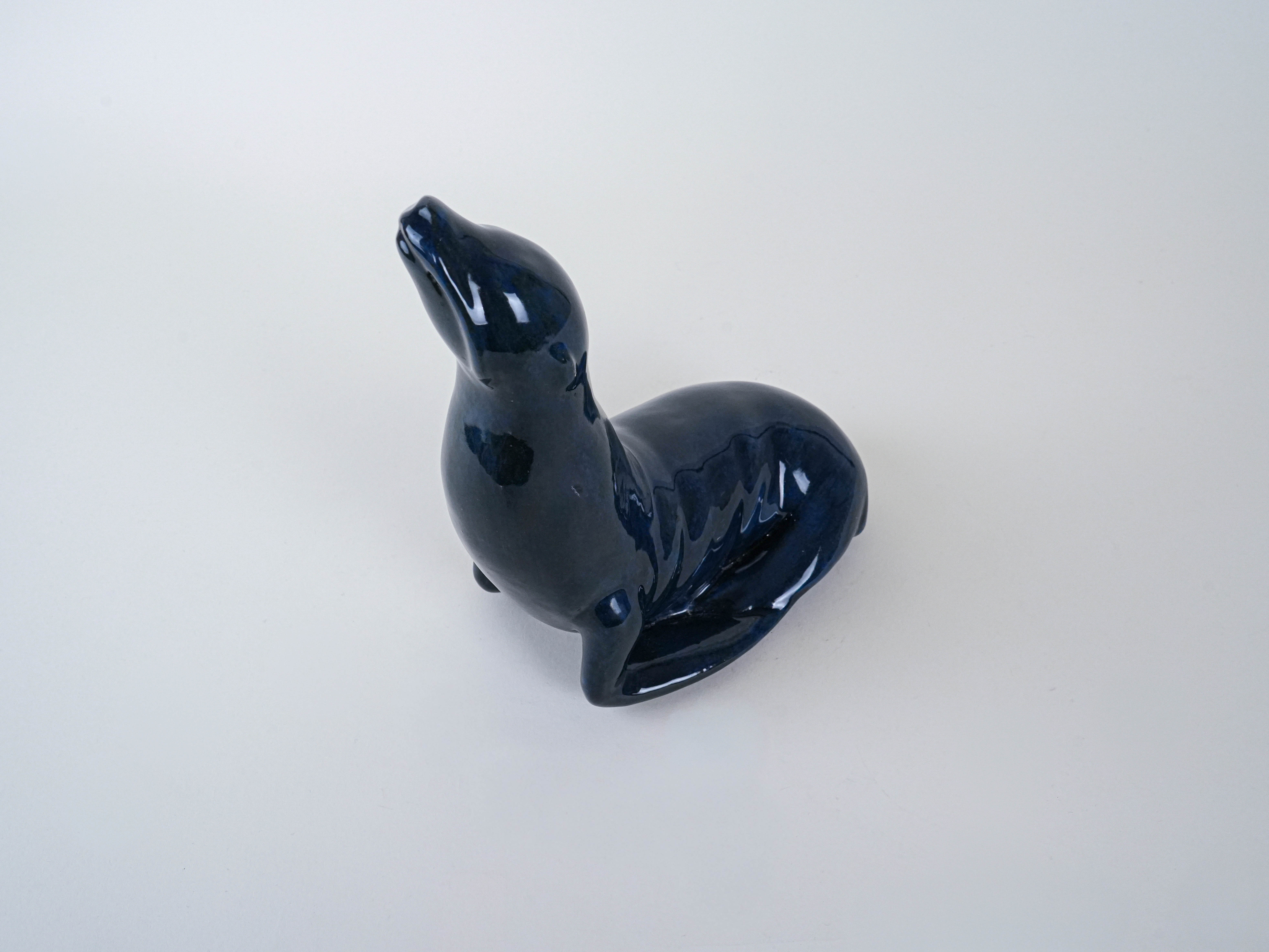 Figurka przedstawiająca fokę, wykonana z ceramiki szkliwionej w głębokim granatowym odcieniu. Autentyczny egzemplarz vintage z lat 60–70, w duchu modernistycznych dekoracji zoomorficznych. Kolekcjonerski obiekt, łączący prostotę formy z wyrazistą kolorystyką charakterystyczną dla epoki mid-century.