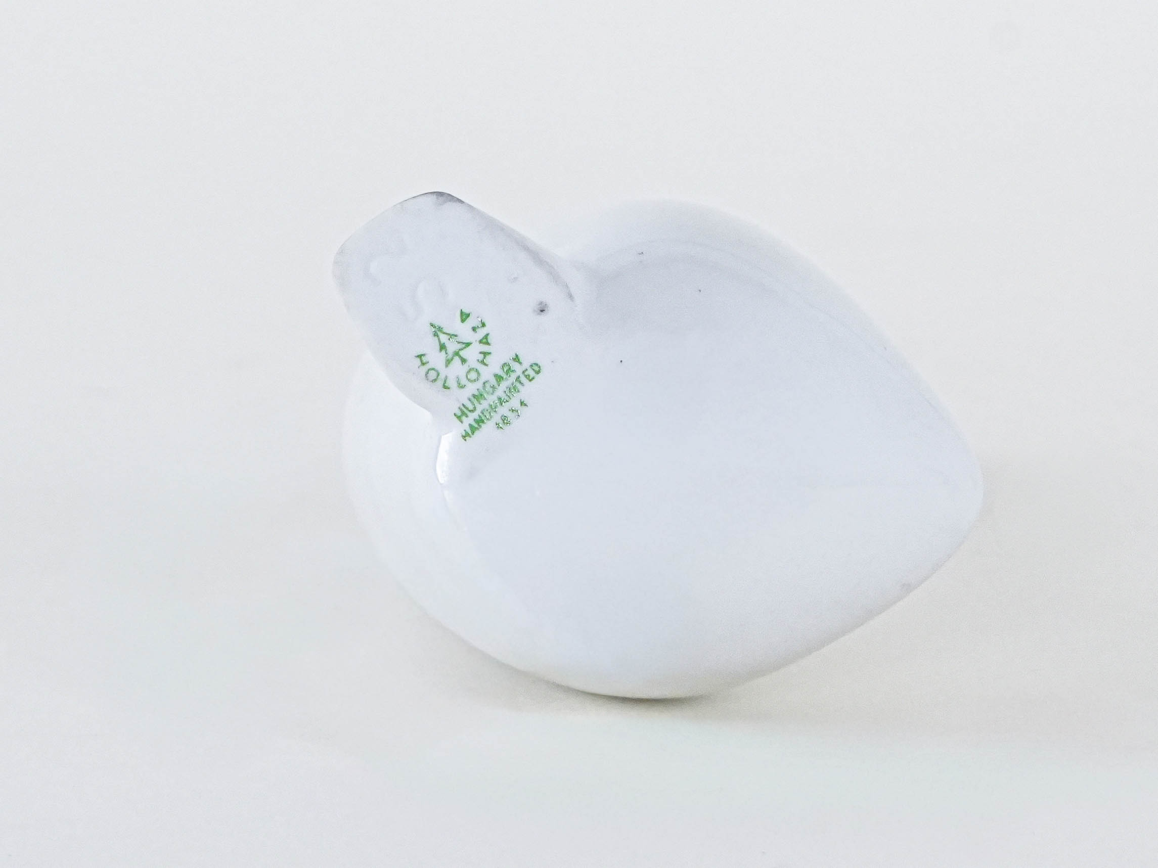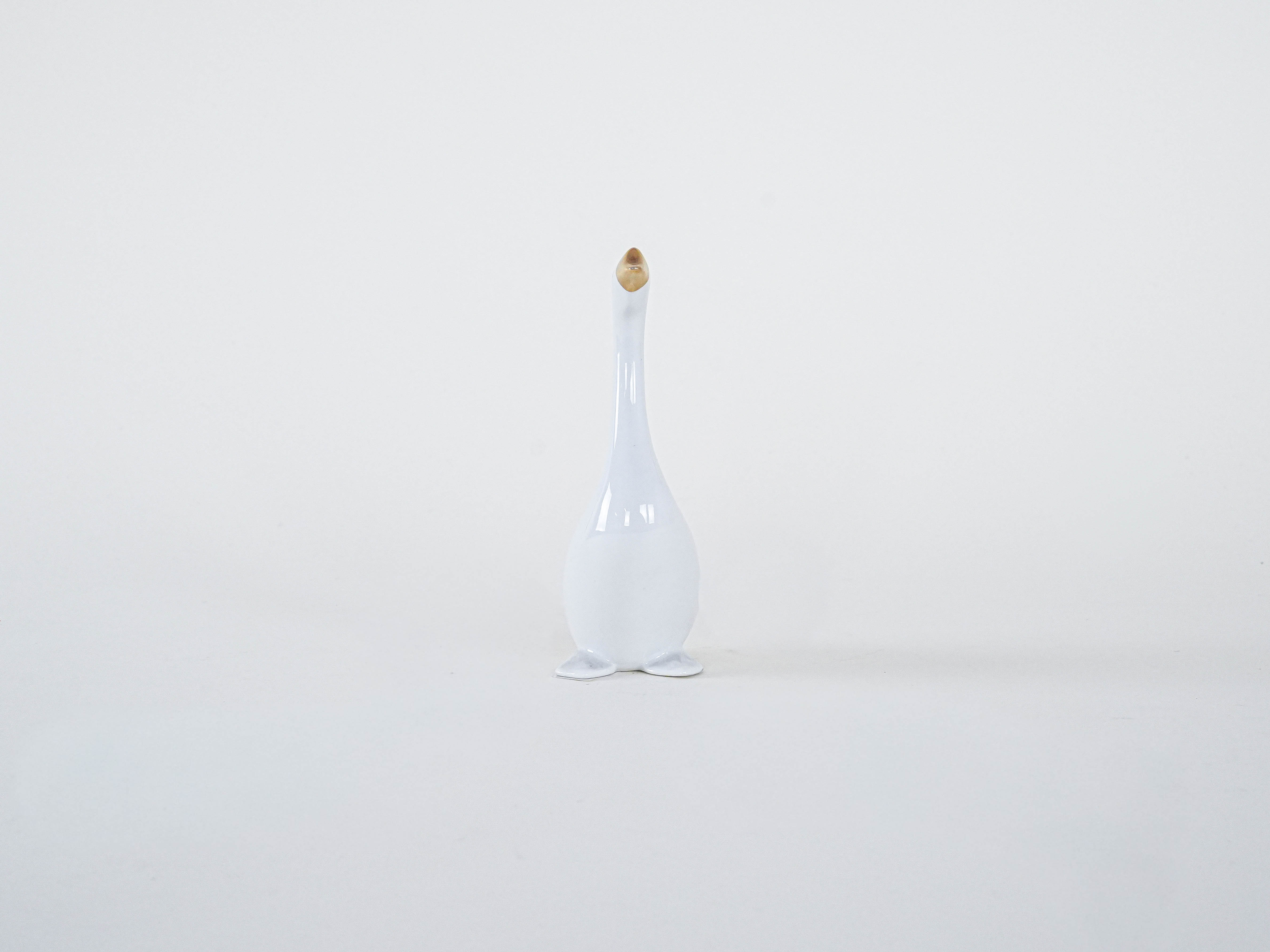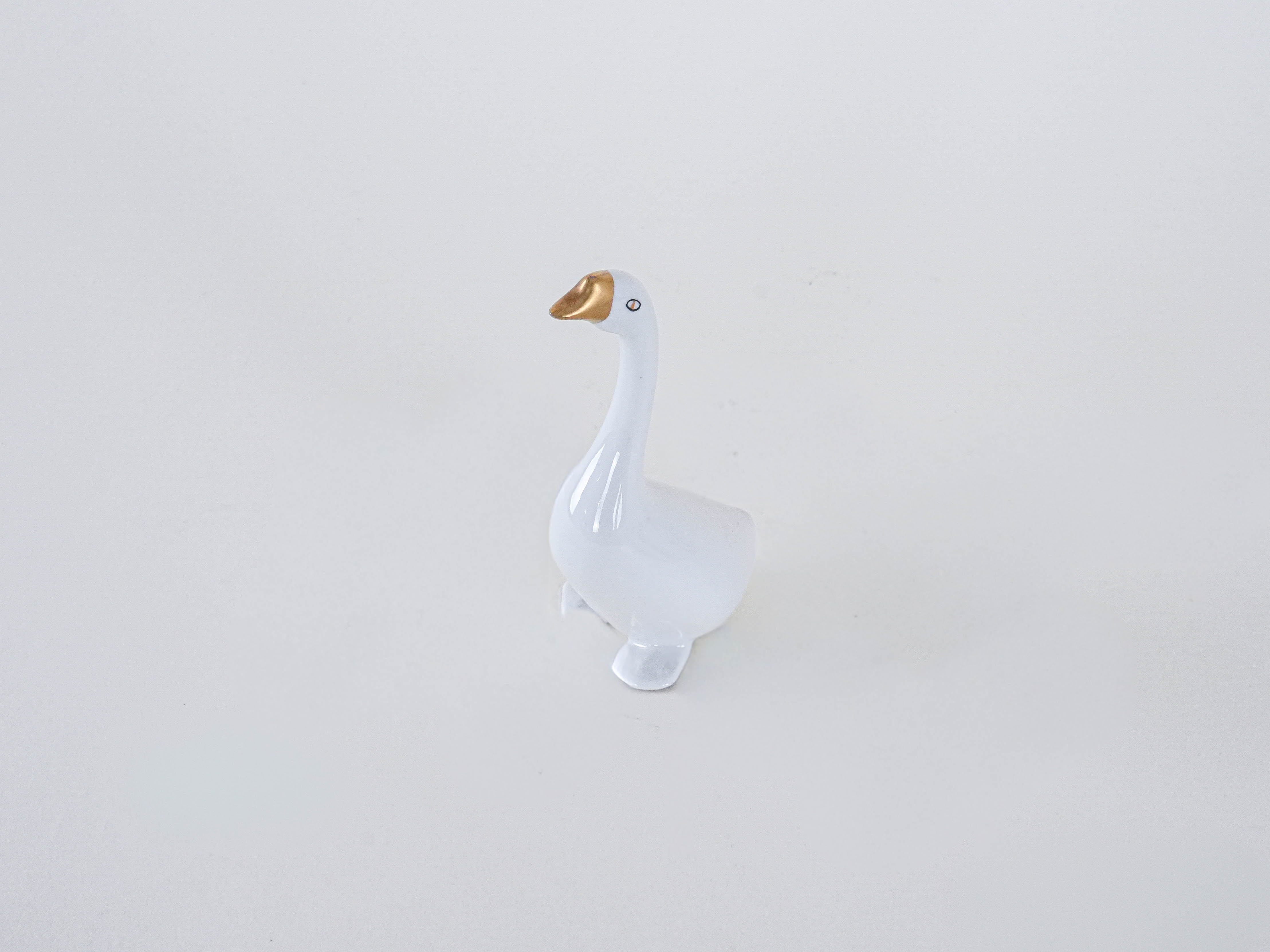 Figurka porcelanowej gęsi od Holloháza (Węgry) – jedna z najstarszych europejskich manufaktur porcelany, działająca od XVIII wieku. Minimalistyczna forma z lat 60./70., ze złoconym dziobem i stylizowanym okiem, to doskonały przykład węgierskiego wzornictwa mid-century.