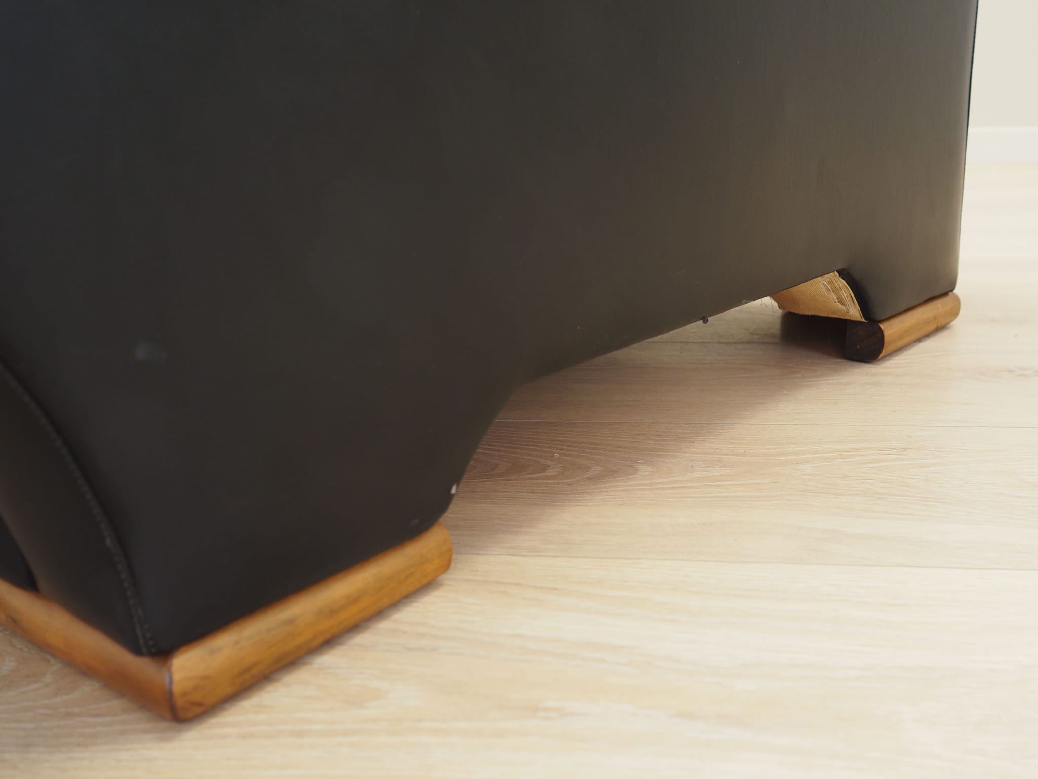 Nogi wykonane z litego drewna. Fotel pokryty jest oryginalną, wysokiej jakości ekoskórą w kolorze czarnym. W naszej ofercie dostępny jest również drugi, identyczny fotel - razem stworzą niepowtarzalny zestaw.