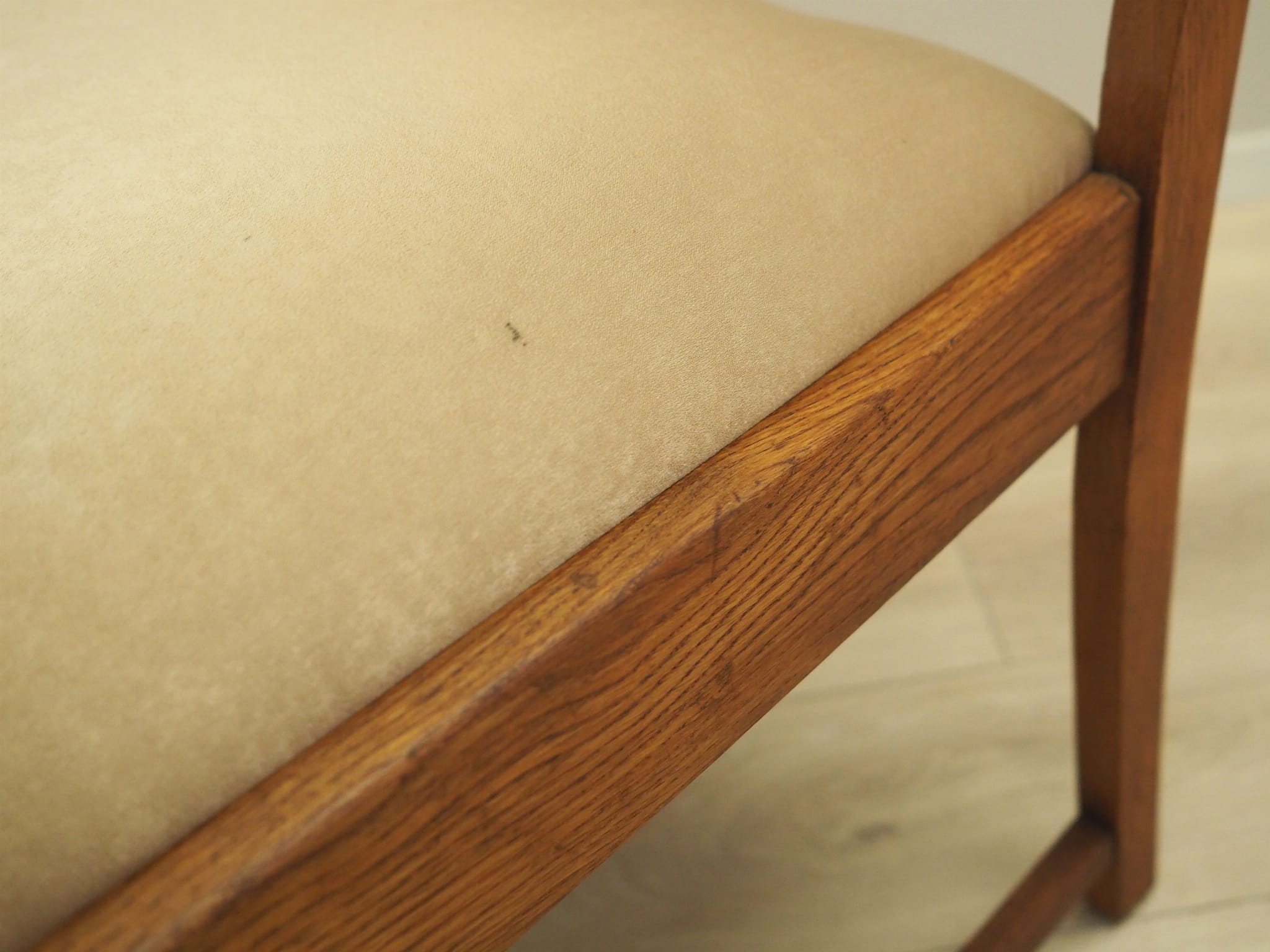 Konstrukcja wykonana jest z drewna dębowego. Drewno po odświeżeniu. Fotel został poddany renowacji tapicerskiej, tkanina wymieniona na nową. Tapicerka została wykonana w kolorze beżowym, wykorzystana została wysokogatunkowa tkanina welurowa.