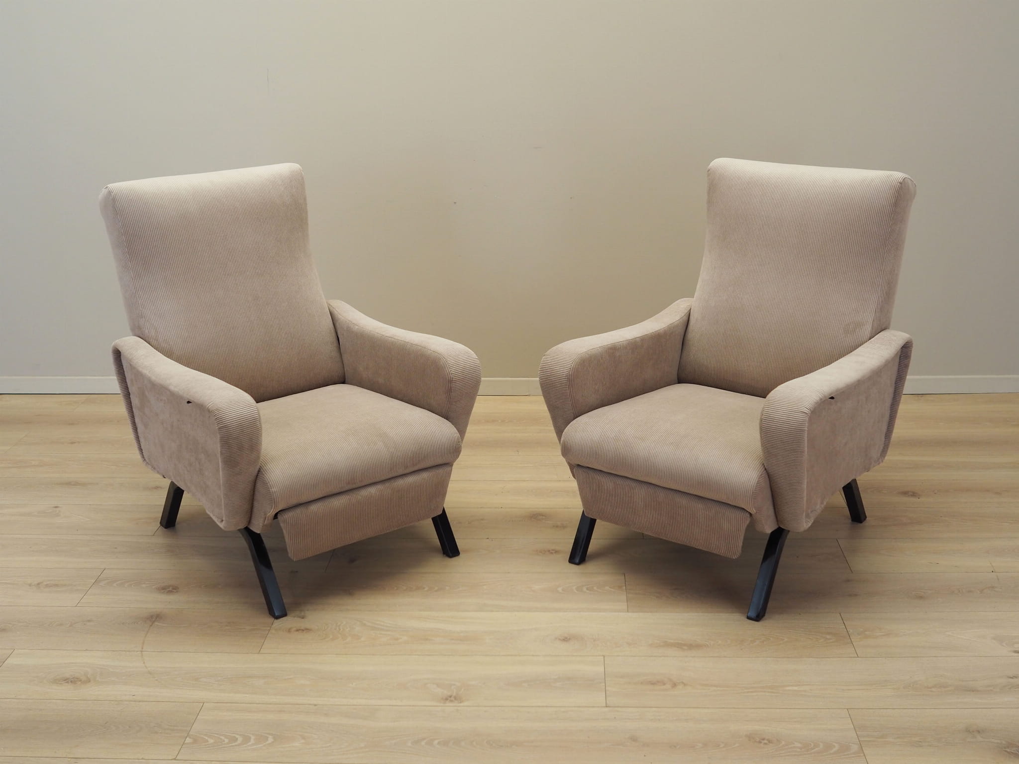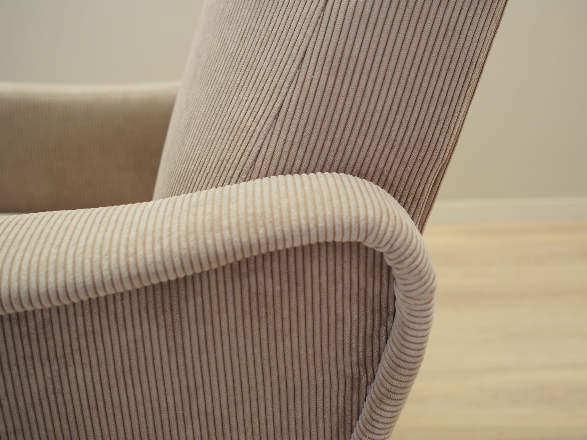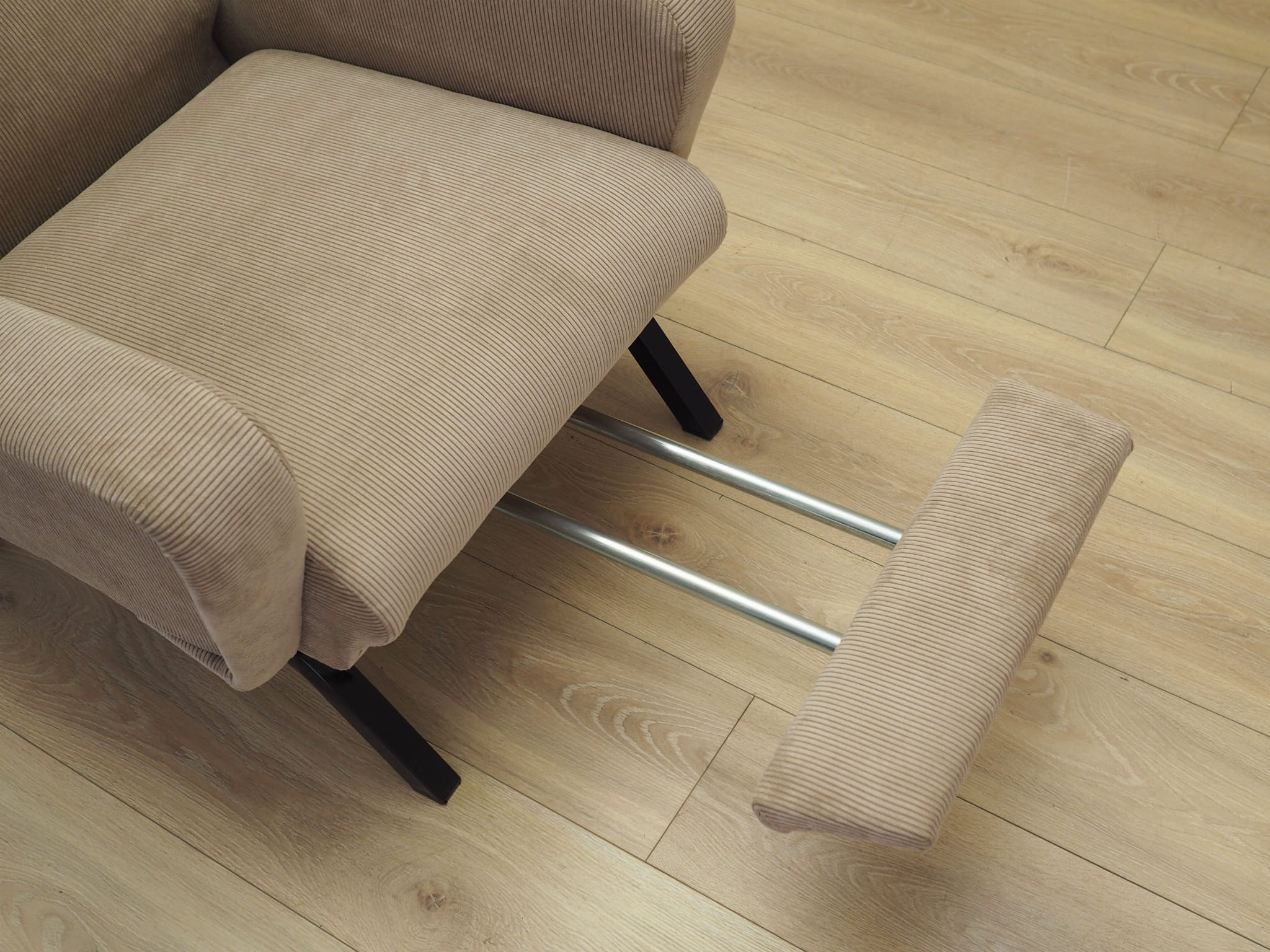 Nogi wykonane z metalu. Fotel został poddany renowacji tapicerskiej, tkanina wymieniona na nową. Tapicerka została wykonana w kolorze beżowym, wykorzystana została wysokogatunkowa tkanina. Atutem mebla jest regulacja oparcia oraz wysuwany podnóżek. W naszej ofercie dostępny jest również drugi, identyczny fotel - razem stworzą niepowtarzalny zestaw.