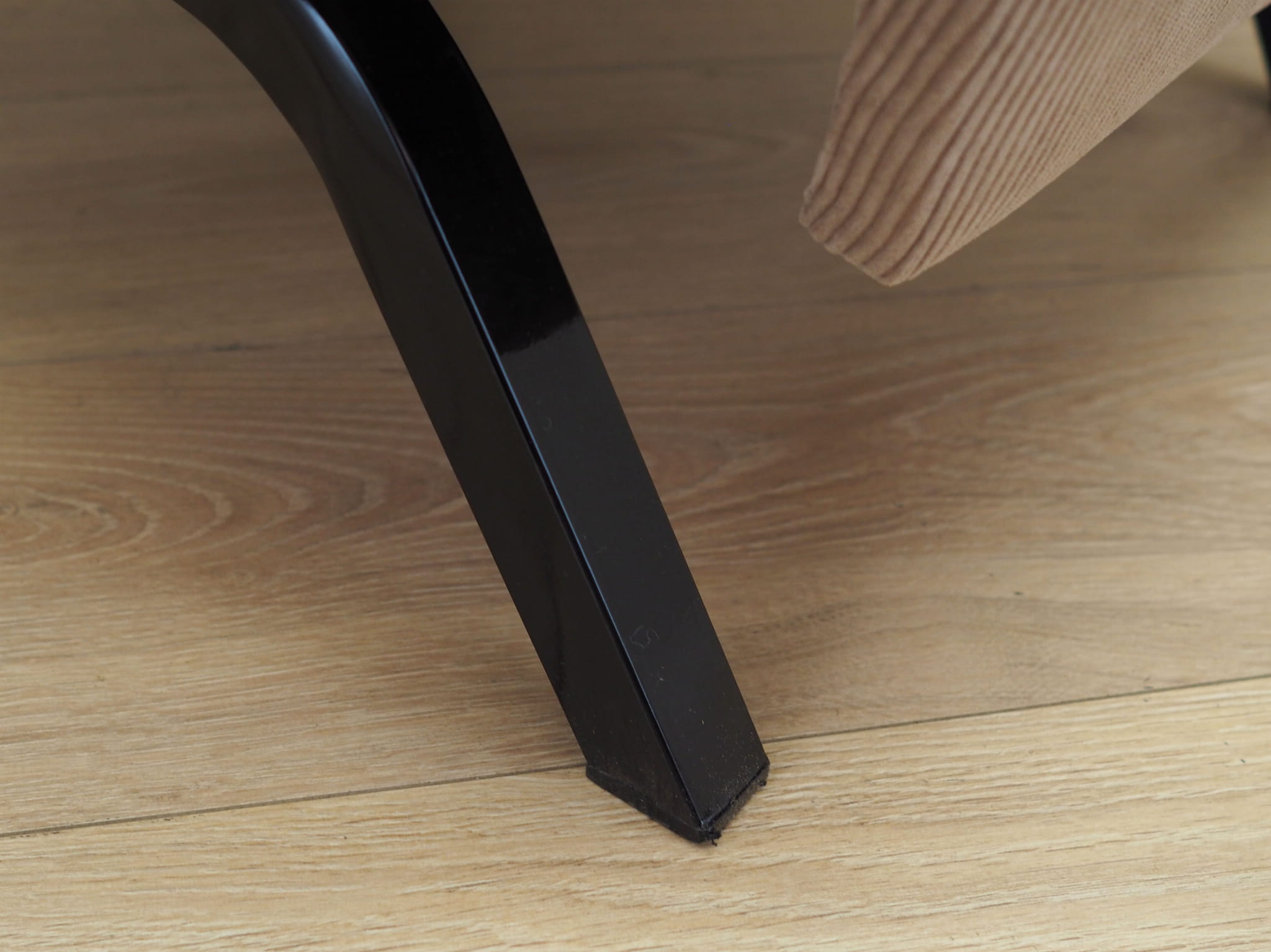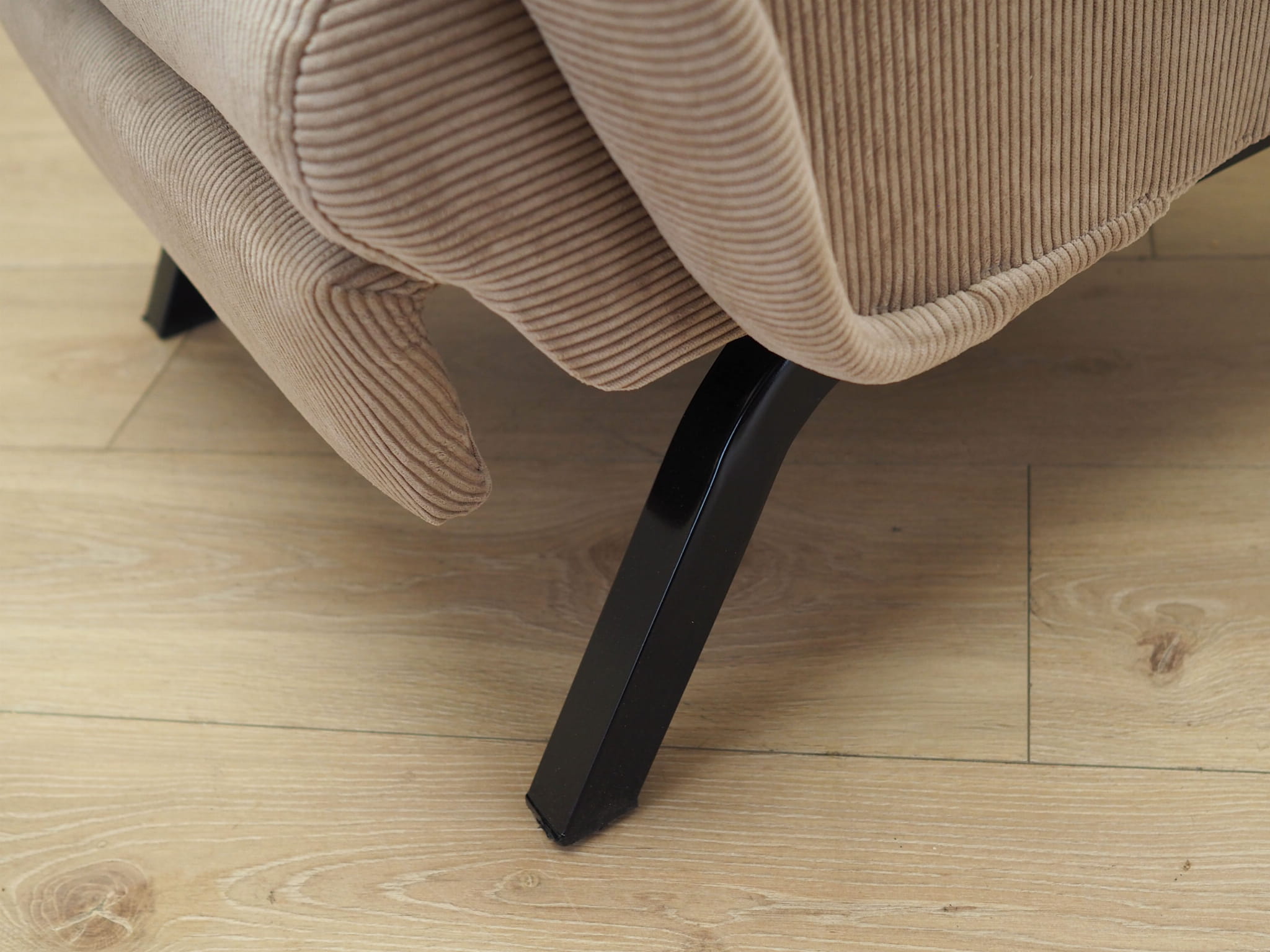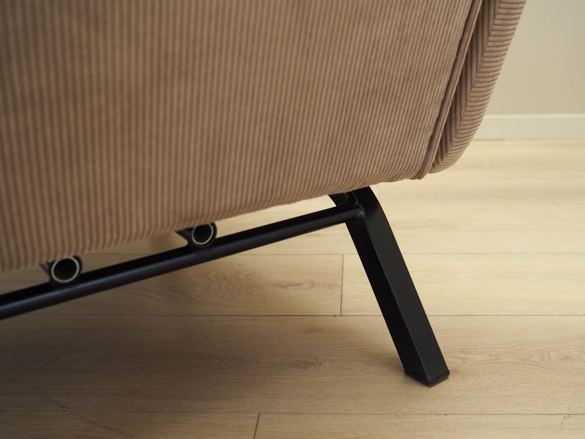 Nogi wykonane z metalu. Fotel został poddany renowacji tapicerskiej, tkanina wymieniona na nową. Tapicerka została wykonana w kolorze beżowym, wykorzystana została wysokogatunkowa tkanina. Atutem mebla jest regulacja oparcia oraz wysuwany podnóżek. W naszej ofercie dostępny jest również drugi, identyczny fotel - razem stworzą niepowtarzalny zestaw.