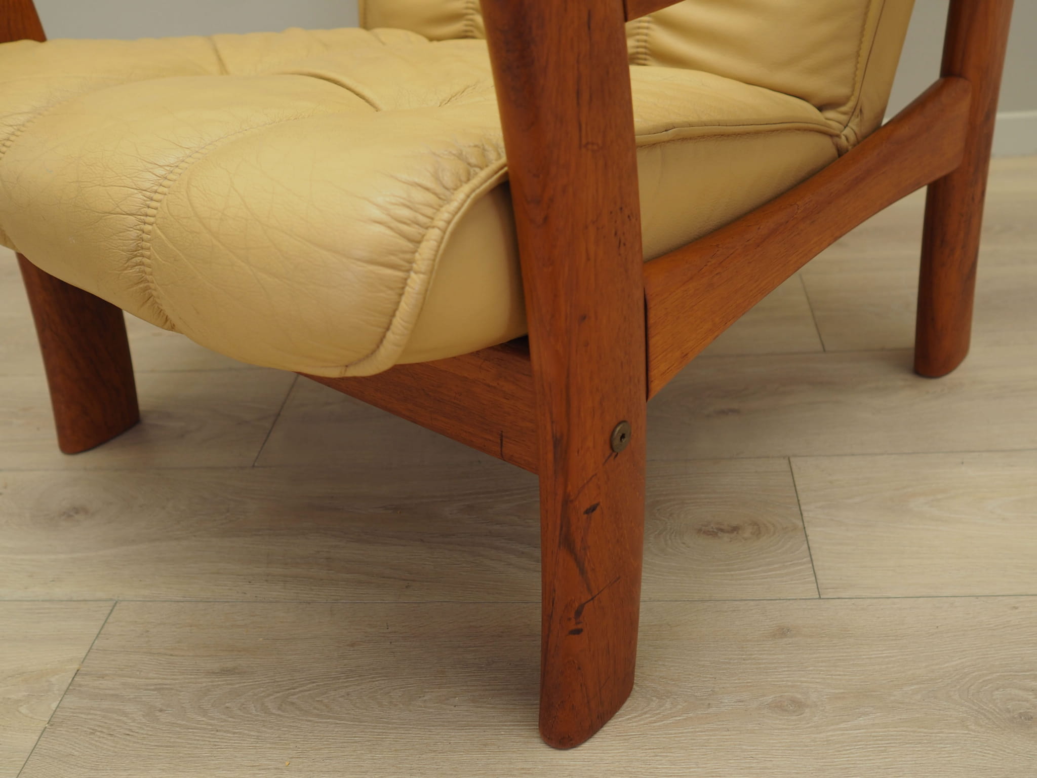 Konstrukcja została wykonana z drewna tekowego. Fotel pokryty jest oryginalną wysokiej jakości skórą naturalną. Skóra została wykonana w kolorze żółtym.