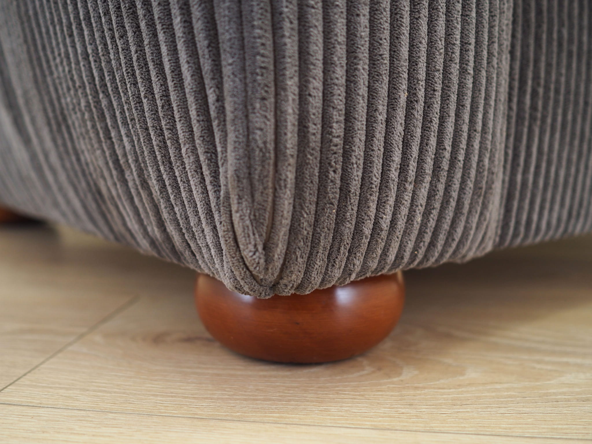 Nogi wykonane z litego drewna. Fotel został poddany renowacji tapicerskiej, tkanina wymieniona na nową. Tapicerka została wykonana w kolorze szarym, wykorzystana została wysokogatunkowa tkanina welurowa.