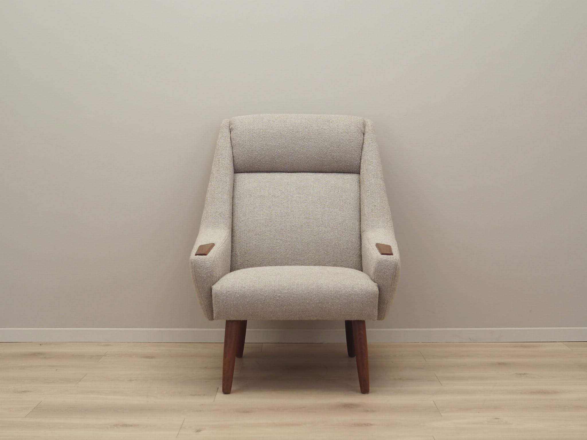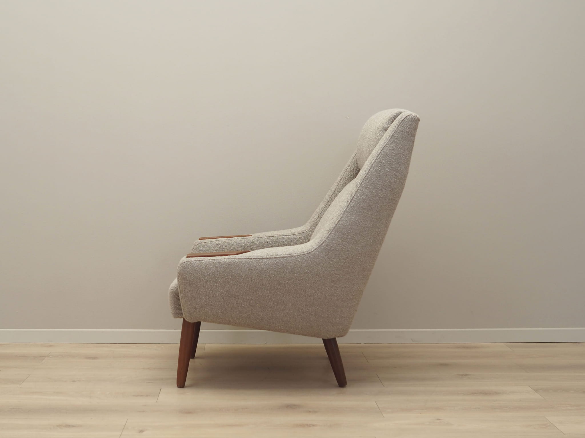 Konstrukcja wykonana jest z drewna tekowego. Drewno po odświeżeniu. Fotel został poddany renowacji tapicerskiej, gąbki oraz tkanina wymienione na nowe. Do renowacji użyto tkaniny bardzo wysokiej jakości o przędzy boucle. Tkanina posiada wysoką ścieralność - 50 000 cykli Martindale’a. Natomiast technologia łatwego czyszczenia zagwarantuje nam komfort użytkowania oraz czysty i atrakcyjny mebel przez lata.