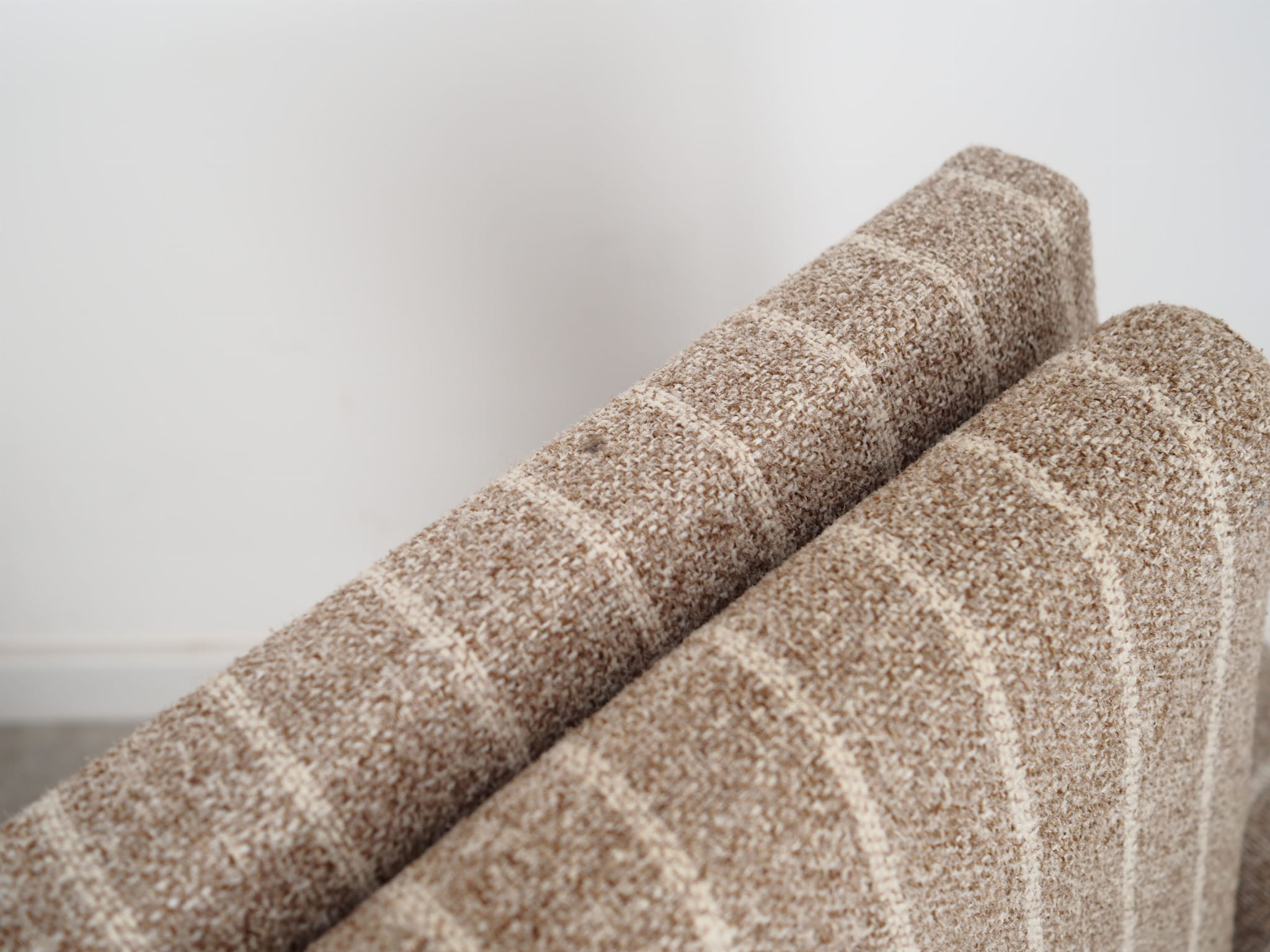 Konstrukcja wykonana jest z drewna tekowego. Drewno po odświeżeniu. Zachowano oryginalną tapicerkę. Tapicerka została wykonana w kolorze beżowym, wykorzystana została wysokogatunkowa tkanina o wyraźnym splocie.