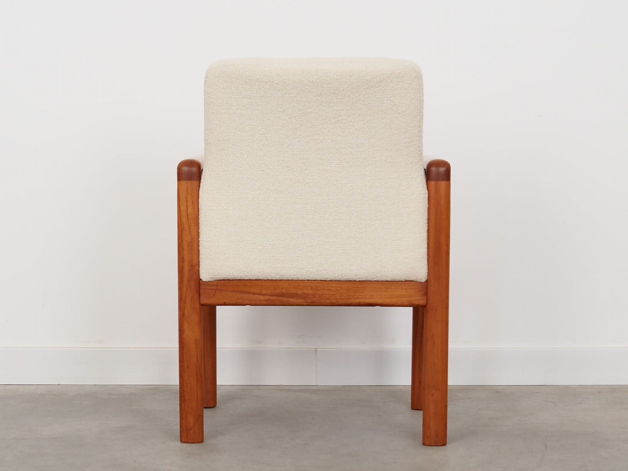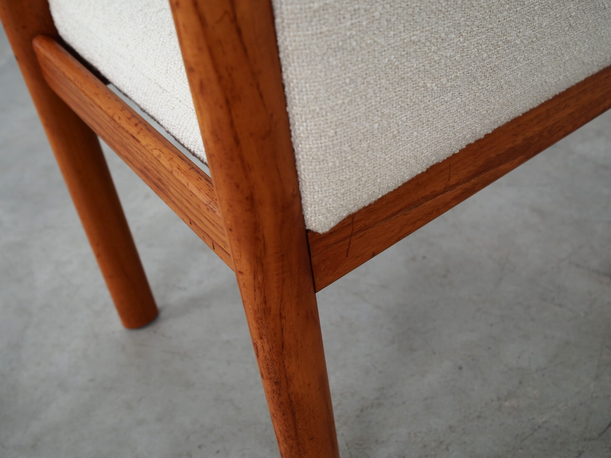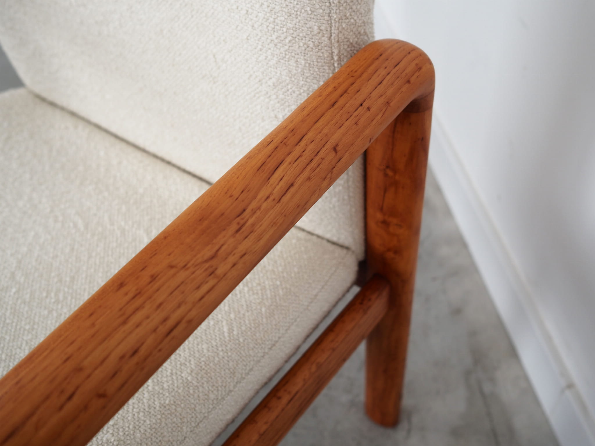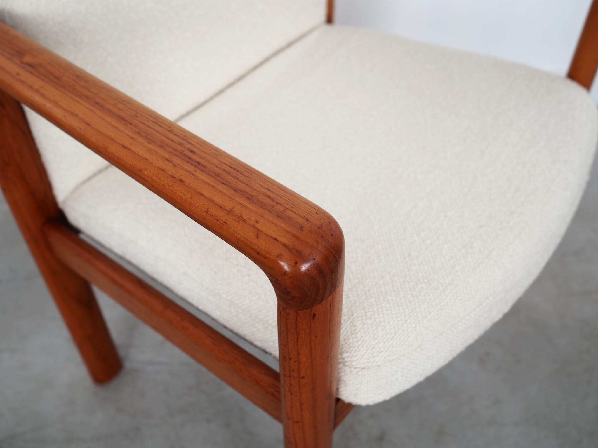 Konstrukcja wykonana jest z drewna tekowego. Drewno po odświeżeniu. Fotel został poddany renowacji tapicerskiej, gąbki oraz tkanina wymienione na nowe. Do renowacji użyto tkaniny bardzo wysokiej jakości o przędzy boucle. Tkanina posiada wysoką ścieralność - 50 000 cykli Martindale’a. Natomiast technologia łatwego czyszczenia zagwarantuje nam komfort użytkowania oraz czysty i atrakcyjny mebel przez lata.