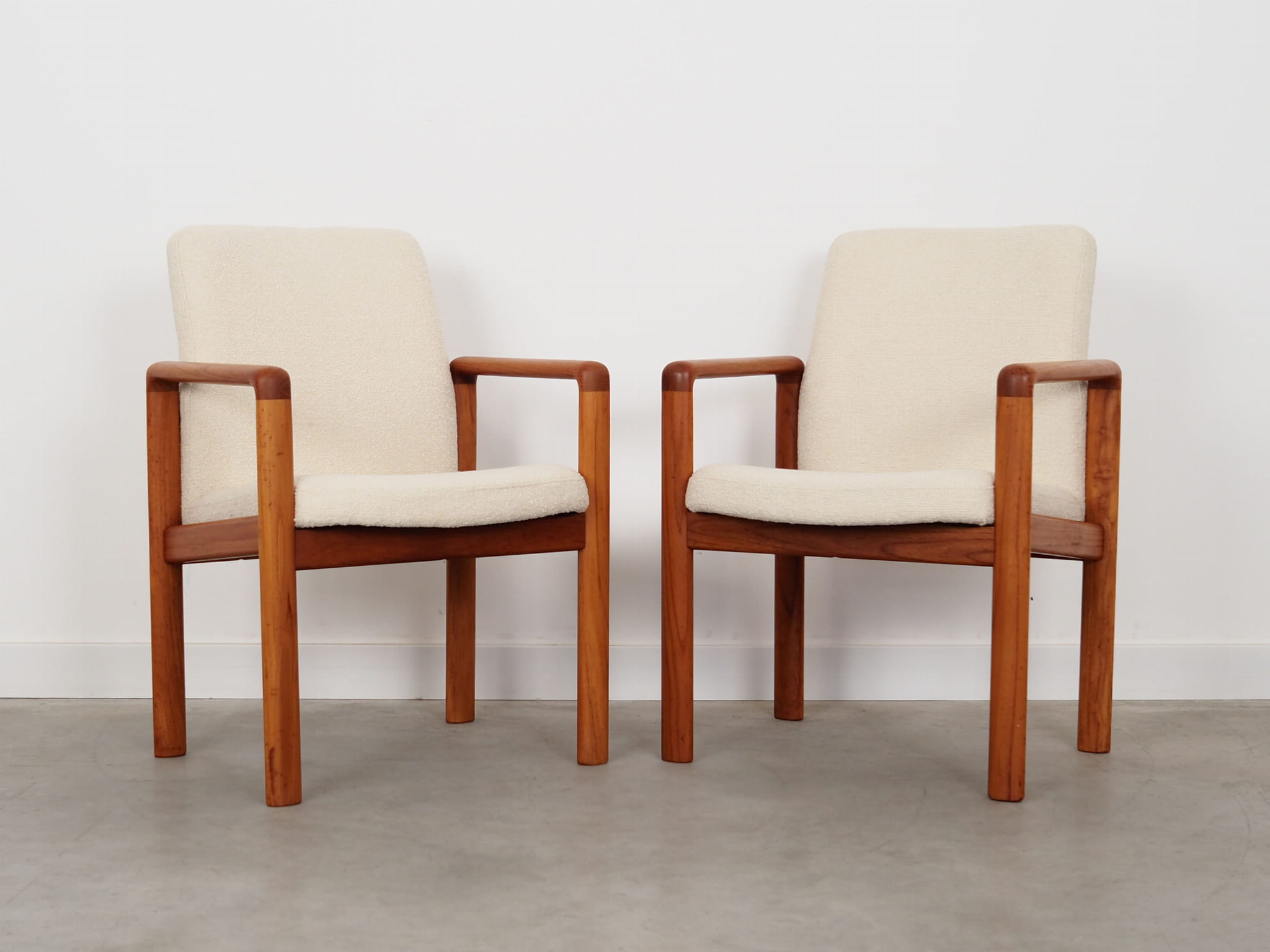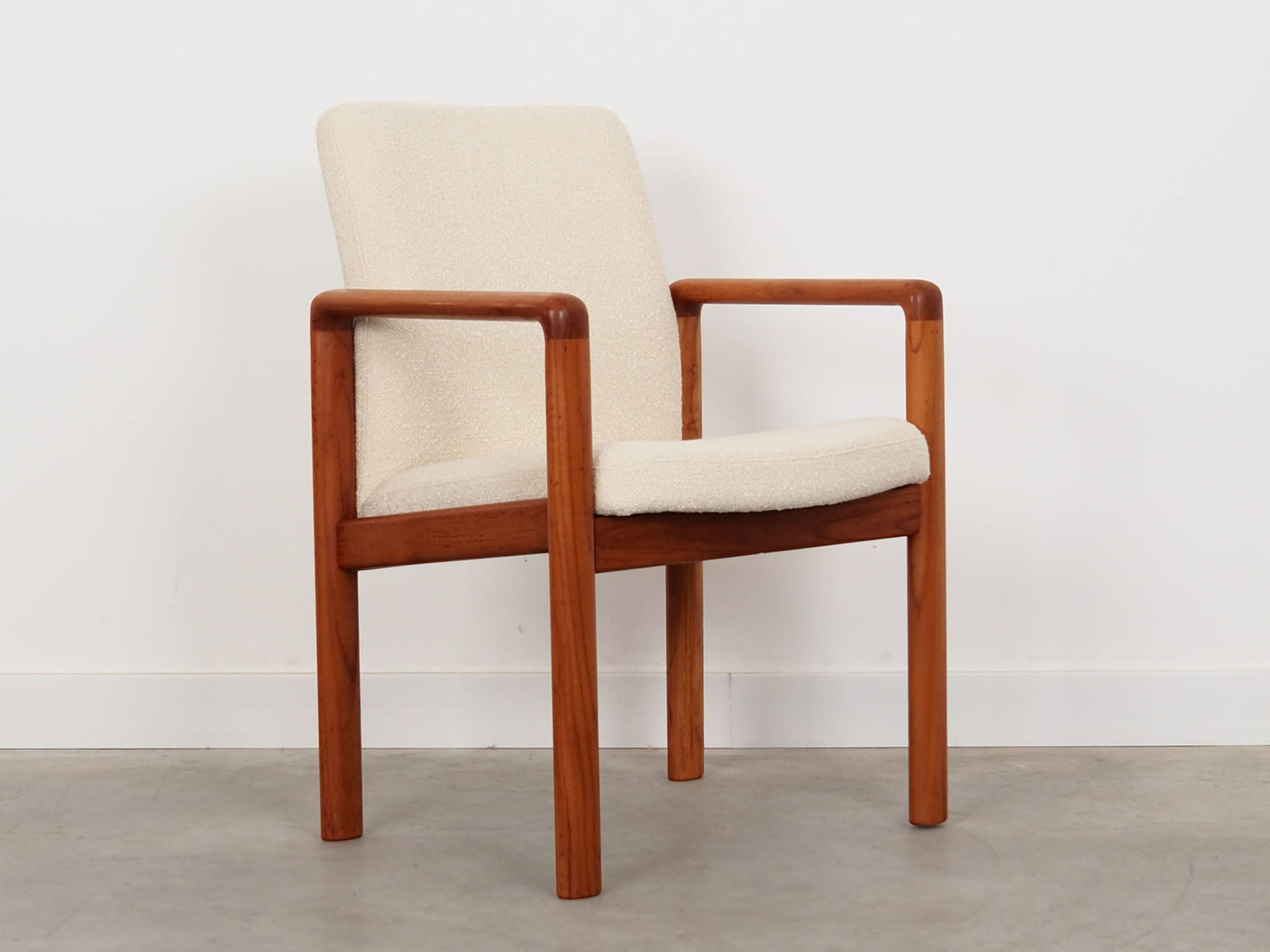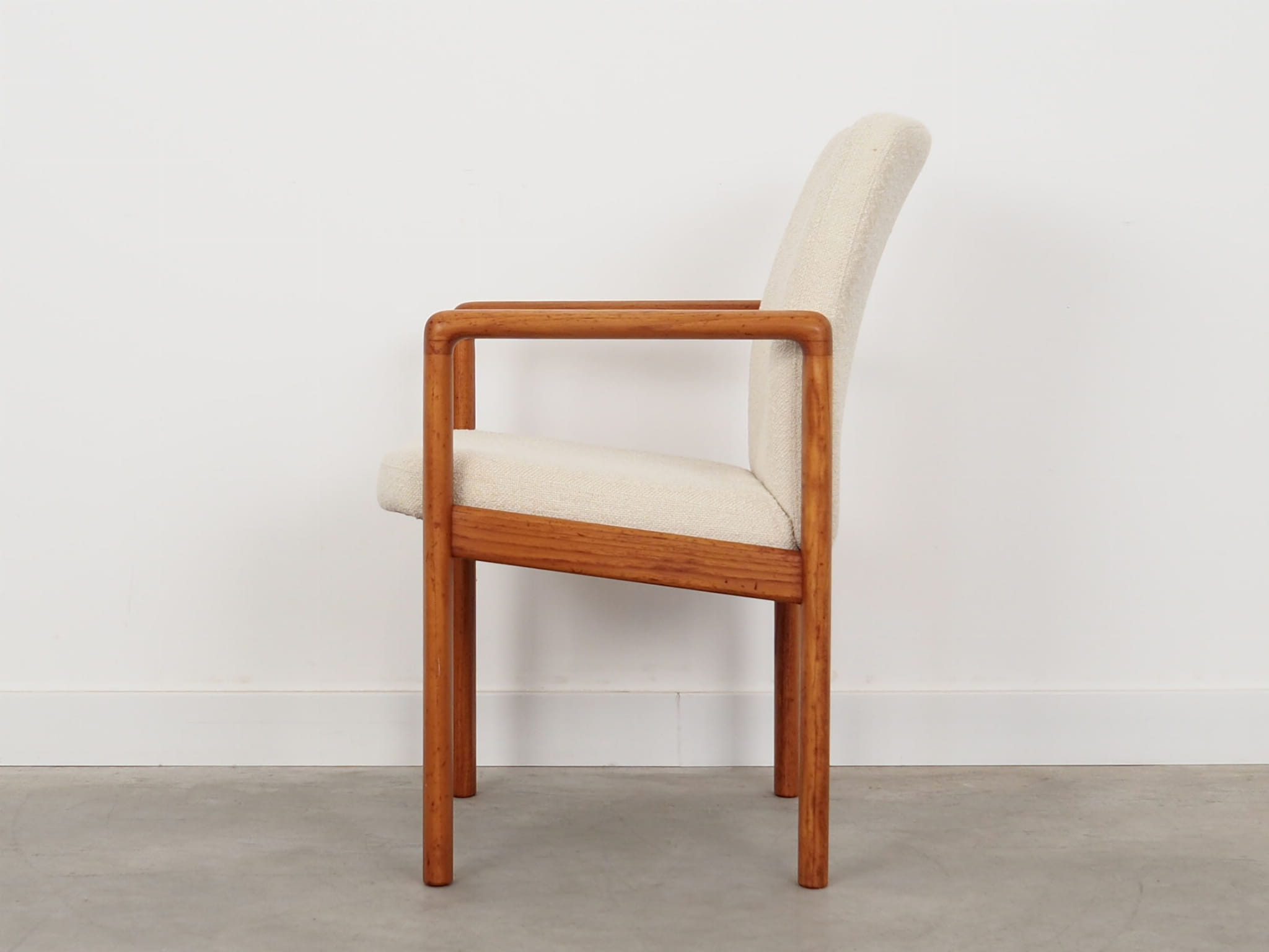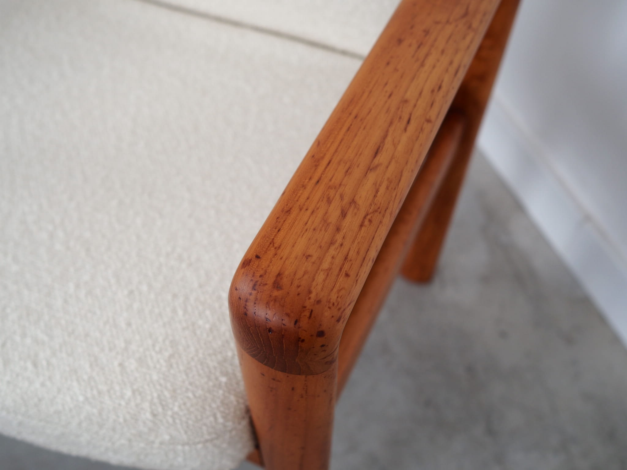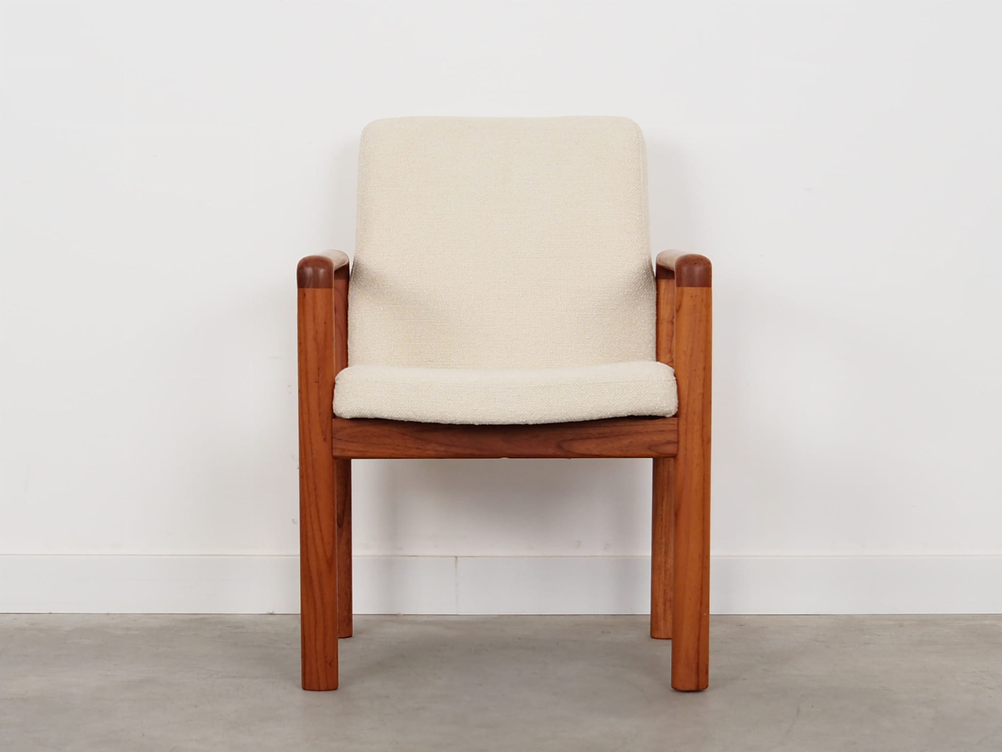 Konstrukcja wykonana jest z drewna tekowego. Drewno po odświeżeniu. Fotel został poddany renowacji tapicerskiej, gąbki oraz tkanina wymienione na nowe. Do renowacji użyto tkaniny bardzo wysokiej jakości o przędzy boucle. Tkanina posiada wysoką ścieralność - 50 000 cykli Martindale’a. Natomiast technologia łatwego czyszczenia zagwarantuje nam komfort użytkowania oraz czysty i atrakcyjny mebel przez lata.