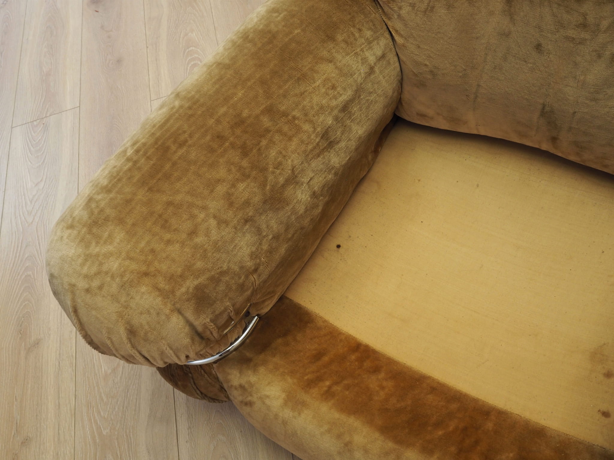 Fotel pokryty jest oryginalną, wysokiej jakości tkaniną welurową w kolorze beżowym. W naszej ofercie dostępny jest również drugi, identyczny fotel - razem stworzą niepowtarzalny zestaw.