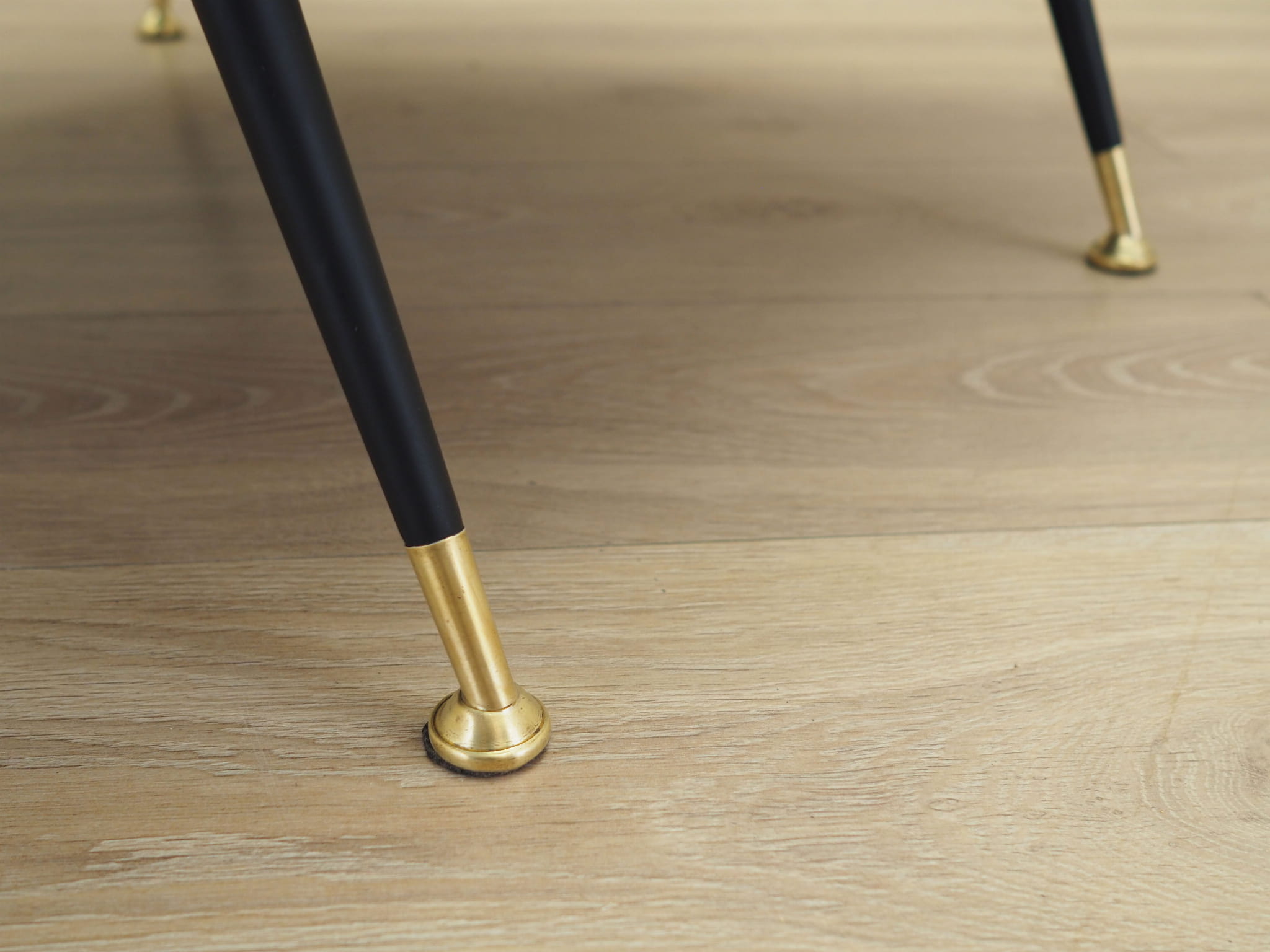 Nogi wykonane z metalu. Fotel został poddany renowacji tapicerskiej, tkanina wymieniona na nową. Tapicerka została wykonana w kolorze zielonym, wykorzystana została wysokogatunkowa tkanina melanżowa.