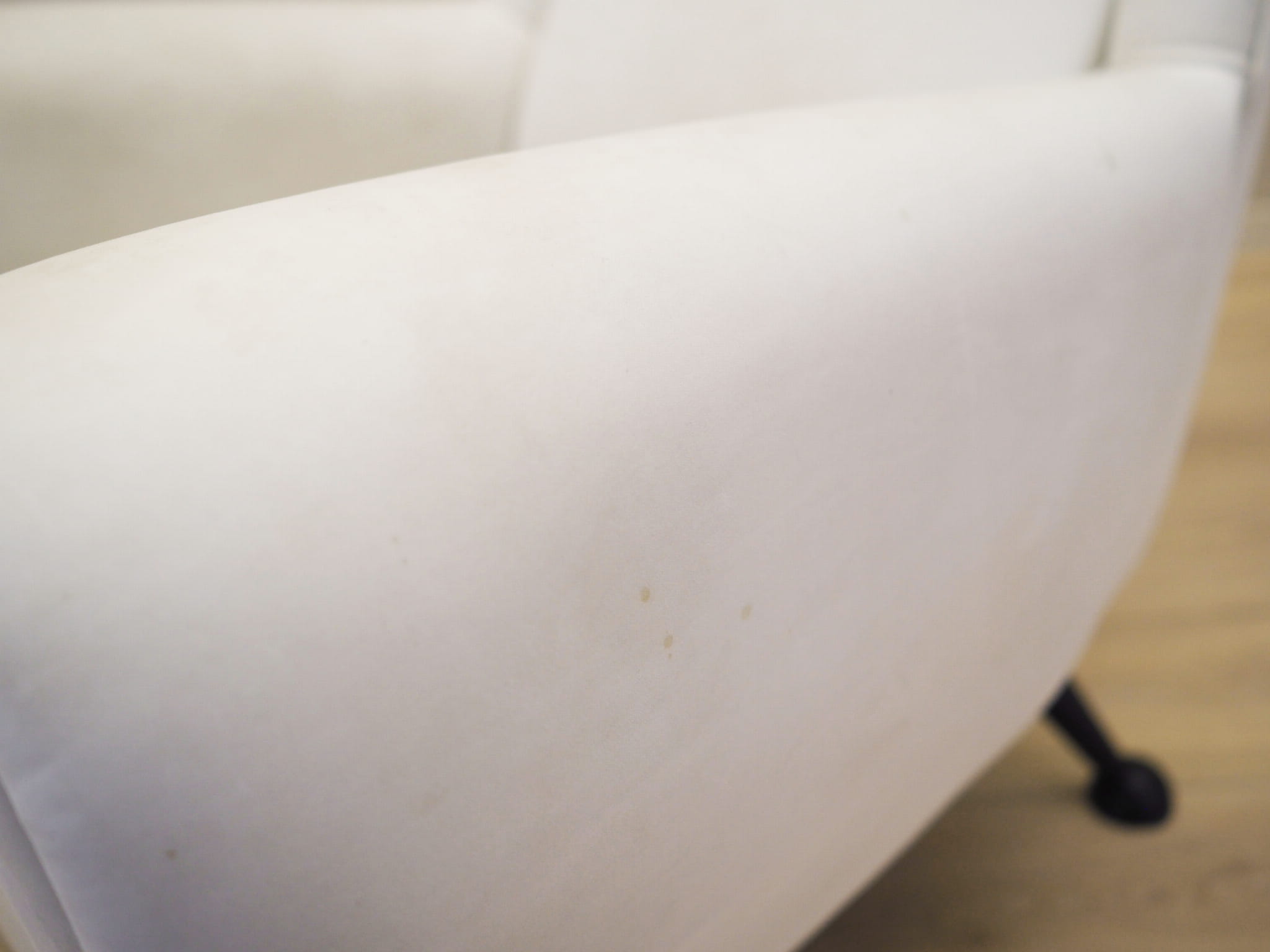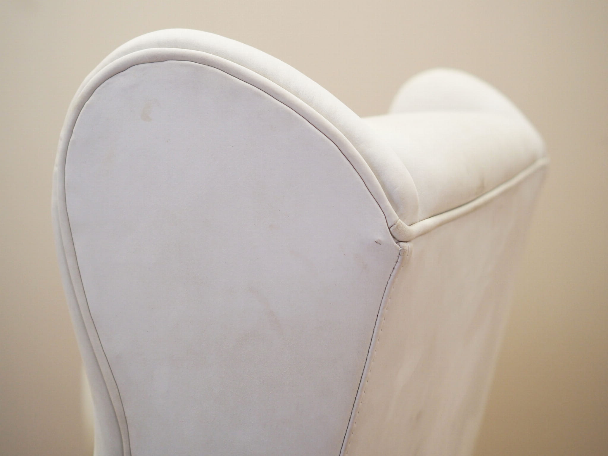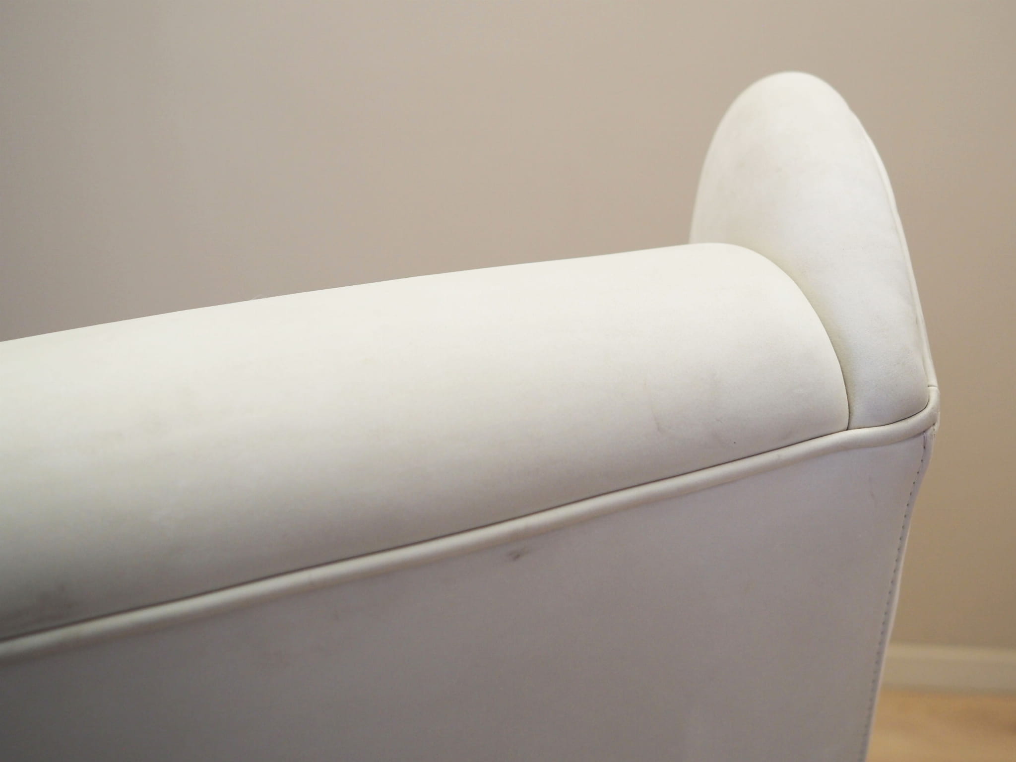 Nogi wykonane z metalu. Fotel pokryty jest oryginalną, wysokiej jakości skórą anilinową w kolorze białym. W naszej ofercie dostępny jest również drugi, identyczny fotel - razem stworzą niepowtarzalny zestaw.