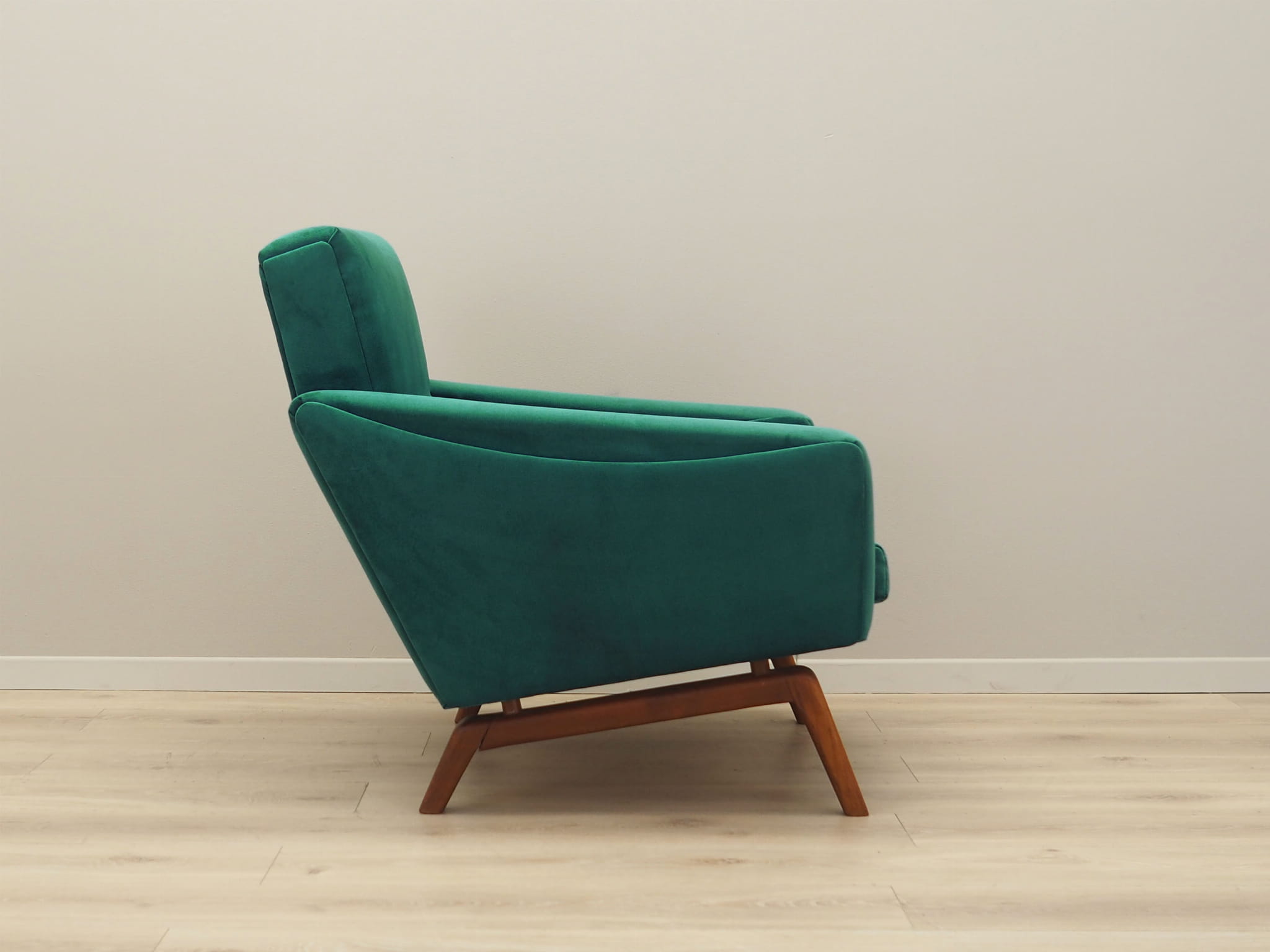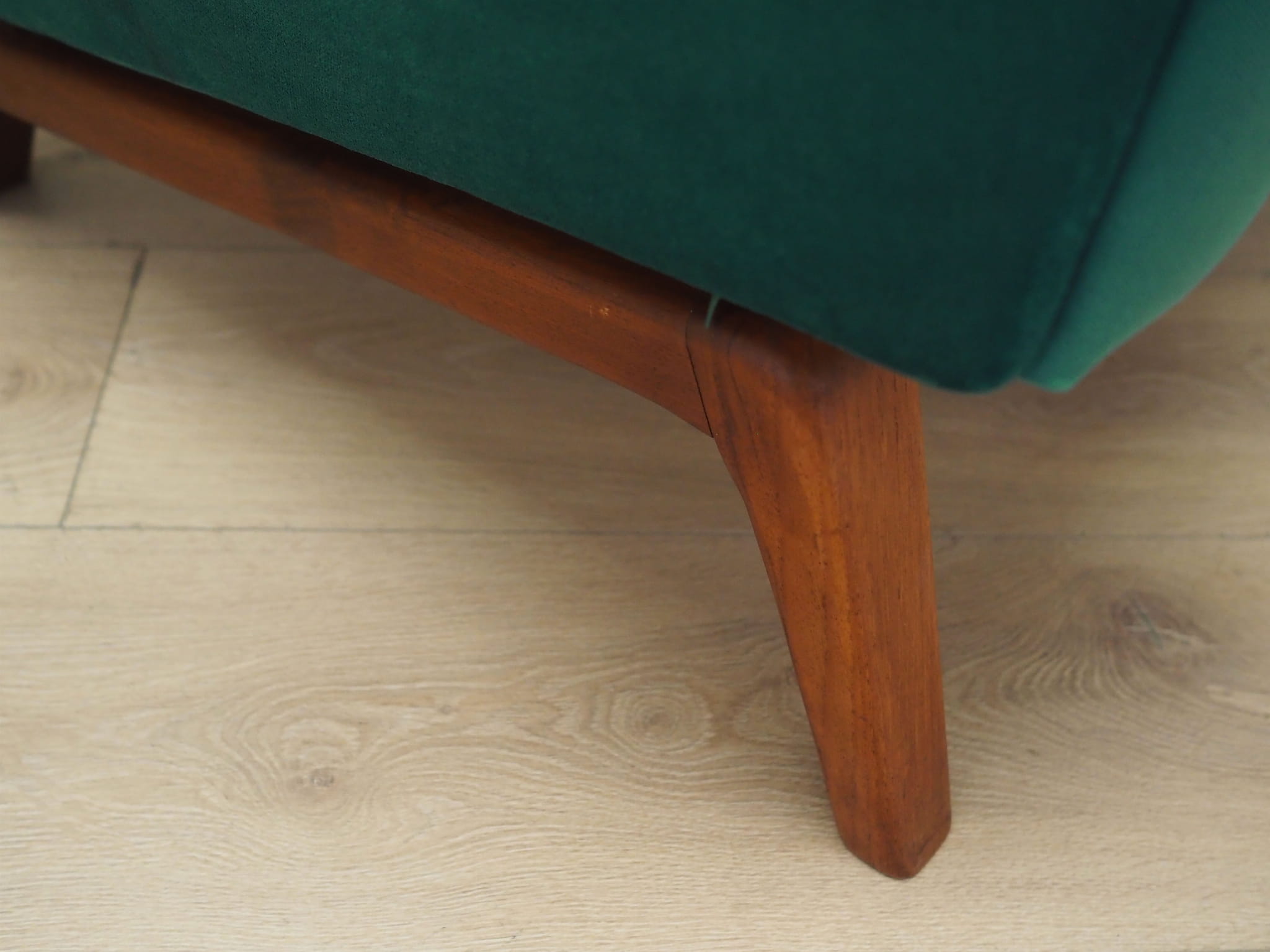 Konstrukcja wykonana jest z litego drewna. Drewno po odświeżeniu. Fotel został poddany renowacji tapicerskiej, tkanina wymieniona na nową. Tapicerka została wykonana w kolorze butelkowej zieleni, wykorzystana została wysokogatunkowa tkanina welurowa.