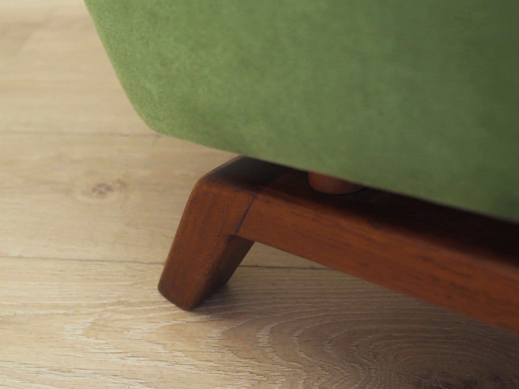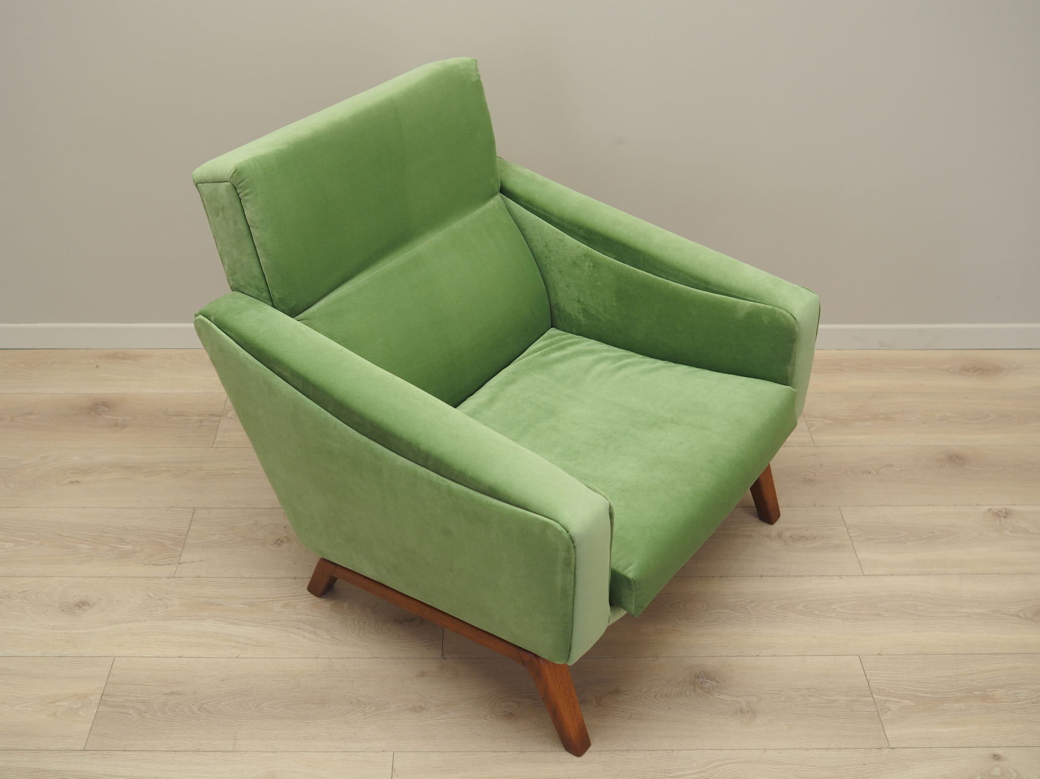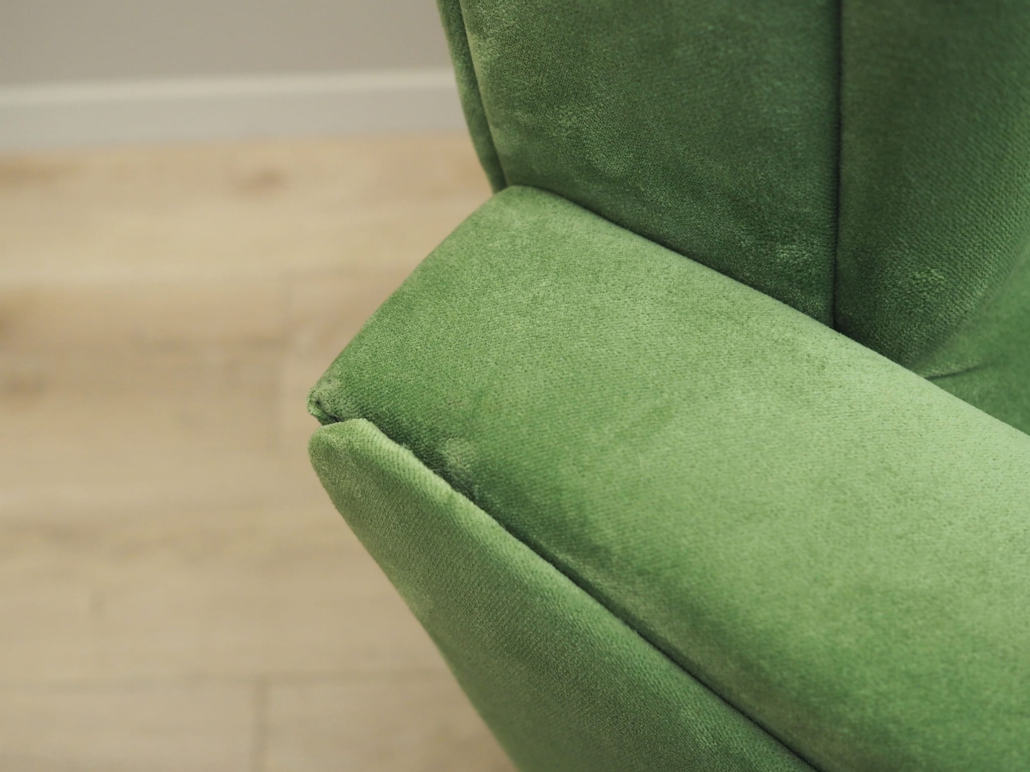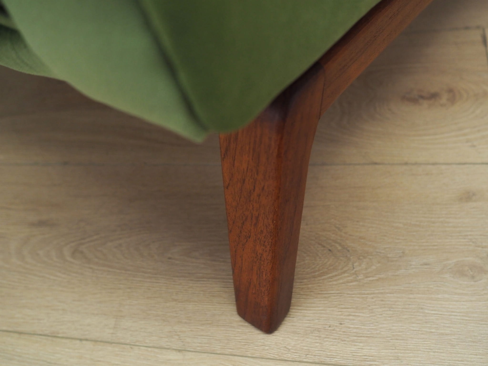 Konstrukcja wykonana jest z litego drewna. Drewno po odświeżeniu. Fotel został poddany renowacji tapicerskiej, tkanina wymieniona na nową. Tapicerka została wykonana w kolorze zielonym, wykorzystana została wysokogatunkowa tkanina welurowa.