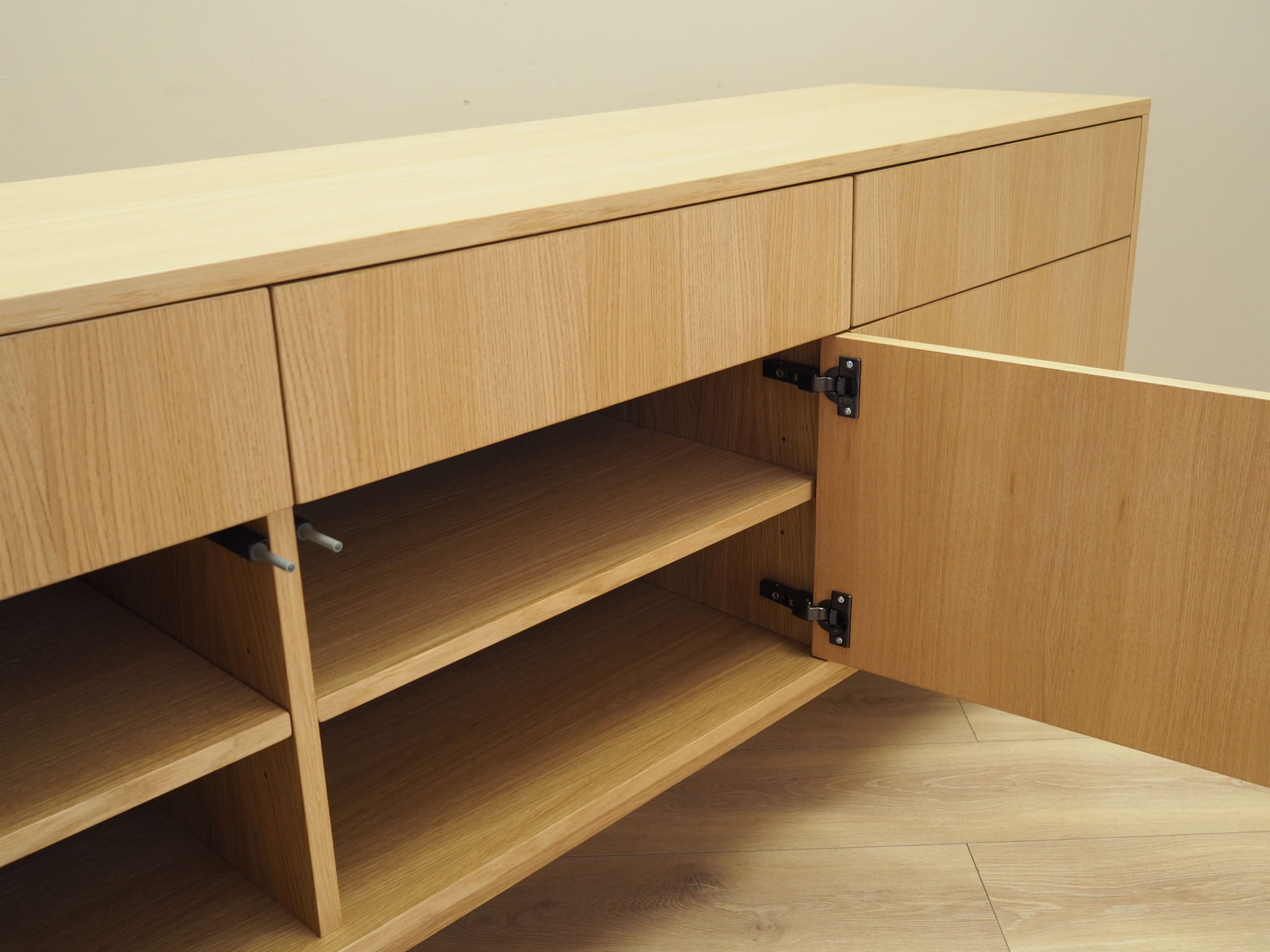 Konstrukcja pokryta jest fornirem dębowym. Nogi wykonane z litego drewna. Powierzchnia po odświeżeniu. Wewnątrz przestrzeń została wypełniona trzema pojemnymi szufladami oraz trzema regulowanymi półkami. Mebel posiada wygodne rozwiązanie drzwi otwieranych, dzięki czemu mamy nieograniczony dostęp do jego wnętrza.