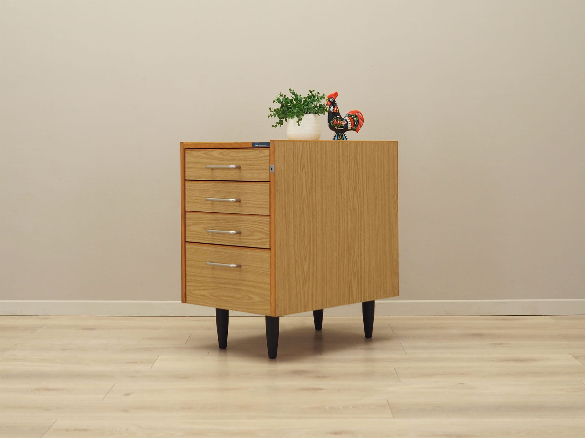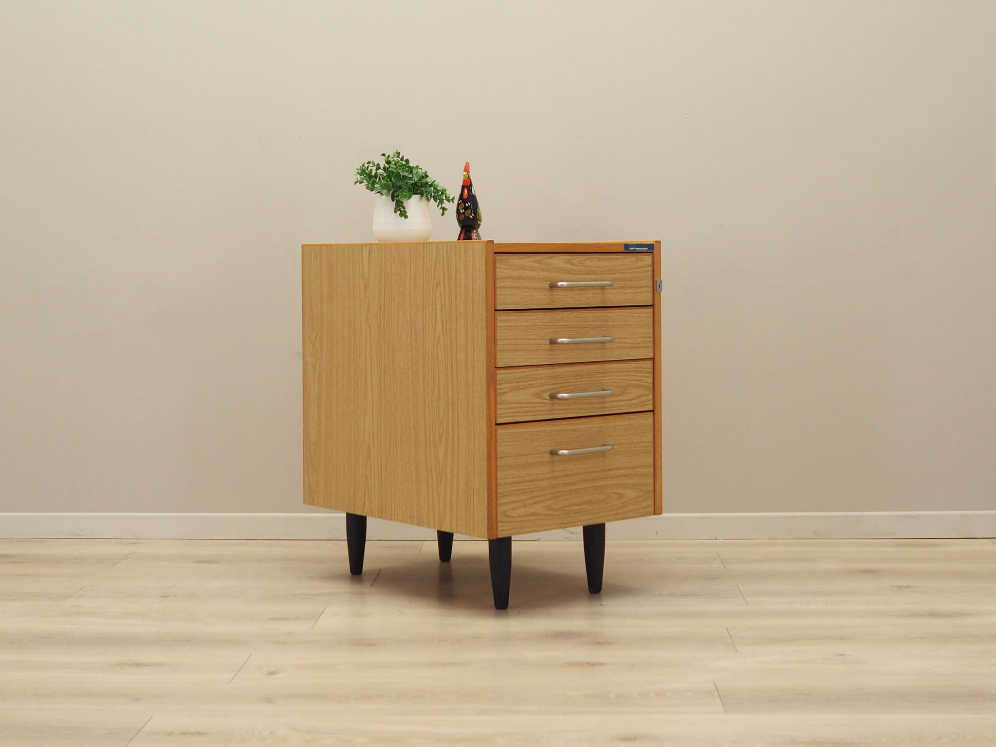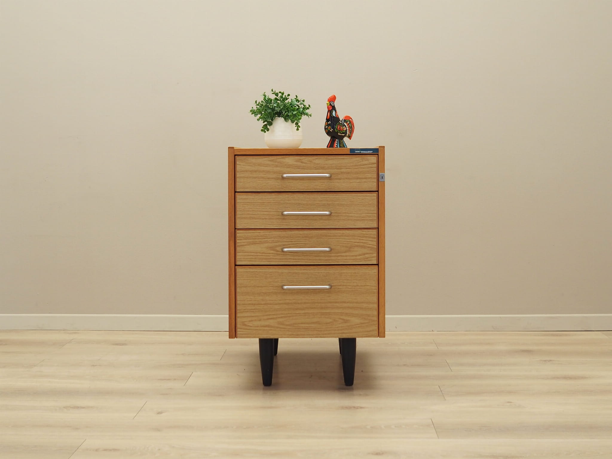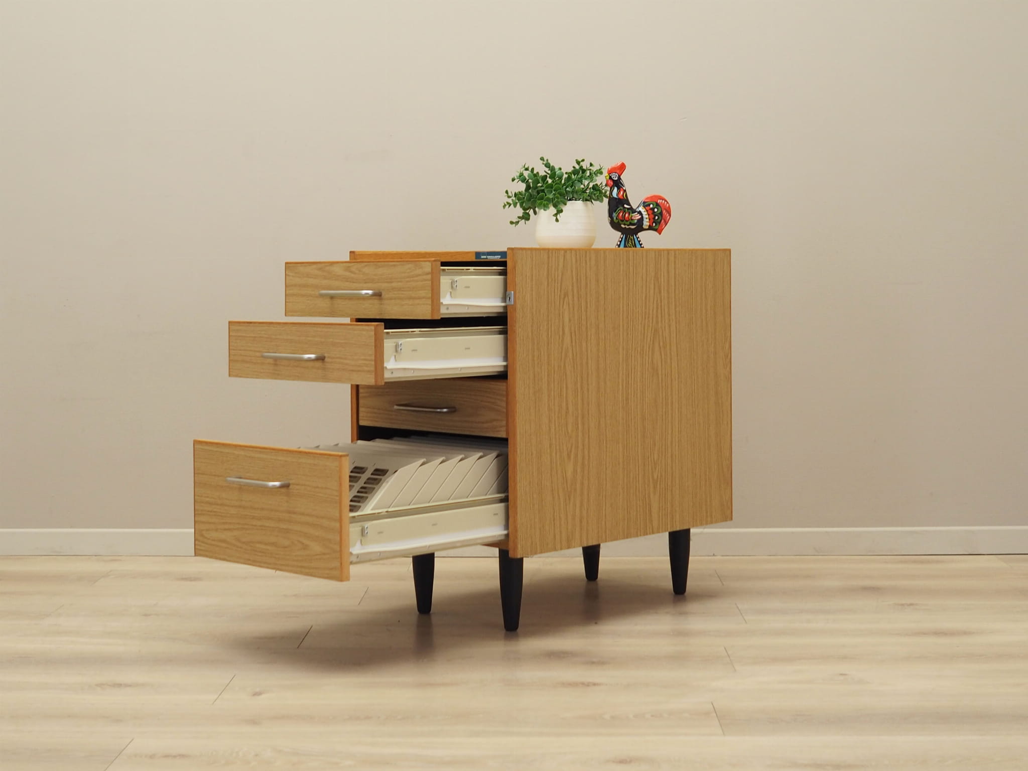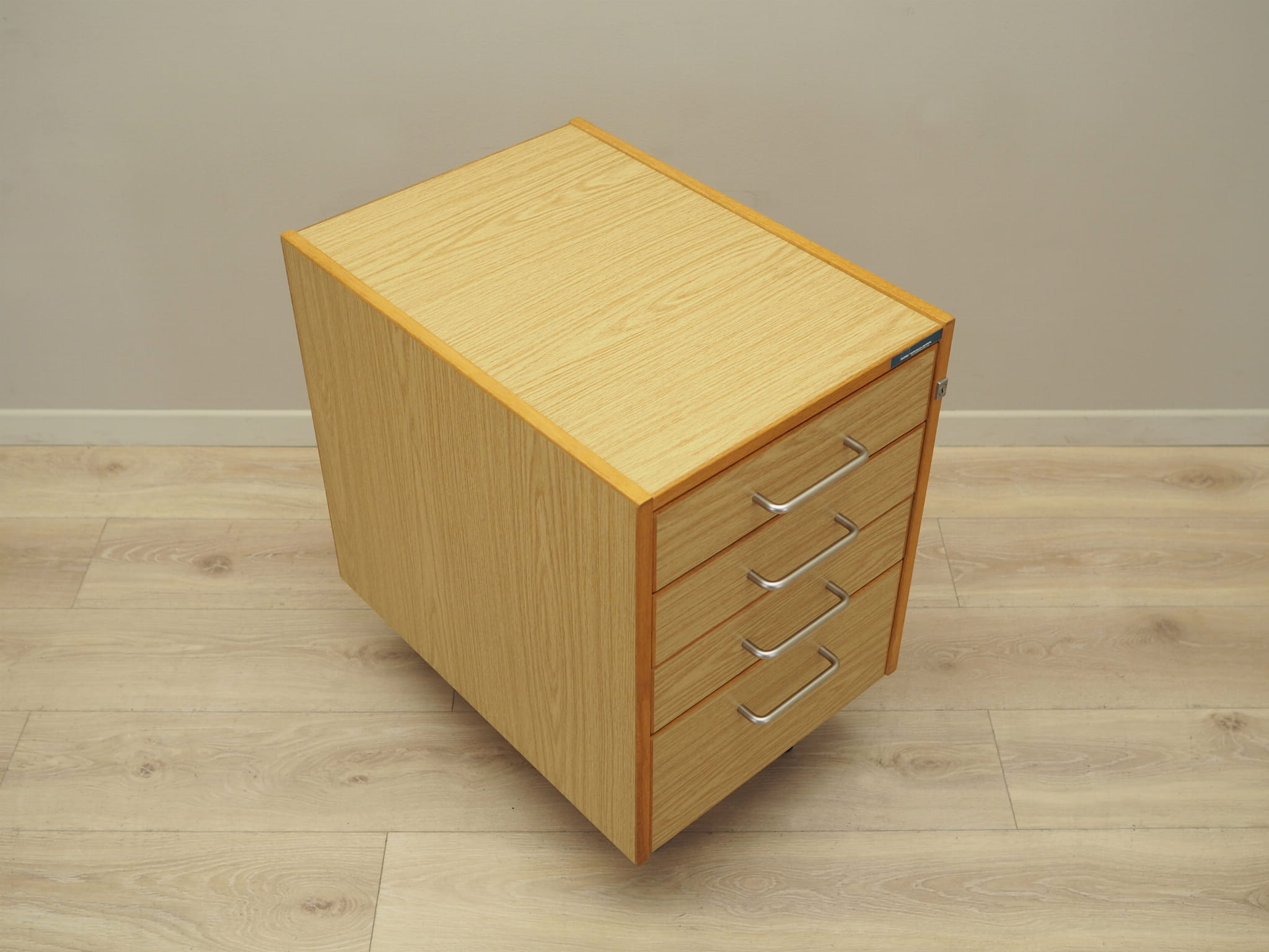 Konstrukcja pokryta jest laminatem. Uchwyty wykonane z metalu. Powierzchnia po odświeżeniu. Komoda to klasyczna szufladówka idealna do każdej przestrzeni. Dzięki czterem praktycznym szufladom spełni idealnie swoją rolę jako szafka na dokumenty. Szuflady posiadają przegródki oraz kasetki.