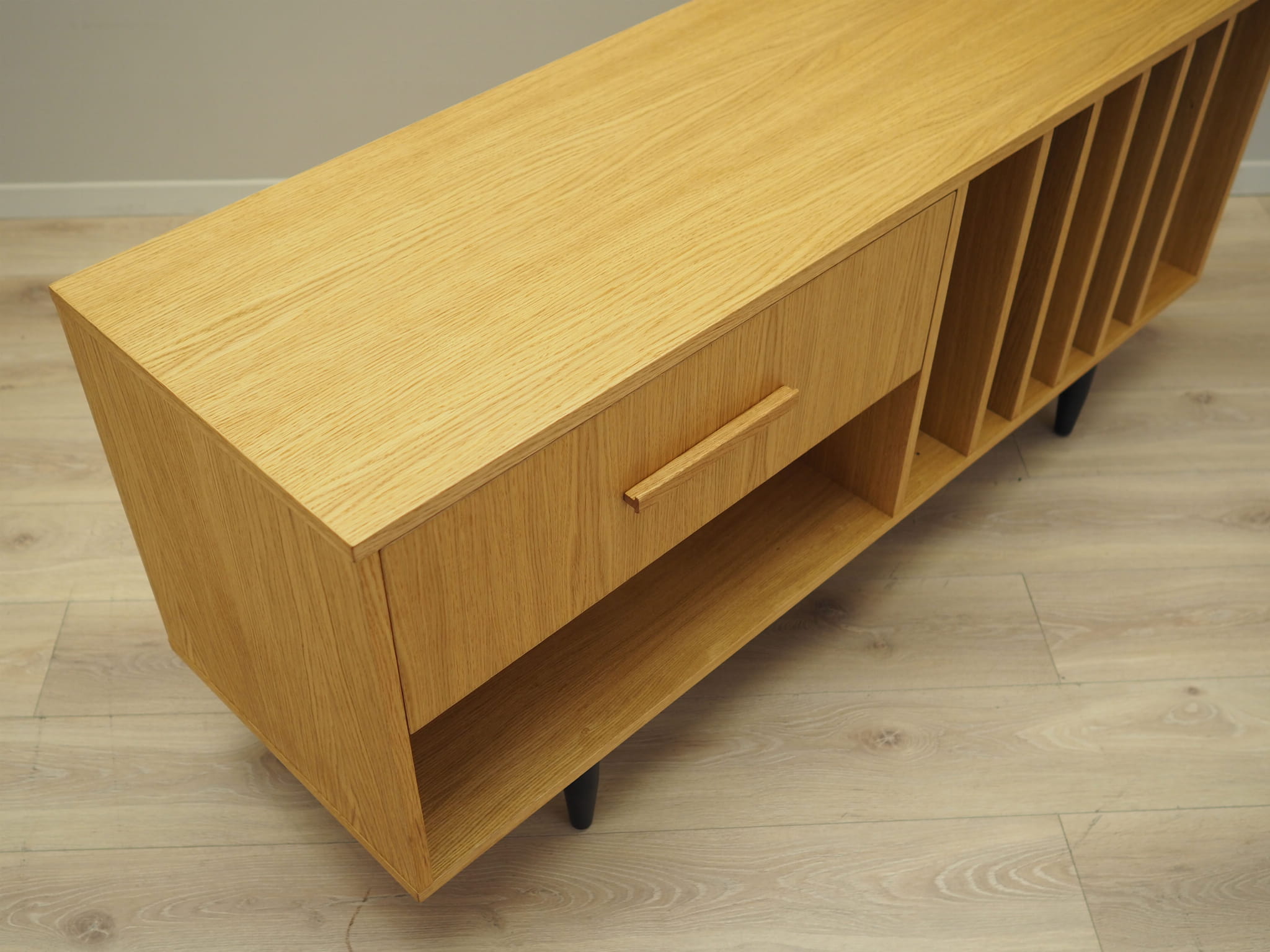 Konstrukcja pokryta jest fornirem dębowym. Nogi zostały wykonane z litego drewna wybarwionego na kolor czarny. Powierzchnia po odświeżeniu. Wewnątrz przestrzeń została wypełniona regulowanymi przegródkami na płyty oraz pojemną szufladą.