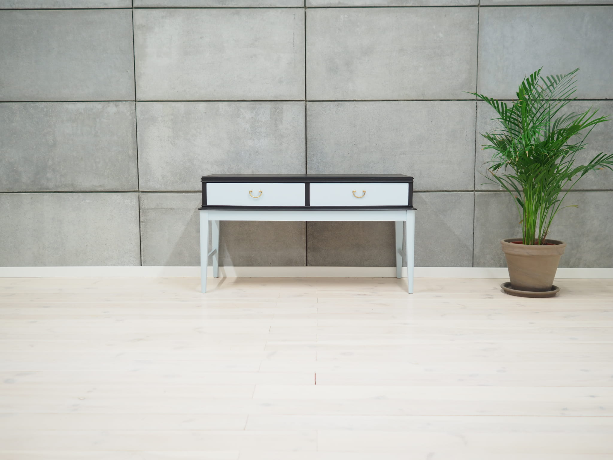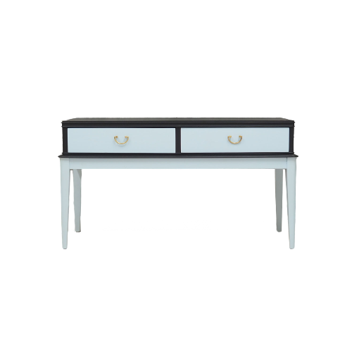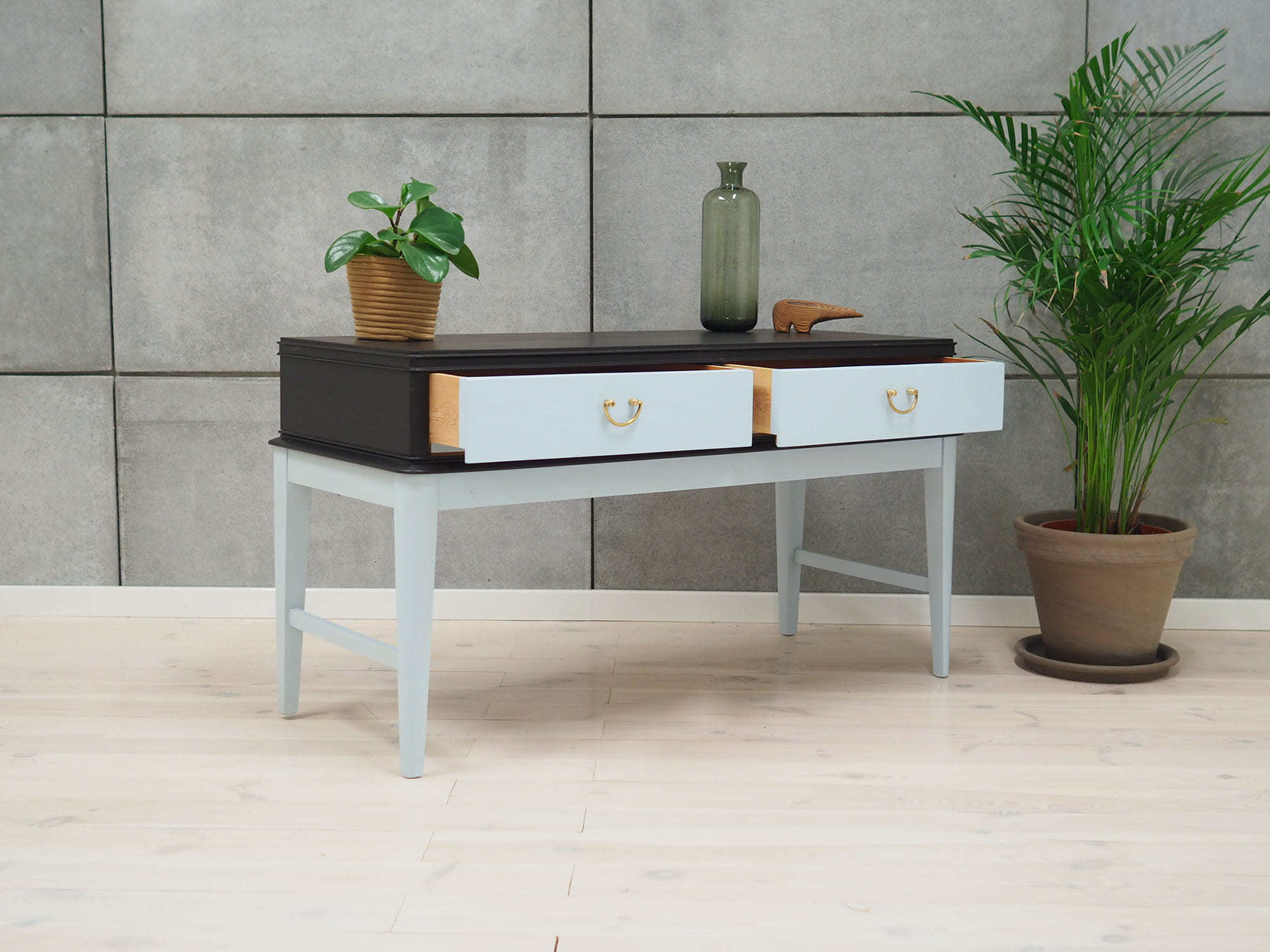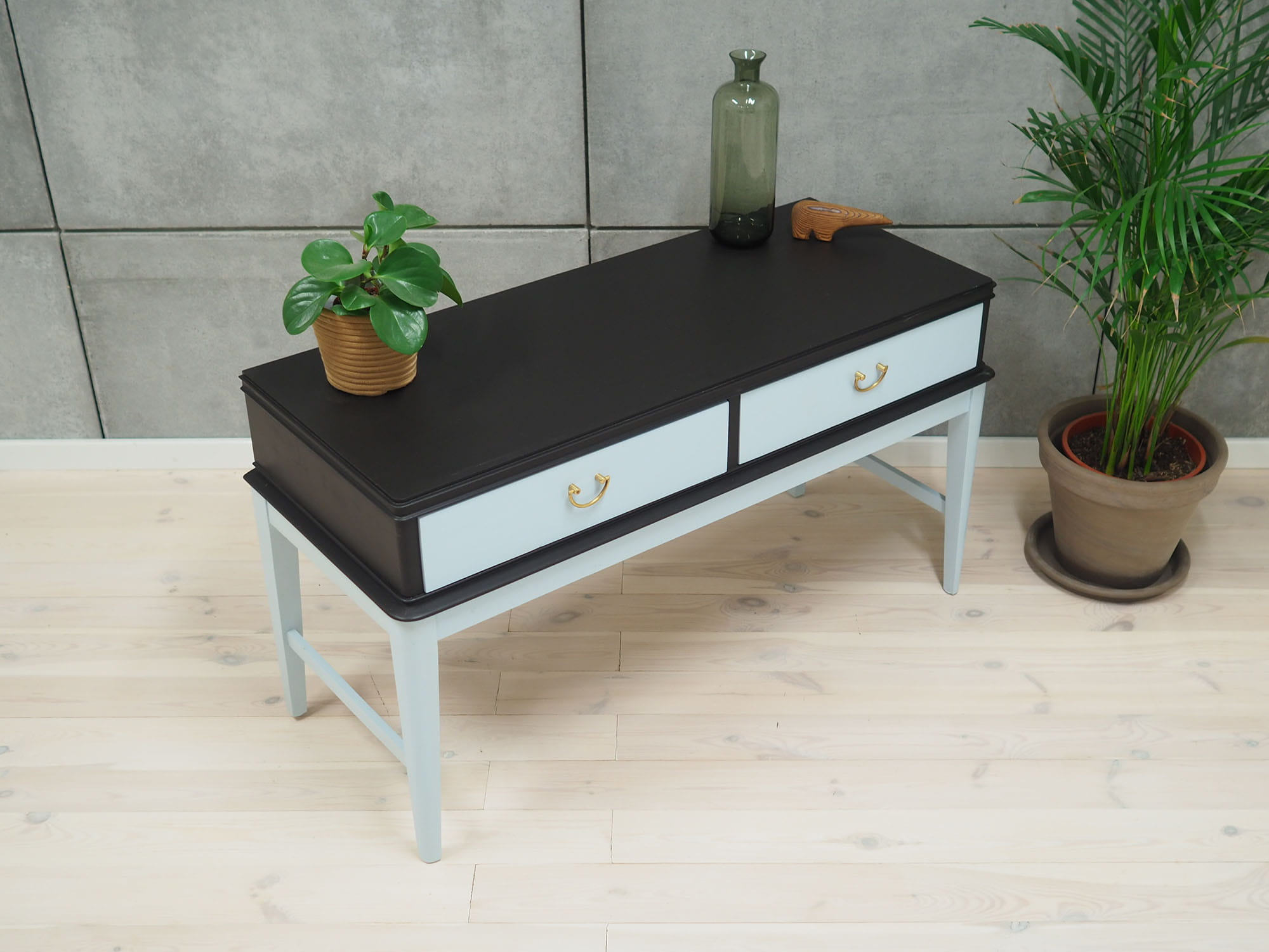 Konstrukcja pokryta jest fornirem orzechowym. Nogi wykonane z litego drewna. Nogi oraz czoła szuflad malowane na kolor błękitny, korpus na kolor czarny. Powierzchnia po odświeżeniu. Komoda posiada praktyczne szuflady z klasycznym rozwiązaniem prowadnic wykonanych z drewna.
