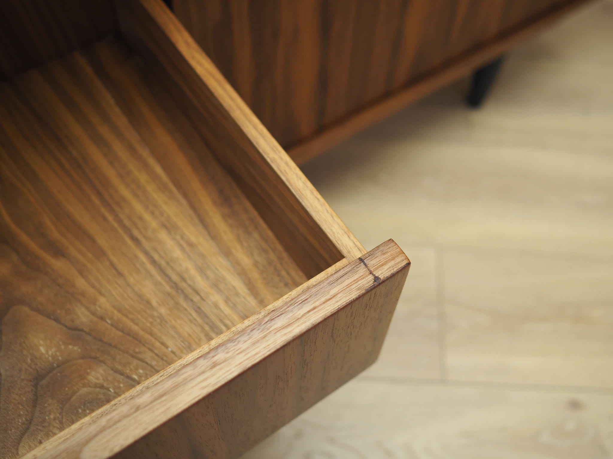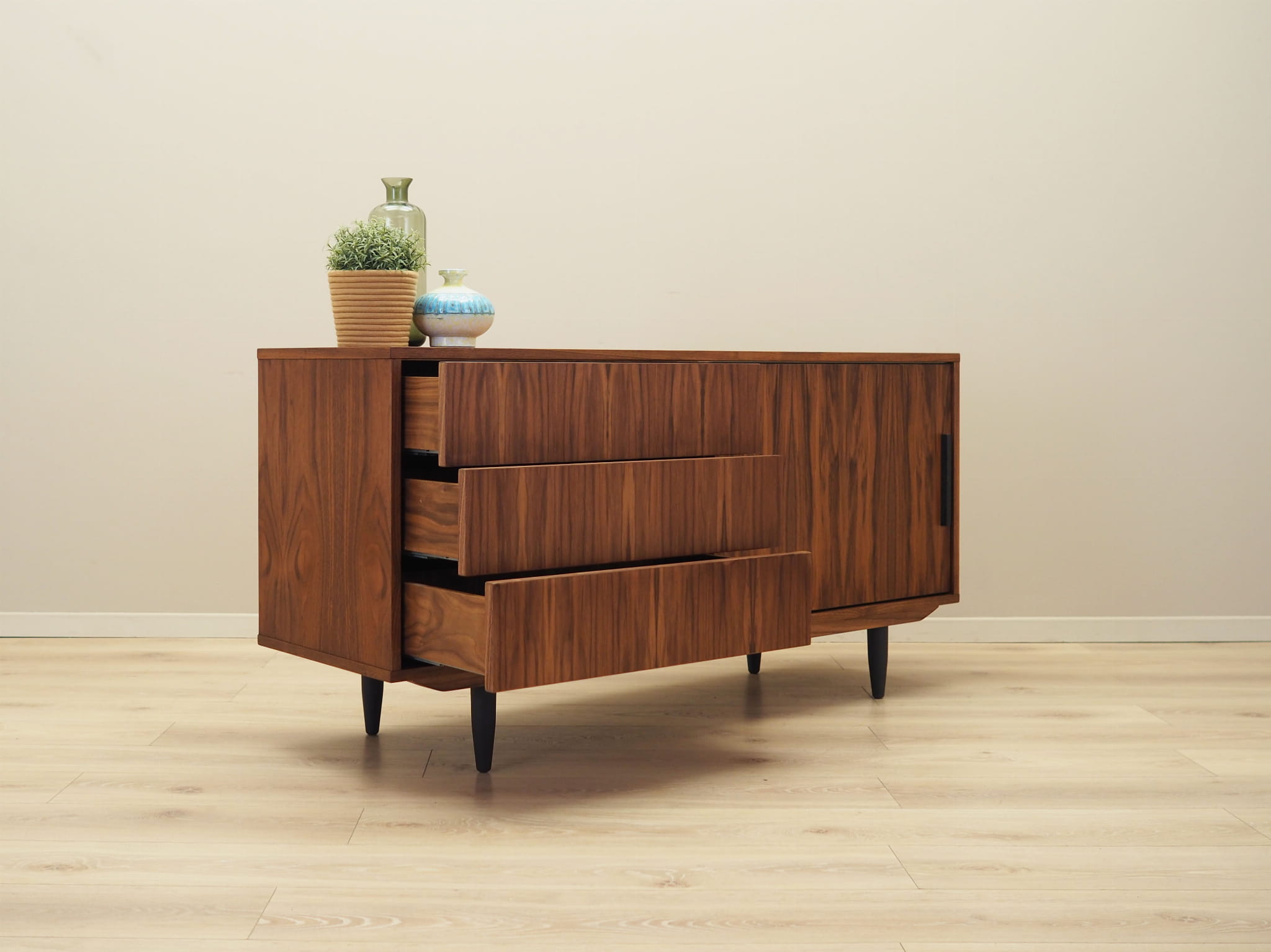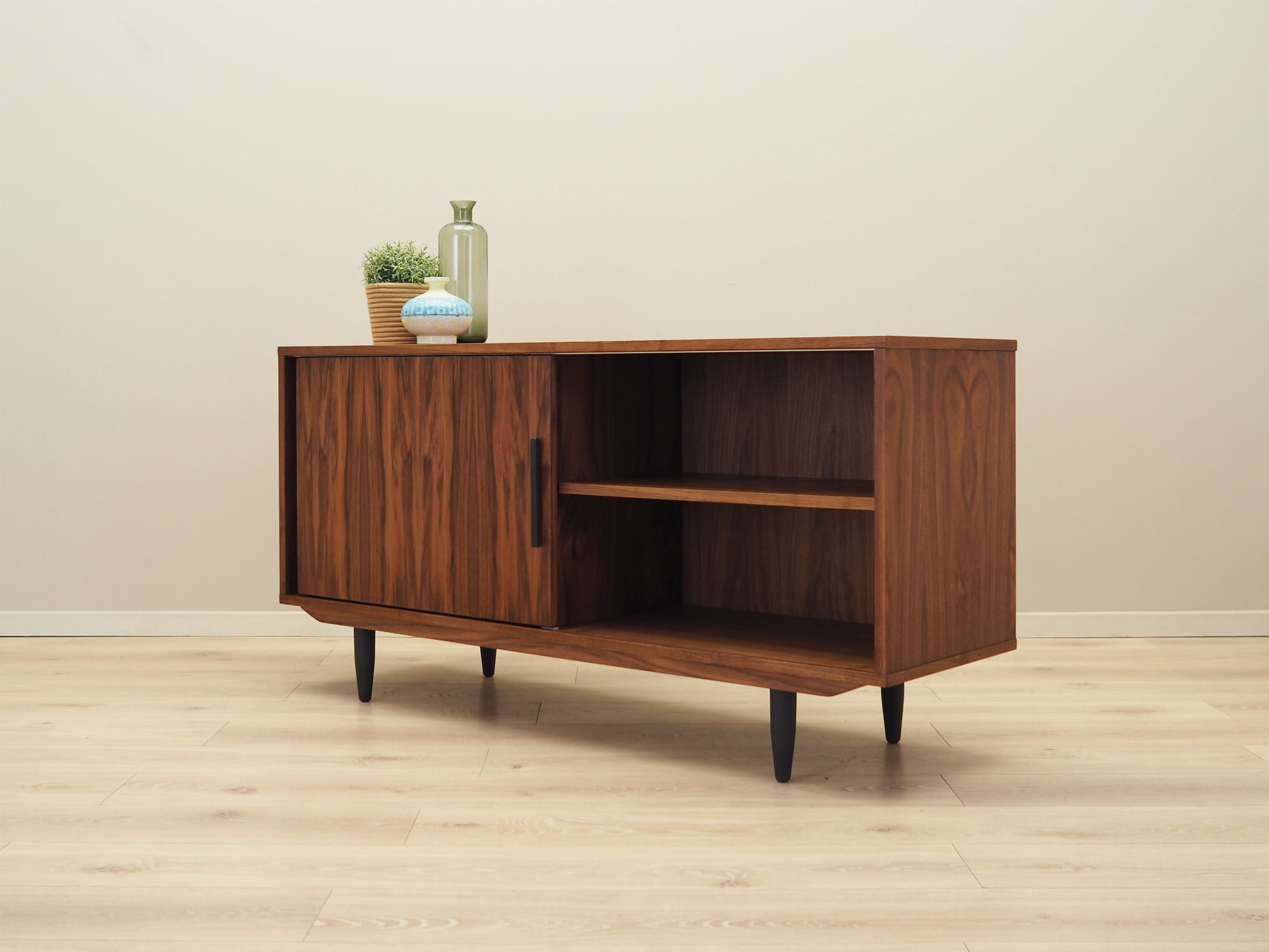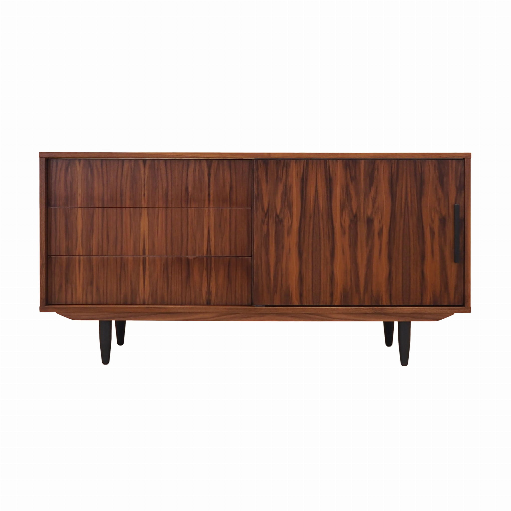 Konstrukcja pokryta jest fornirem orzechowym. Nogi wykonane z litego drewna wybarwionego na kolor czarny. Powierzchnia po odświeżeniu. Wewnątrz przestrzeń została wypełniona trzema pojemnymi szufladami oraz regulowaną półką. Mebel posiada praktyczne rozwiązanie drzwi przesuwnych, dzięki czemu ograniczamy konieczność pozostawienia dużej wolnej przestrzeni przed meblem, jednocześnie nie ograniczając sobie dostępu do wnętrza mebla. Ponadto przesuwne drzwi są idealnym rozwiązaniem, aby wykorzystać mebel pod sprzęt stereo.