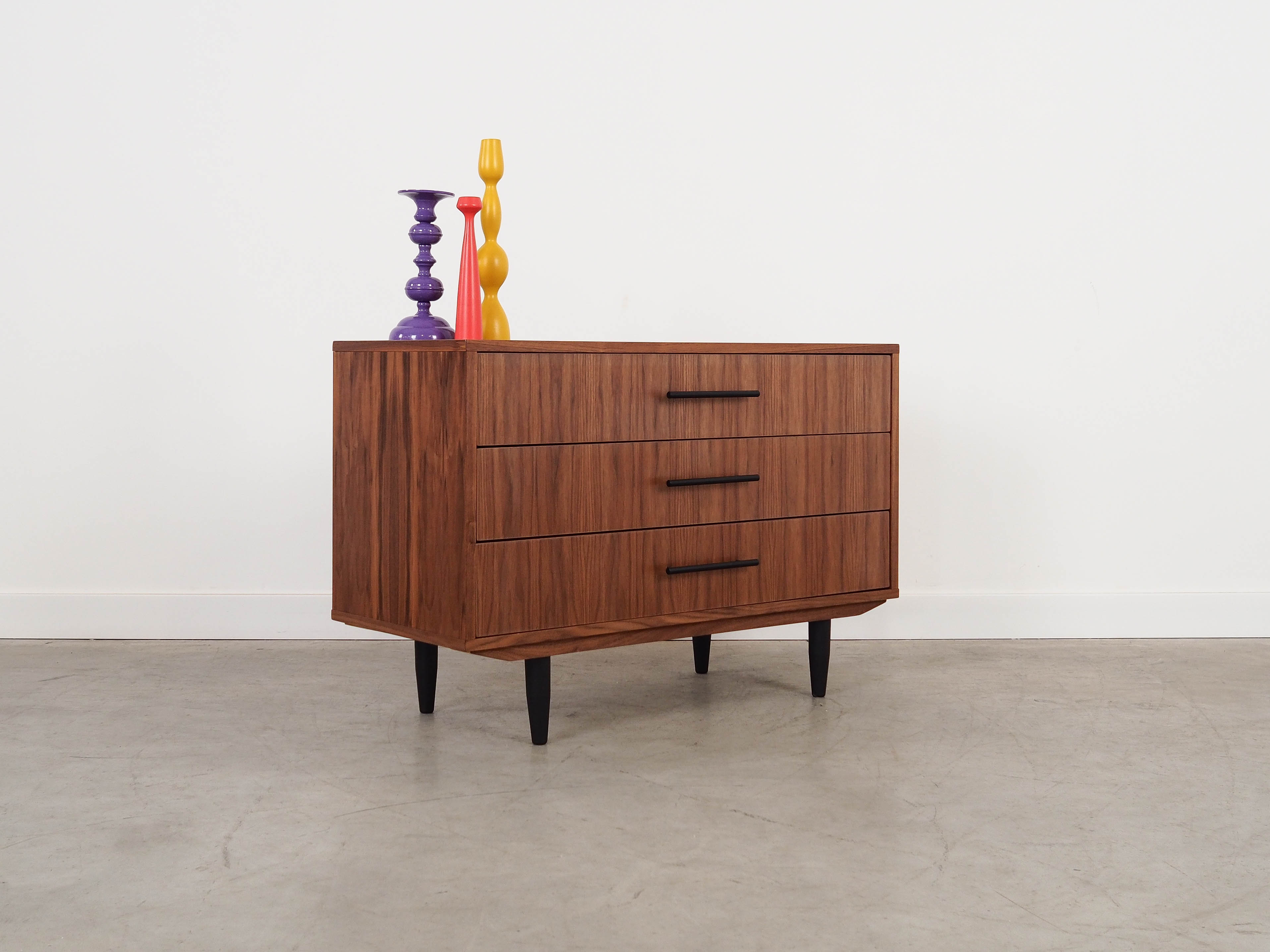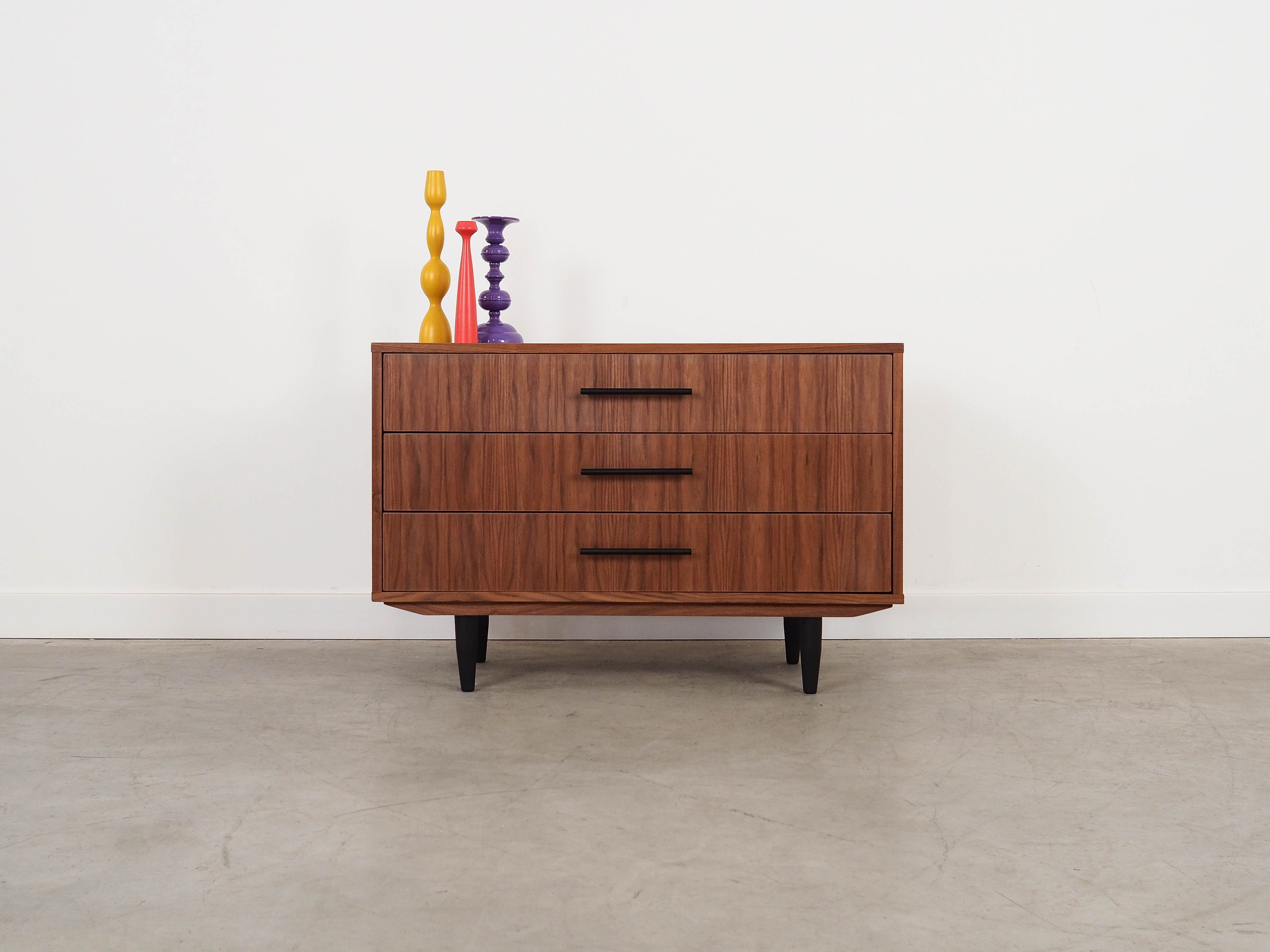 Konstrukcja pokryta jest fornirem orzechowym. Nogi wykonane z litego drewna wybarwionego na kolor czarny. Powierzchnia po odświeżeniu. Komoda to klasyczna szufladówka idealna do każdej przestrzeni. Dzięki trzem pojemnym szufladom spełni idealnie swoją rolę jako szafka na dokumenty, zabawki w pokoju dziecięcym lub jako bieliźniarka w sypialni.