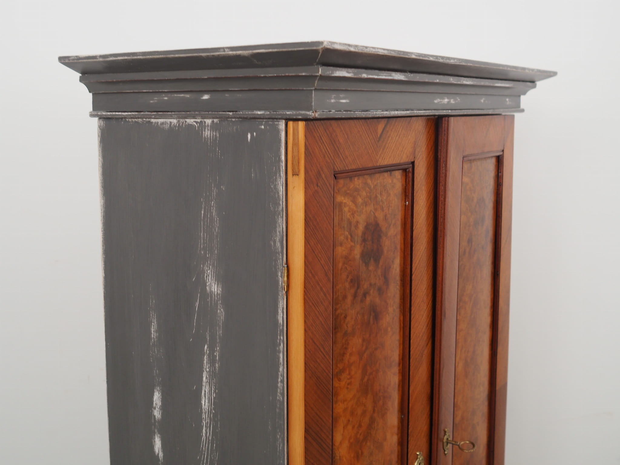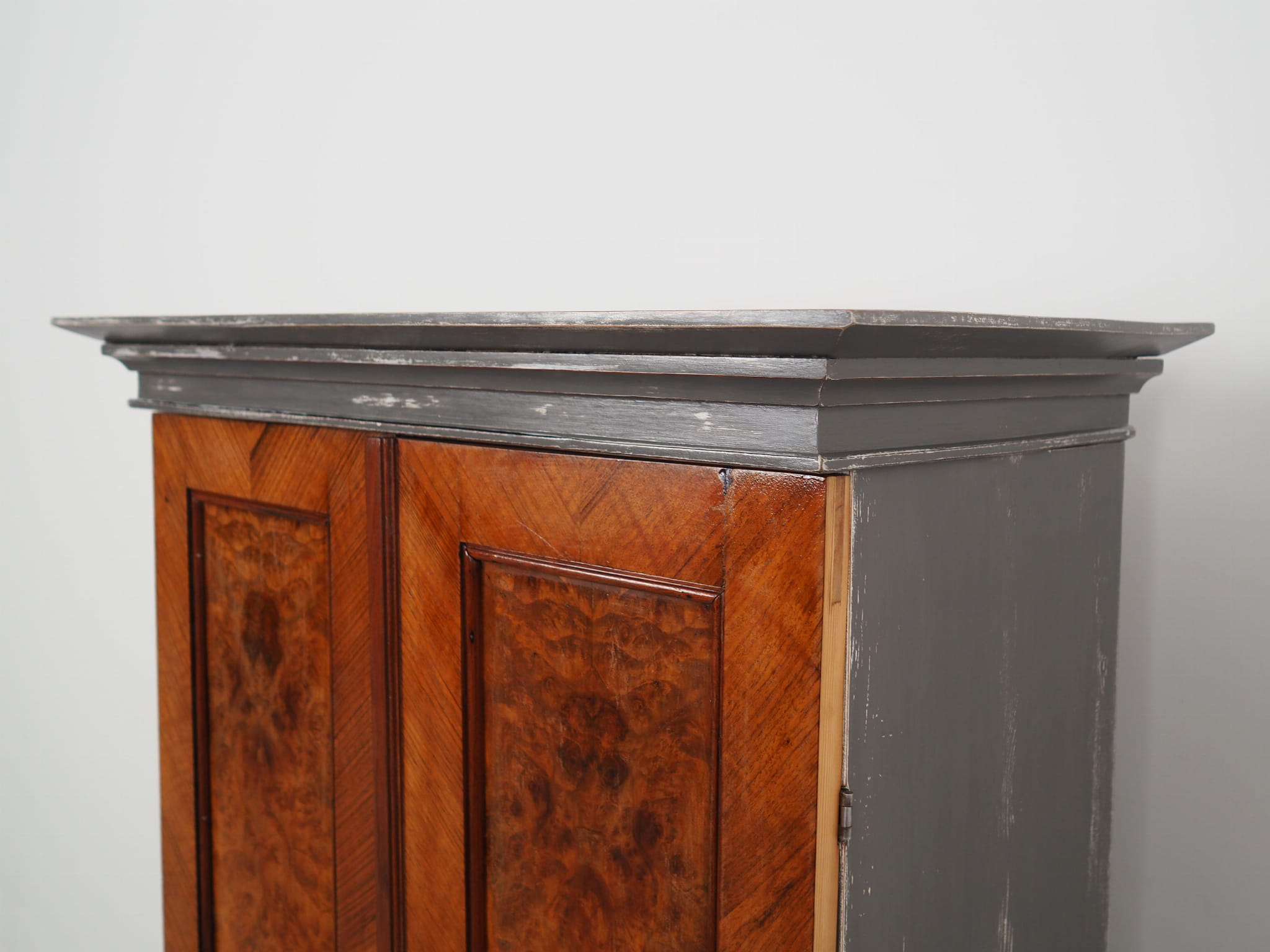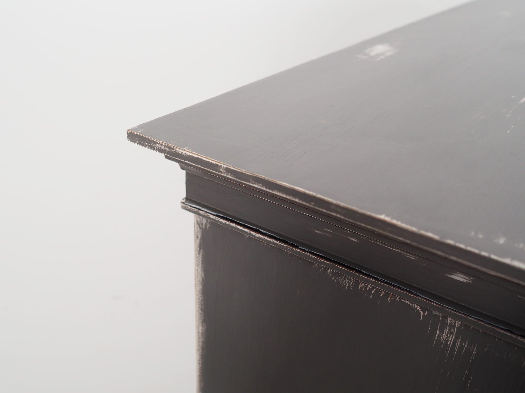 Komodę wykonano z litego drewna sosnowego. Fronty drzwiczek pokryte fornirem mahoniowym oraz ozdobione czeczotą. Poszczególne elementy mebla zostały wybarwione na kolor szary metodą shabby chic. Powierzchnia po odświeżeniu. Wewnątrz przestrzeń została wypełniona dwiema półkami z możliwością regulacji wysokości. Mebel posiada otwór w płycie tylnej, przeznaczony na kabel. Klucz w zestawie. Komoda może pełnić funkcję serwantki.