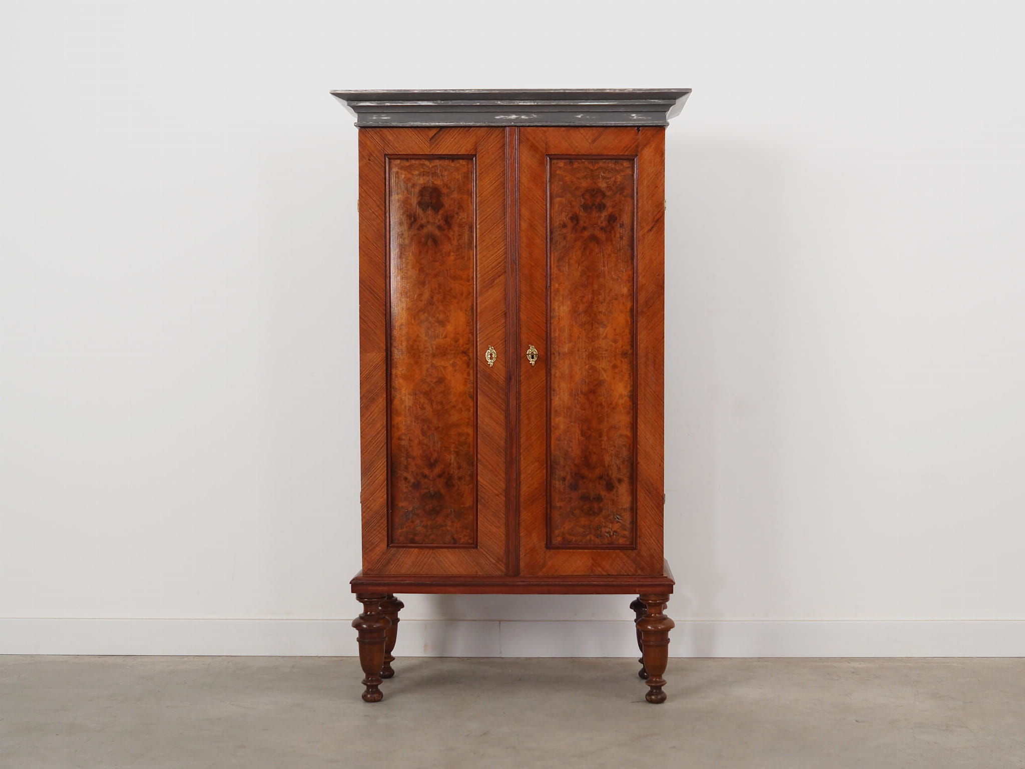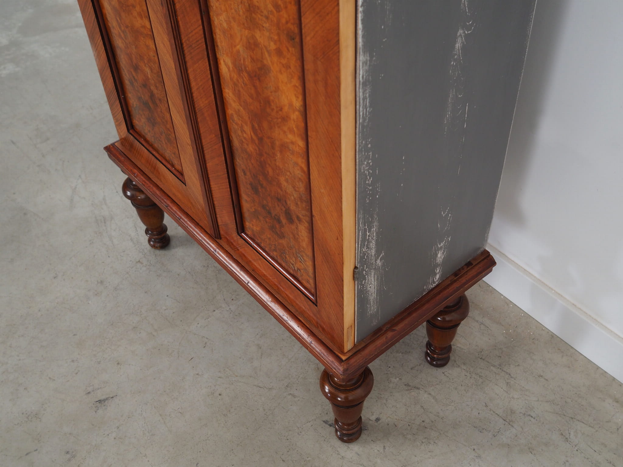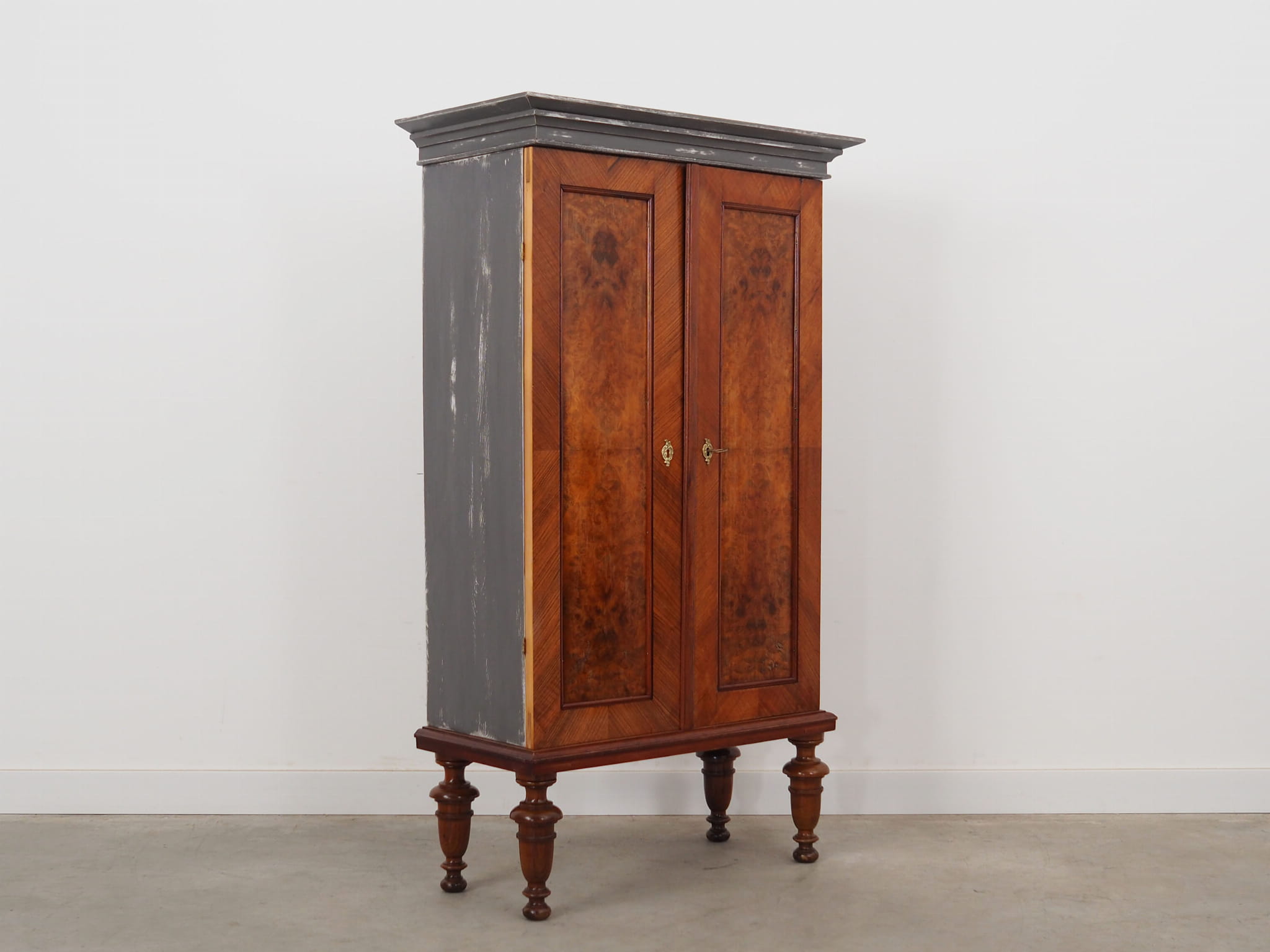Komodę wykonano z litego drewna sosnowego. Fronty drzwiczek pokryte fornirem mahoniowym oraz ozdobione czeczotą. Poszczególne elementy mebla zostały wybarwione na kolor szary metodą shabby chic. Powierzchnia po odświeżeniu. Wewnątrz przestrzeń została wypełniona dwiema półkami z możliwością regulacji wysokości. Mebel posiada otwór w płycie tylnej, przeznaczony na kabel. Klucz w zestawie. Komoda może pełnić funkcję serwantki.