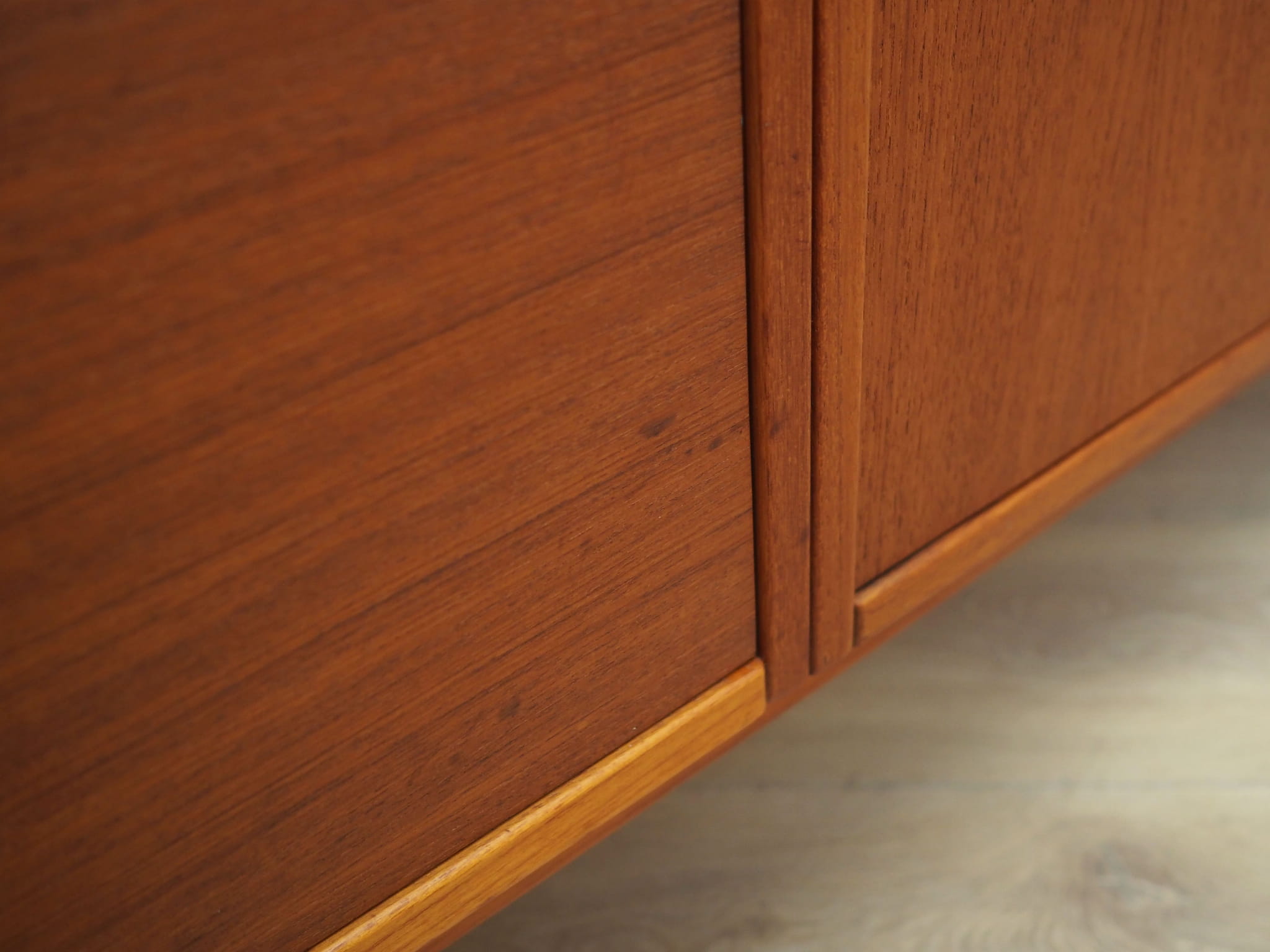 Konstrukcja pokryta jest fornirem tekowym. Nogi i uchwyty zostały wykonane z litego drewna. Powierzchnia po odświeżeniu. Wewnątrz przestrzeń została wypełniona półką z możliwością regulacji wysokości oraz trzema praktycznymi szufladami. Mebel posiada wygodne rozwiązanie drzwi otwieranych, dzięki czemu mamy nieograniczony dostęp do jego wnętrza. Brak klucza w zestawie.
