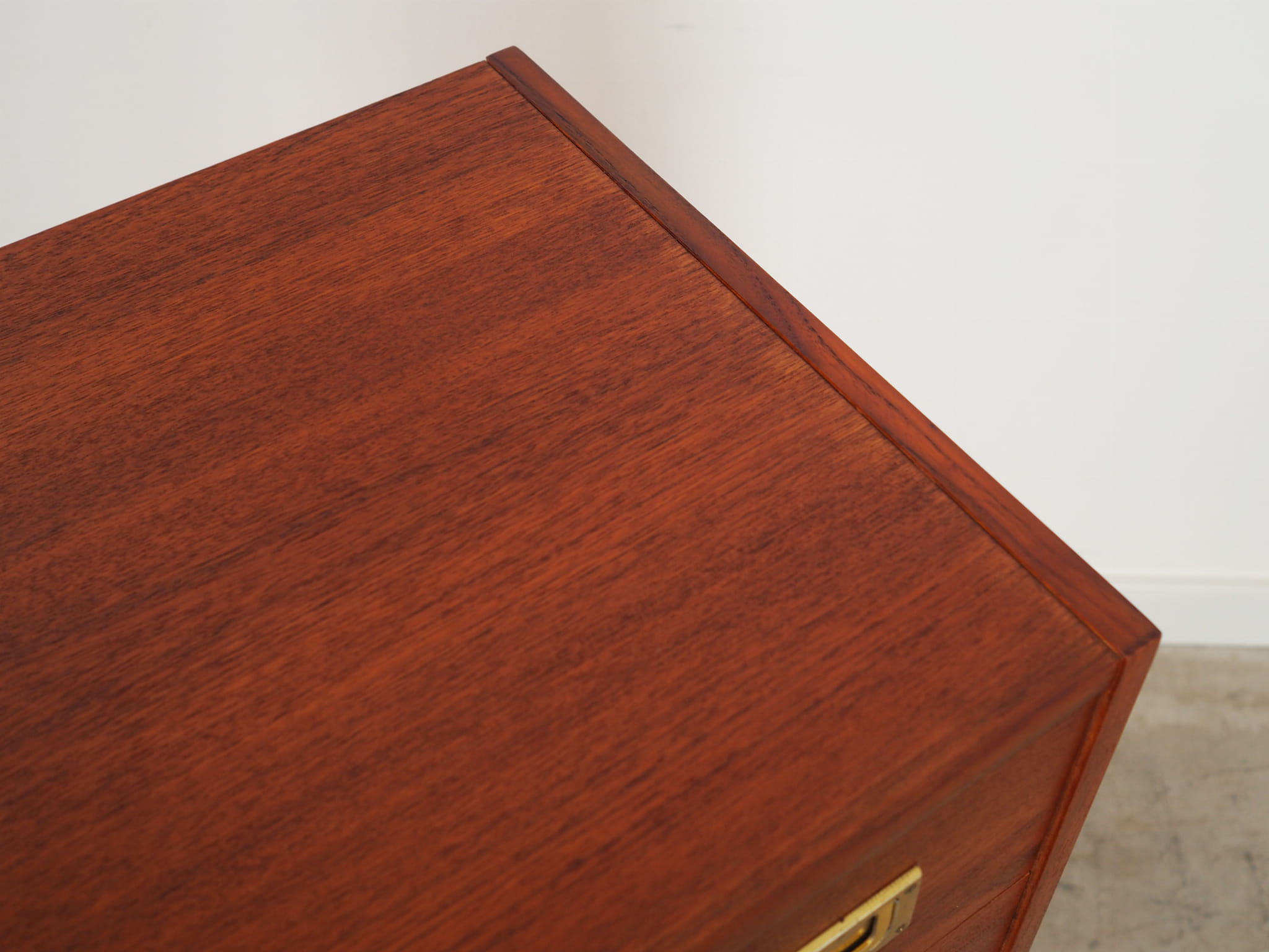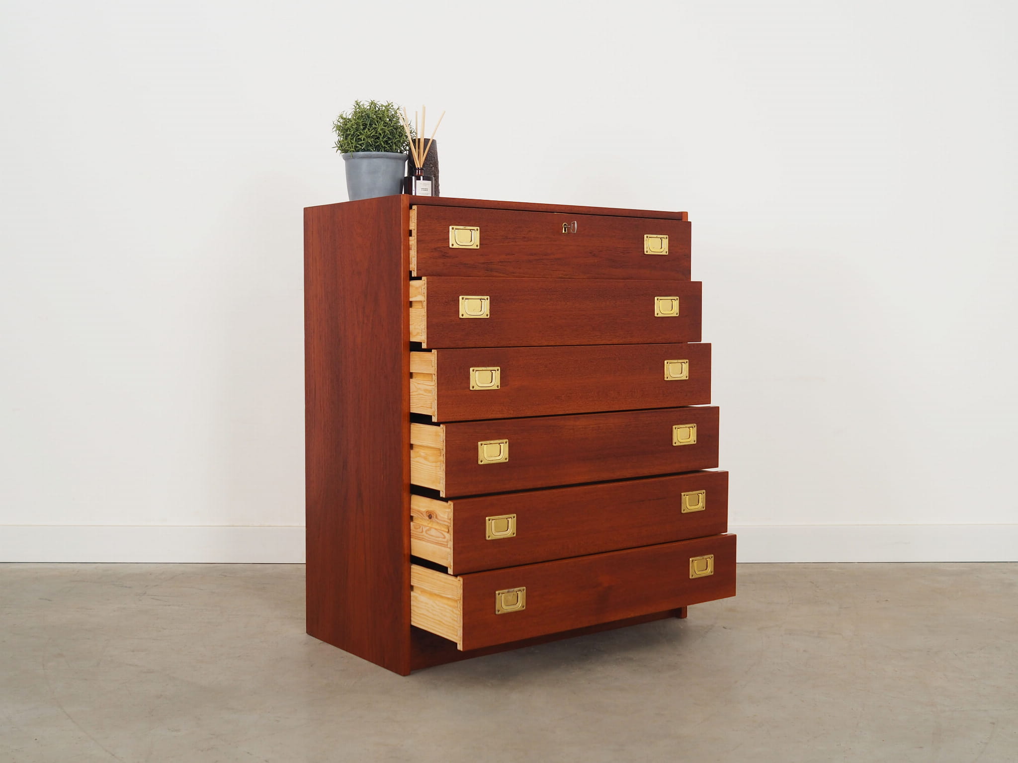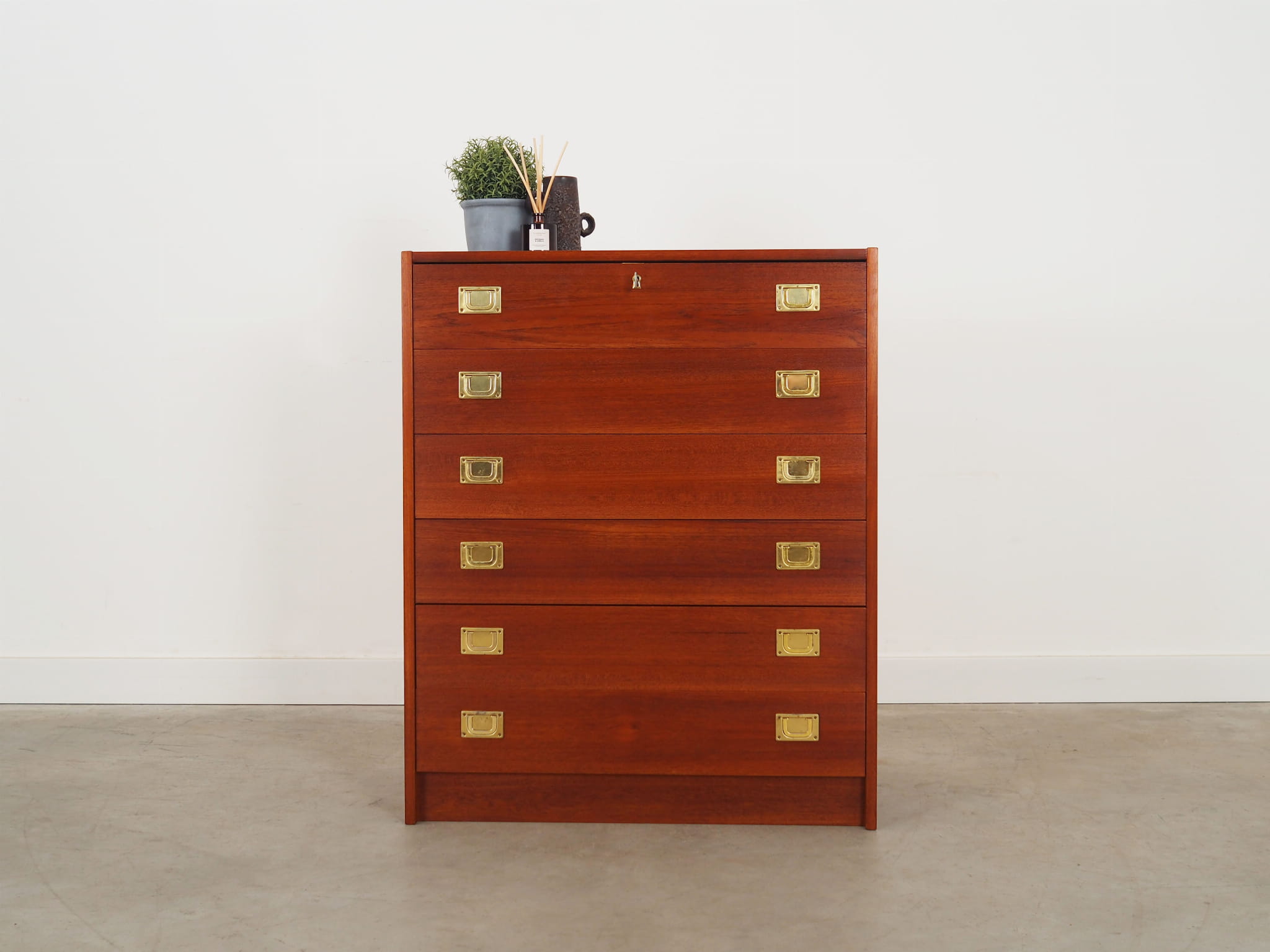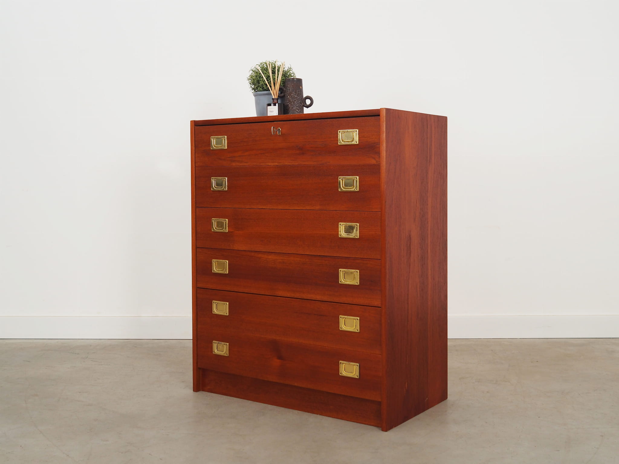 Konstrukcja pokryta jest fornirem tekowym. Mebel został umieszczony na drewnianym cokole. Uchwyty wykonane z metalu. Powierzchnia po odświeżeniu. Dzięki sześciu szufladom spełni idealnie swoją rolę jako szafka na dokumenty, zabawki w pokoju dziecięcym lub jako bieliźniarka w sypialni.