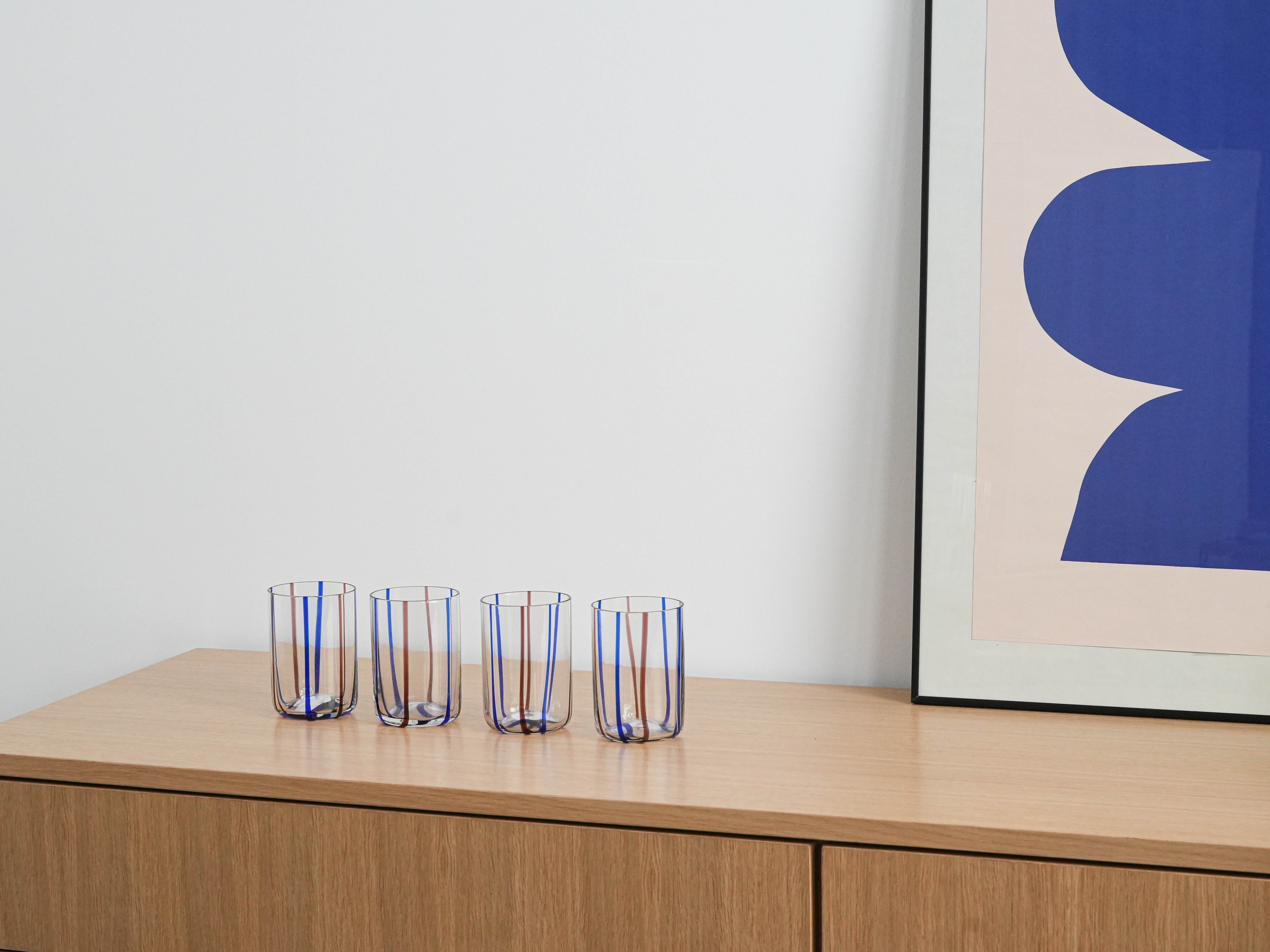 Zestaw 4 szklanek z ręcznie zdobionego szkła z unikalnym wzorem niebiesko-brązowych smug. Artystyczny design i solidne wykonanie sprawiają, że każda z nich to małe dzieło sztuki w stylu vintage lub modernistycznym.