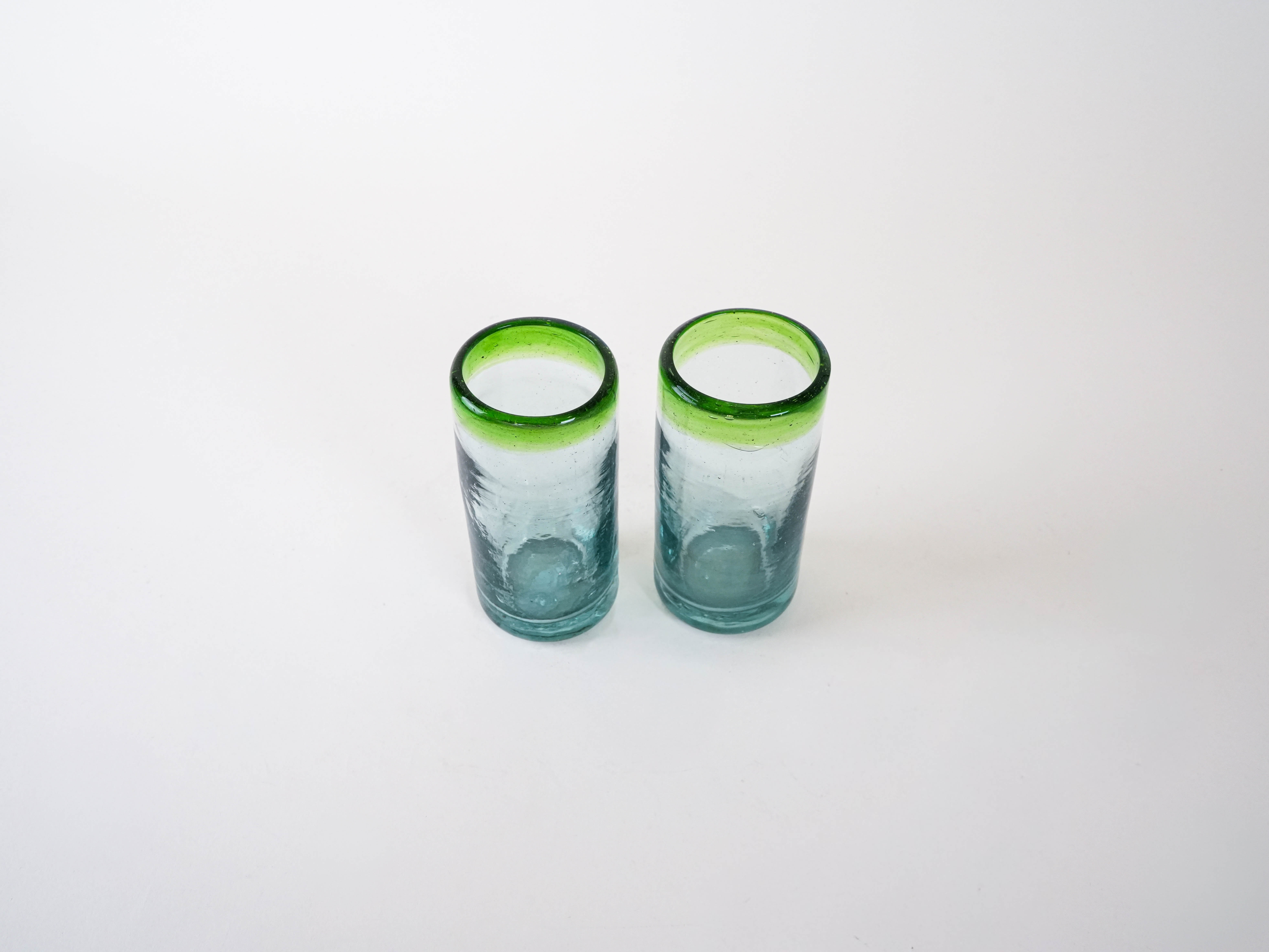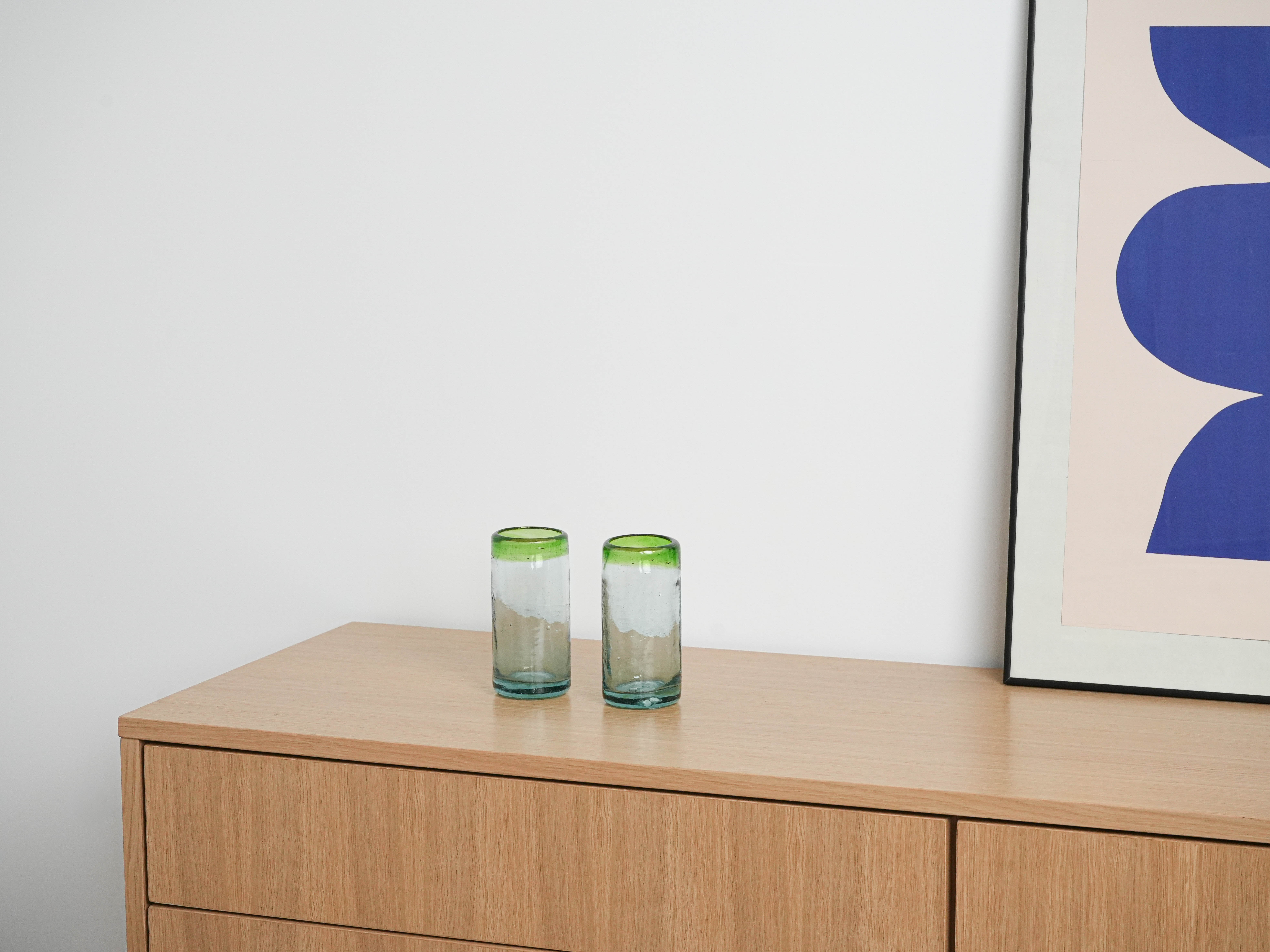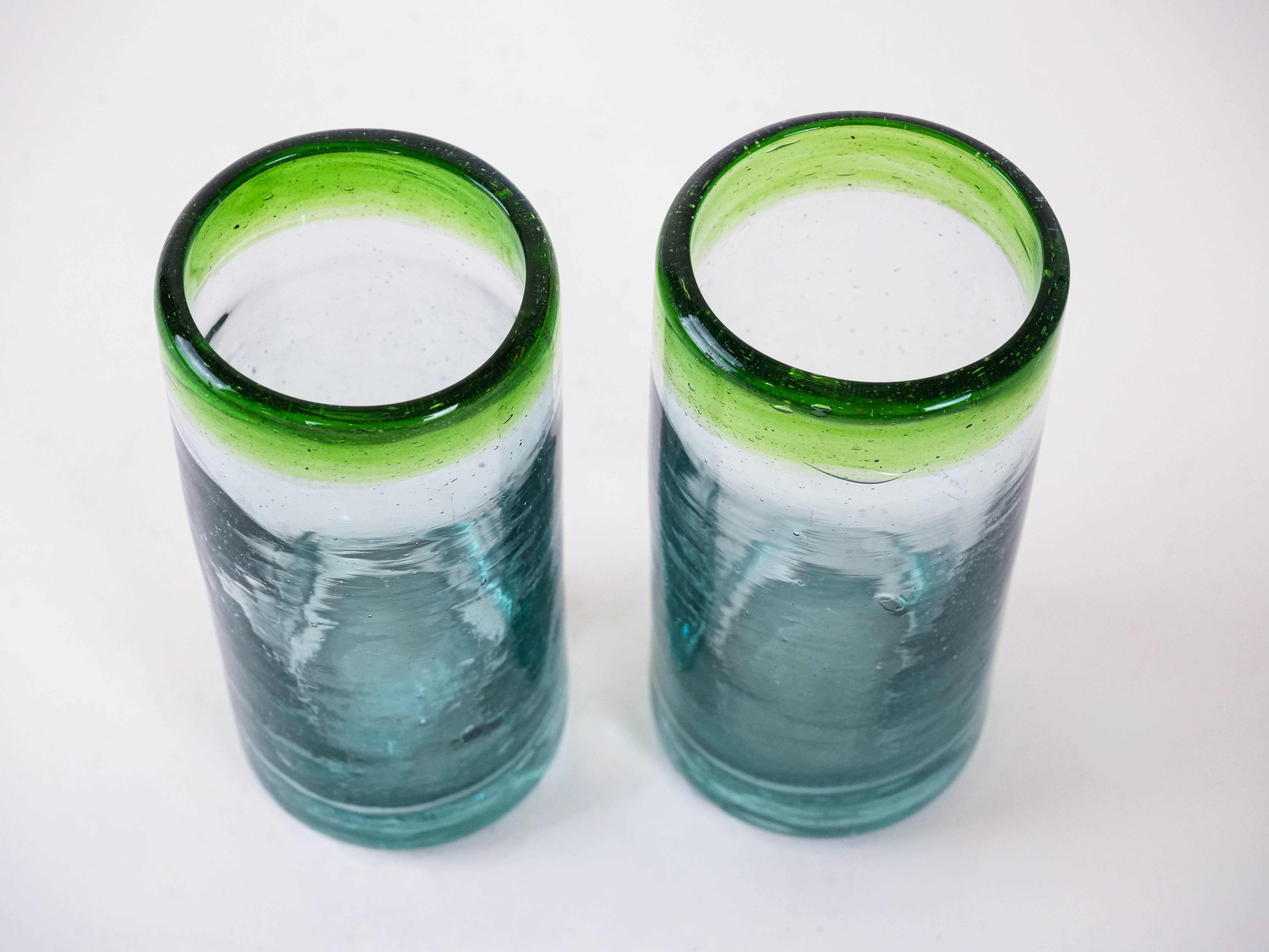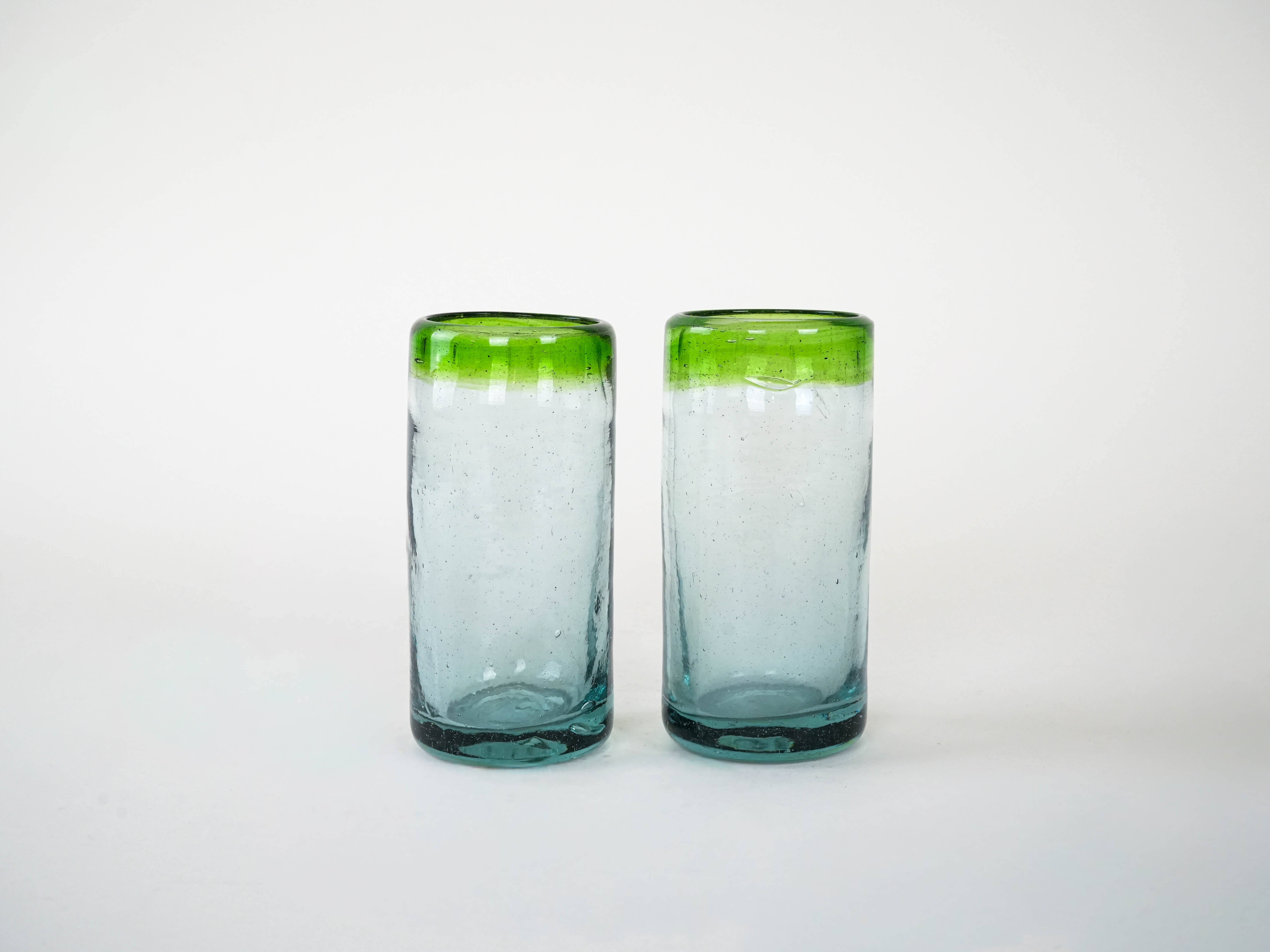 Dwie wysokie szklanki wykonane ręcznie ze szkła dmuchanego, z charakterystycznymi pęcherzykami powietrza w masie i zielonym rantem. Minimalistyczne, a jednocześnie dekoracyjne – idealne do serwowania drinków, soków czy wody, ale także jako nietuzinkowa dekoracja stołu. Wyjątkowe rzemiosło, które podkreśla unikatowy charakter każdej sztuki.
