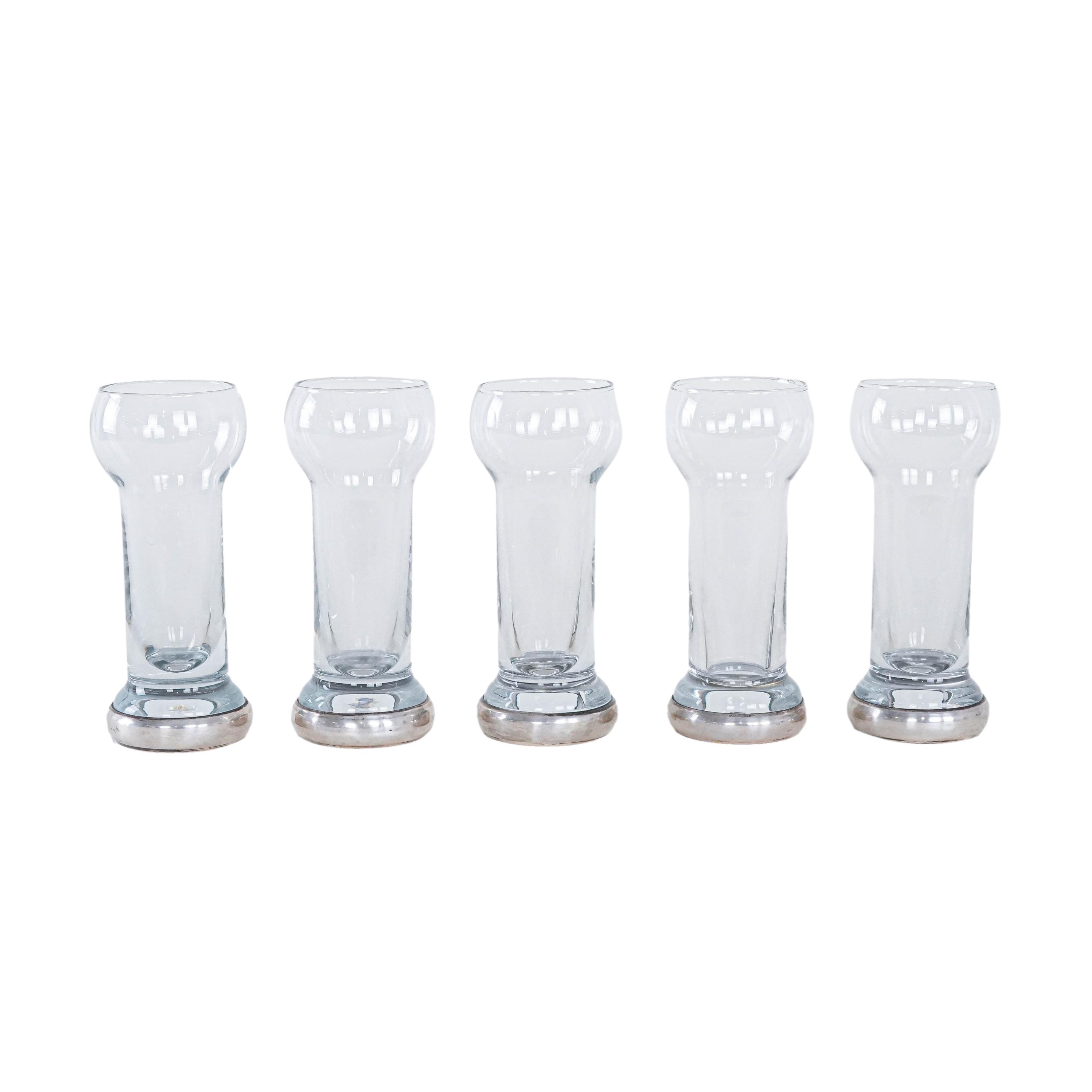 Zestaw 5 kryształowych szklanek vintage z lat 70., ozdobionych subtelną srebrną obręczą przy krawędzi. Szklanki doskonale sprawdzą się do serwowania wody, soków, drinków czy koktajli, a jednocześnie mogą pełnić funkcję efektownego elementu dekoracyjnego stołu lub witryny. Idealne dla miłośników szkła vintage i kolekcjonerów designu z lat 70.