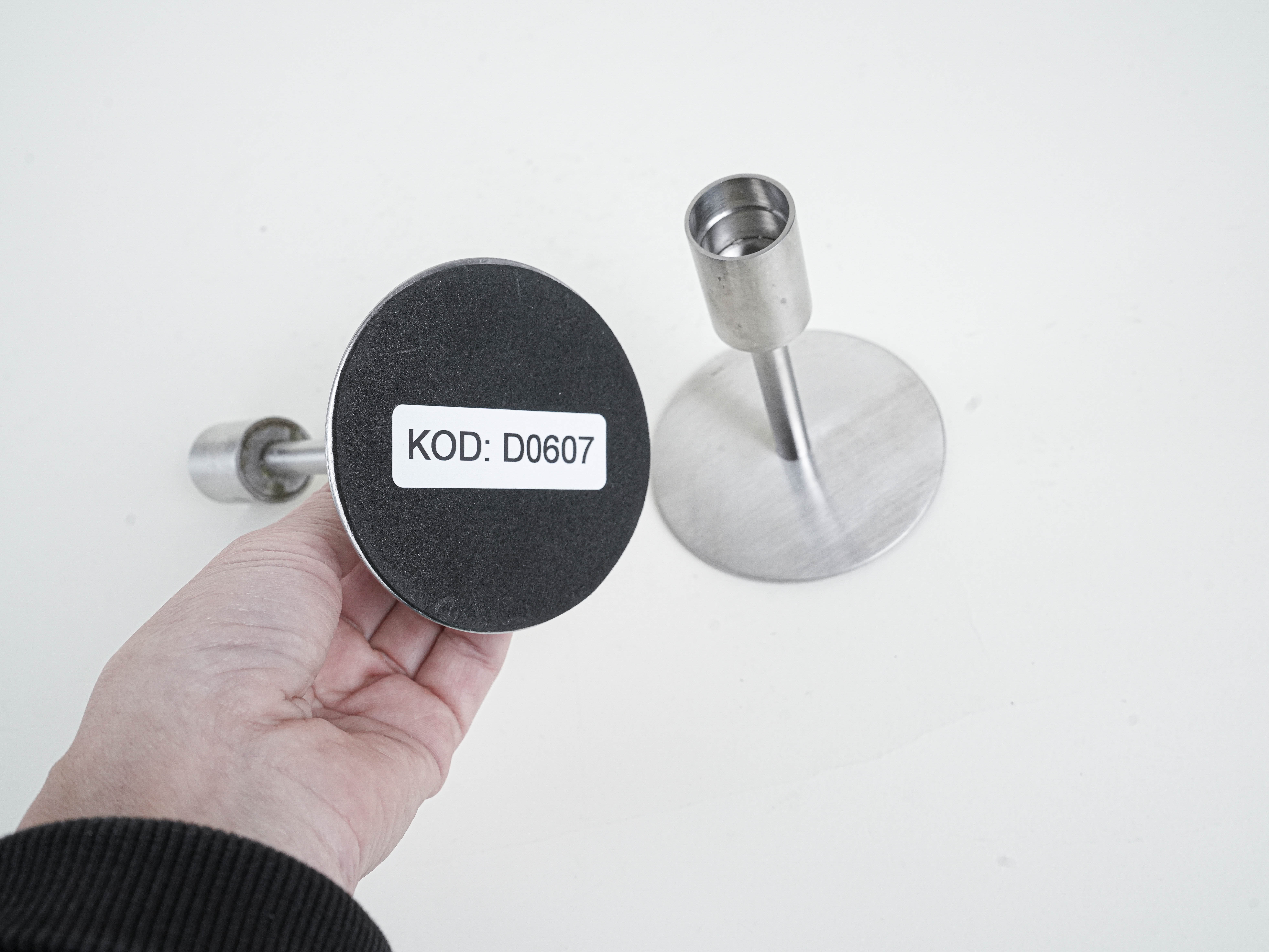 Komplet dwóch świeczników modernistycznych w stylu skandynawskim, wykonanych z metalu w surowym, minimalistycznym wykończeniu. Prosta forma na płaskiej, okrągłej podstawie nadaje im ponadczasową elegancję. Idealne do wnętrz w stylu vintage, mid-century czy industrialnym.