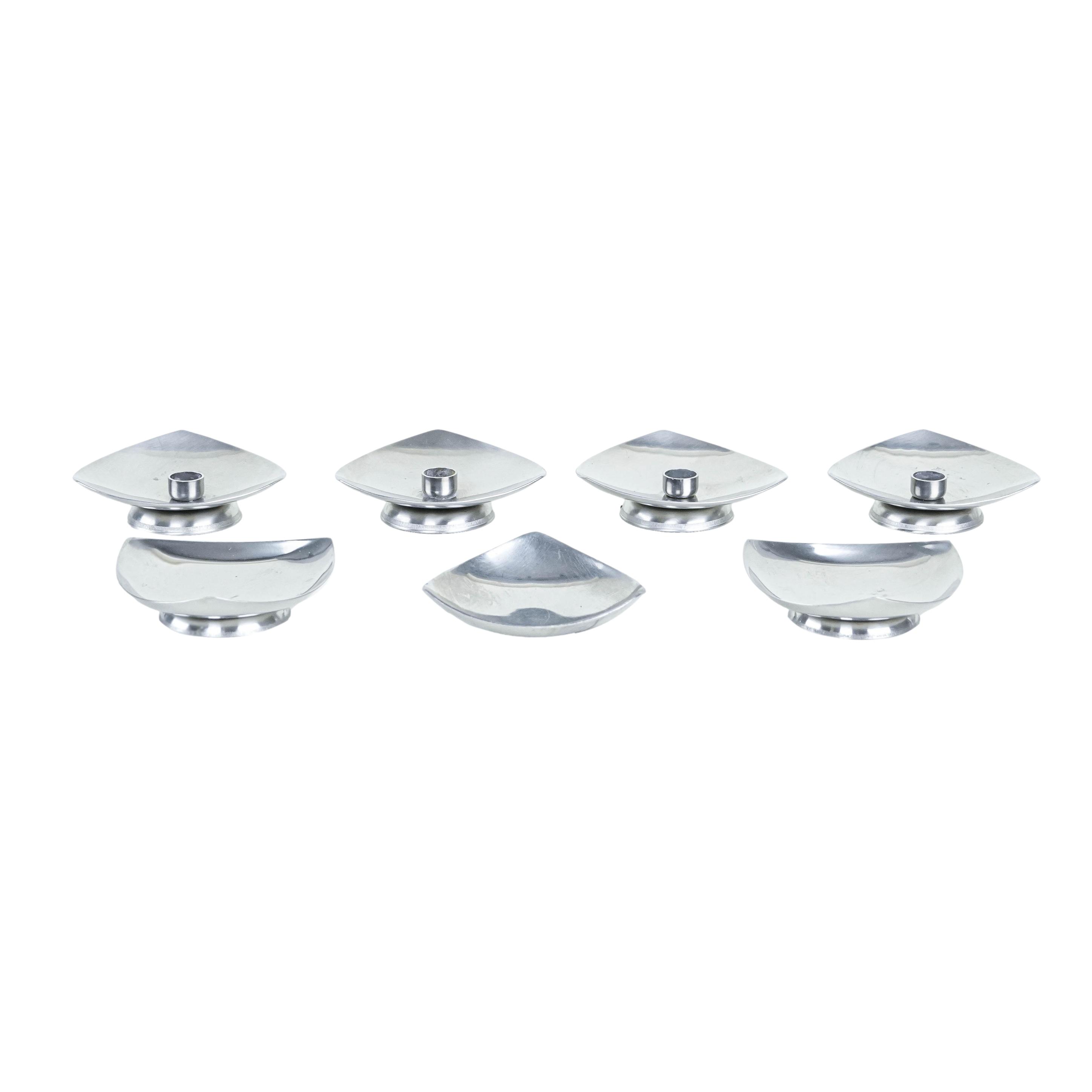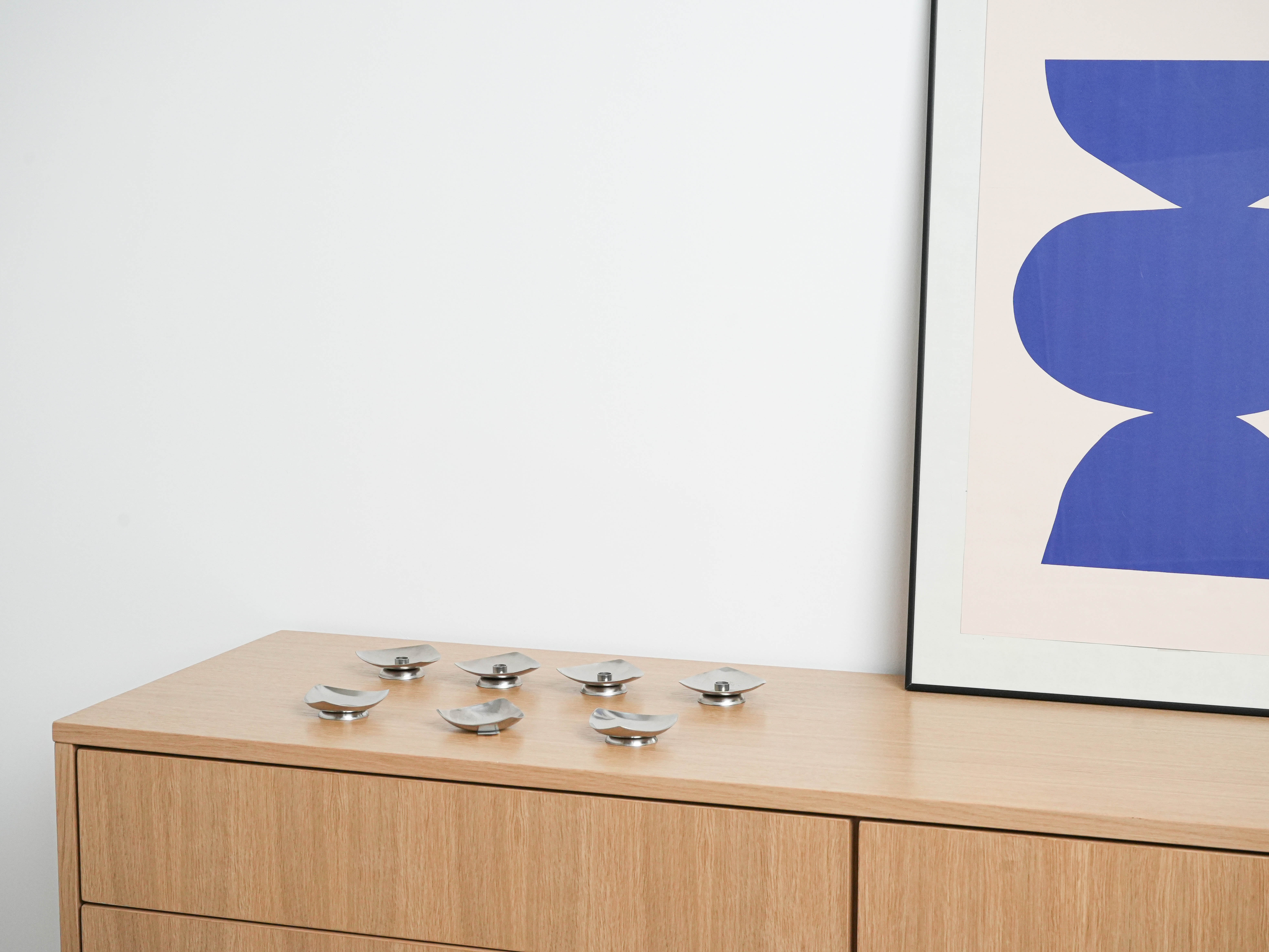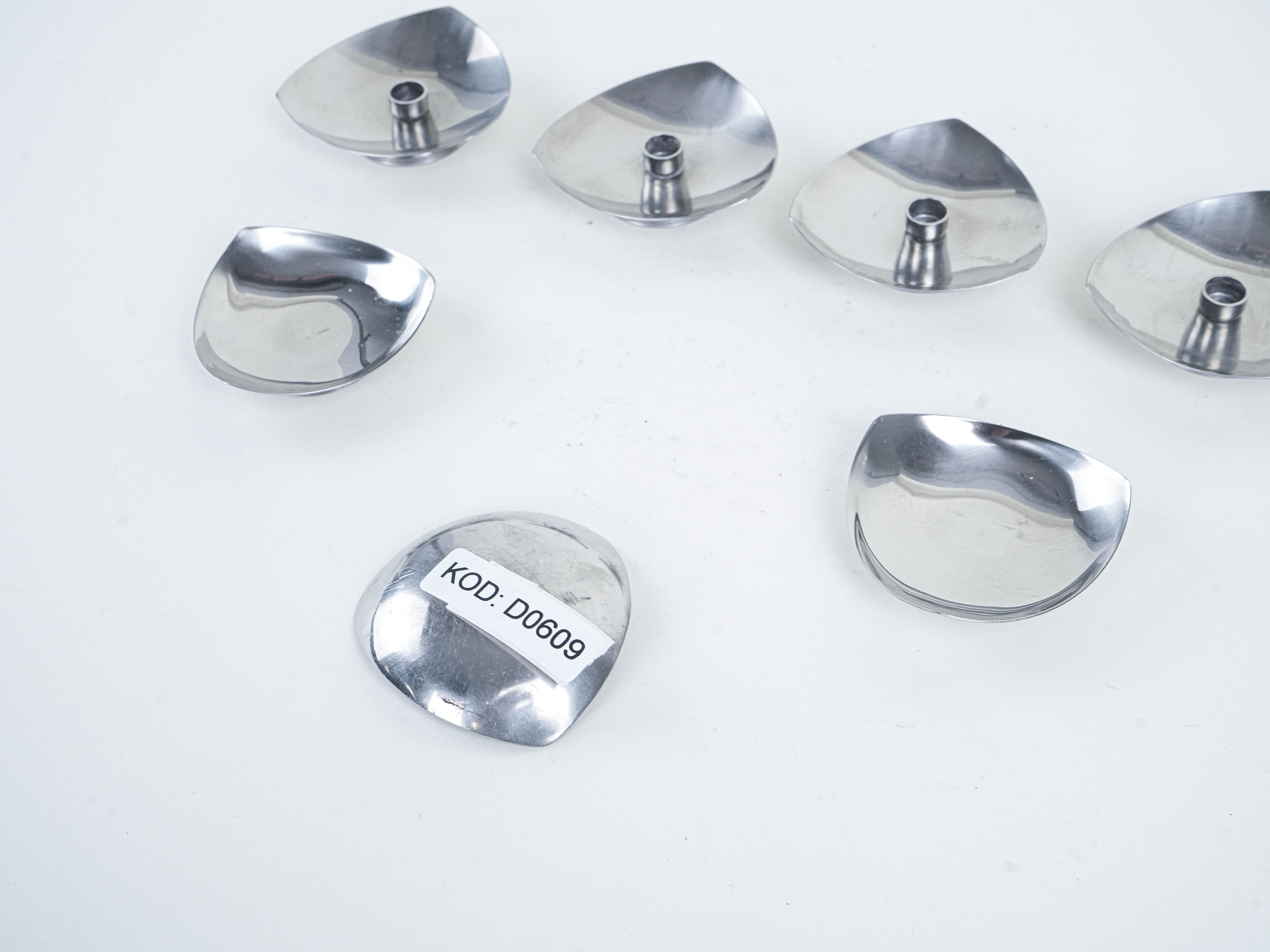 Zestaw siedmiu świeczników modułowych w stylu Stelton / Arne Jacobsen, wykonanych z polerowanej stali nierdzewnej. Organiczne, trójkątne formy inspirowane naturą można dowolnie zestawiać, tworząc efektowne układy – od minimalistycznej kompozycji po rozbudowane aranżacje na stół. To ikona duńskiego designu mid-century, łącząca prostotę formy z funkcjonalnością i ponadczasową elegancją. Idealne zarówno dla kolekcjonerów skandynawskiego wzornictwa, jak i jako unikalny akcent w nowoczesnych wnętrzach.