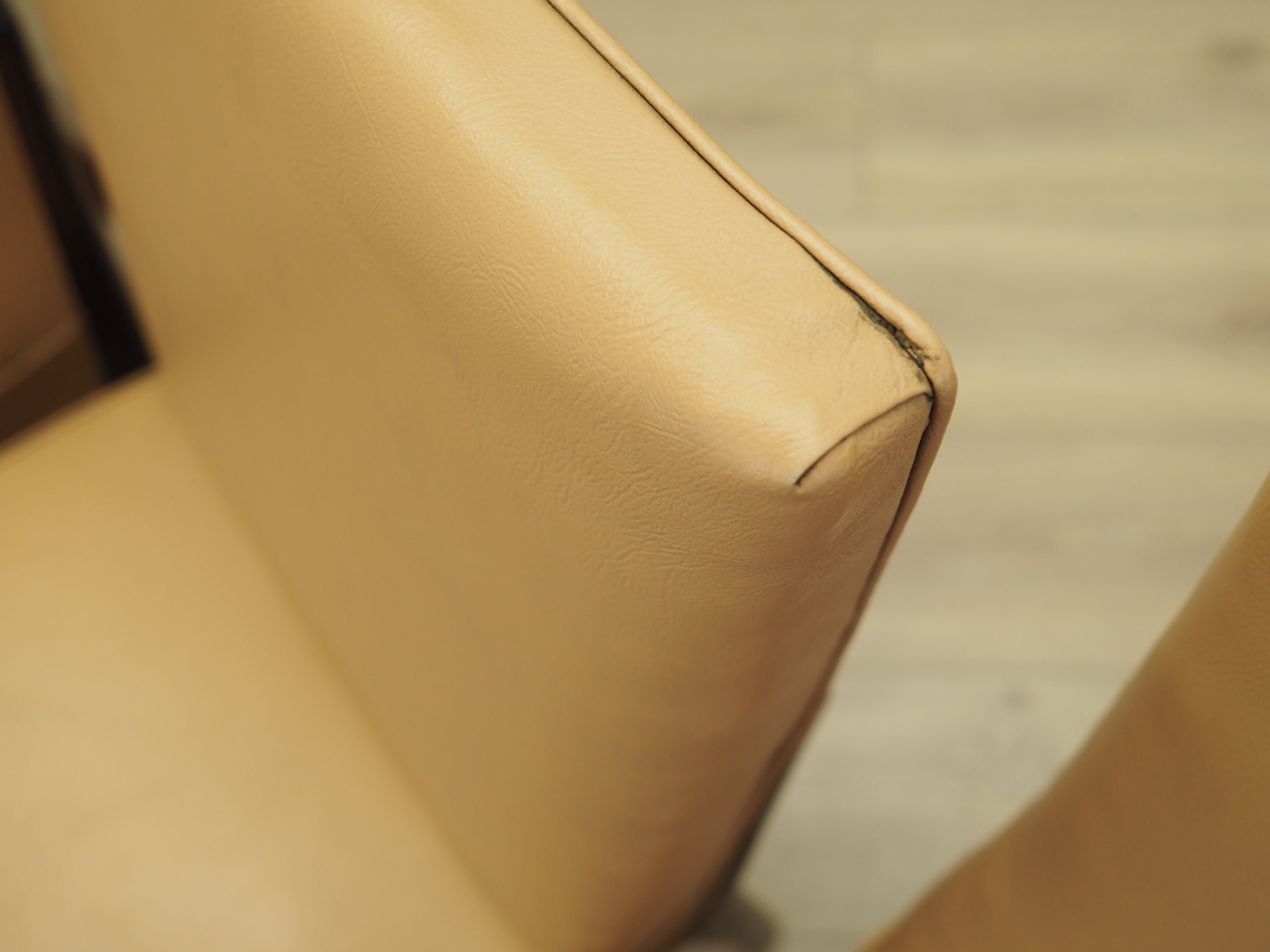 Konstrukcja wykonana jest z drewna mahoniowego. Drewno po renowacji. Krzesła posiadają oryginalną tapicerkę. Tapicerka została wykonana w kolorze beżowym, wykorzystana została wysokiej jakości ekoskóra.
