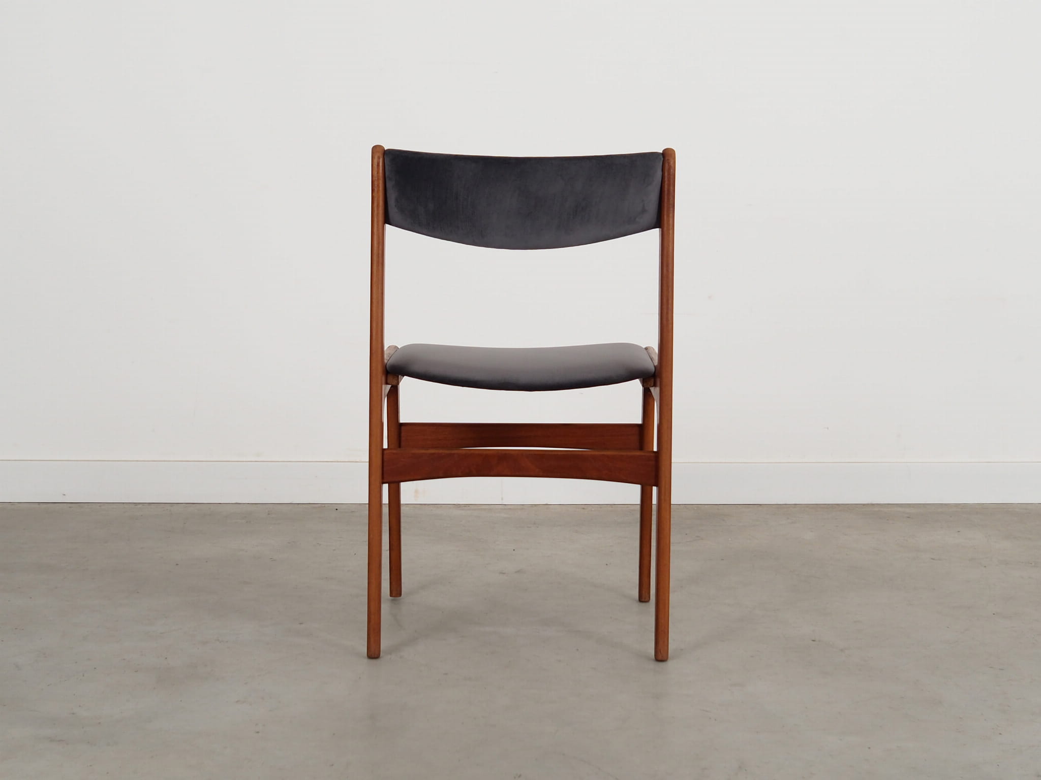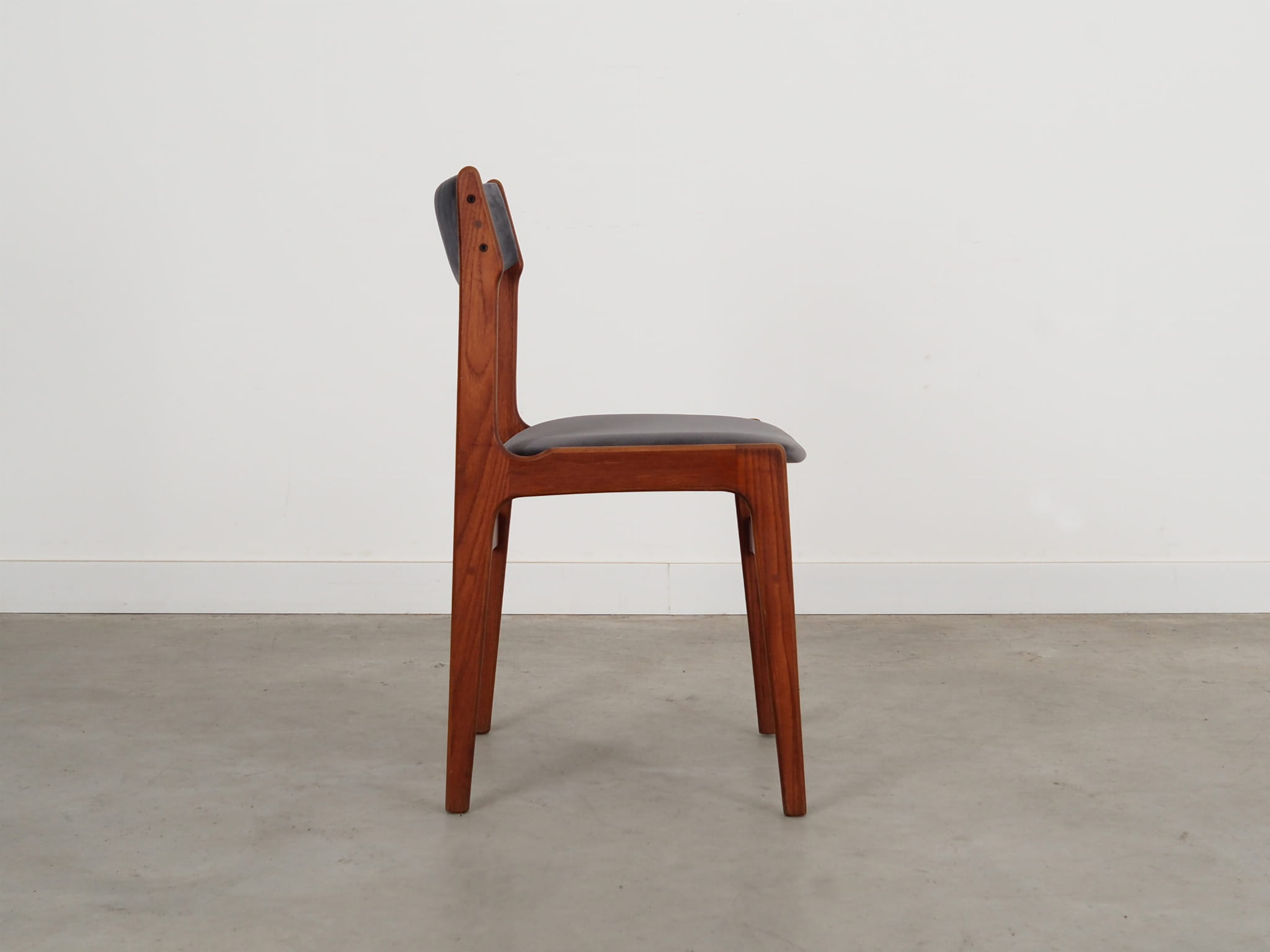 Konstrukcja wykonana jest z drewna tekowego. Drewno po odświeżeniu. Krzesła posiadają nową tapicerkę. Tapicerka została wykonana w kolorze szarym, wykorzystana została wysokogatunkowa tkanina welurowa.
