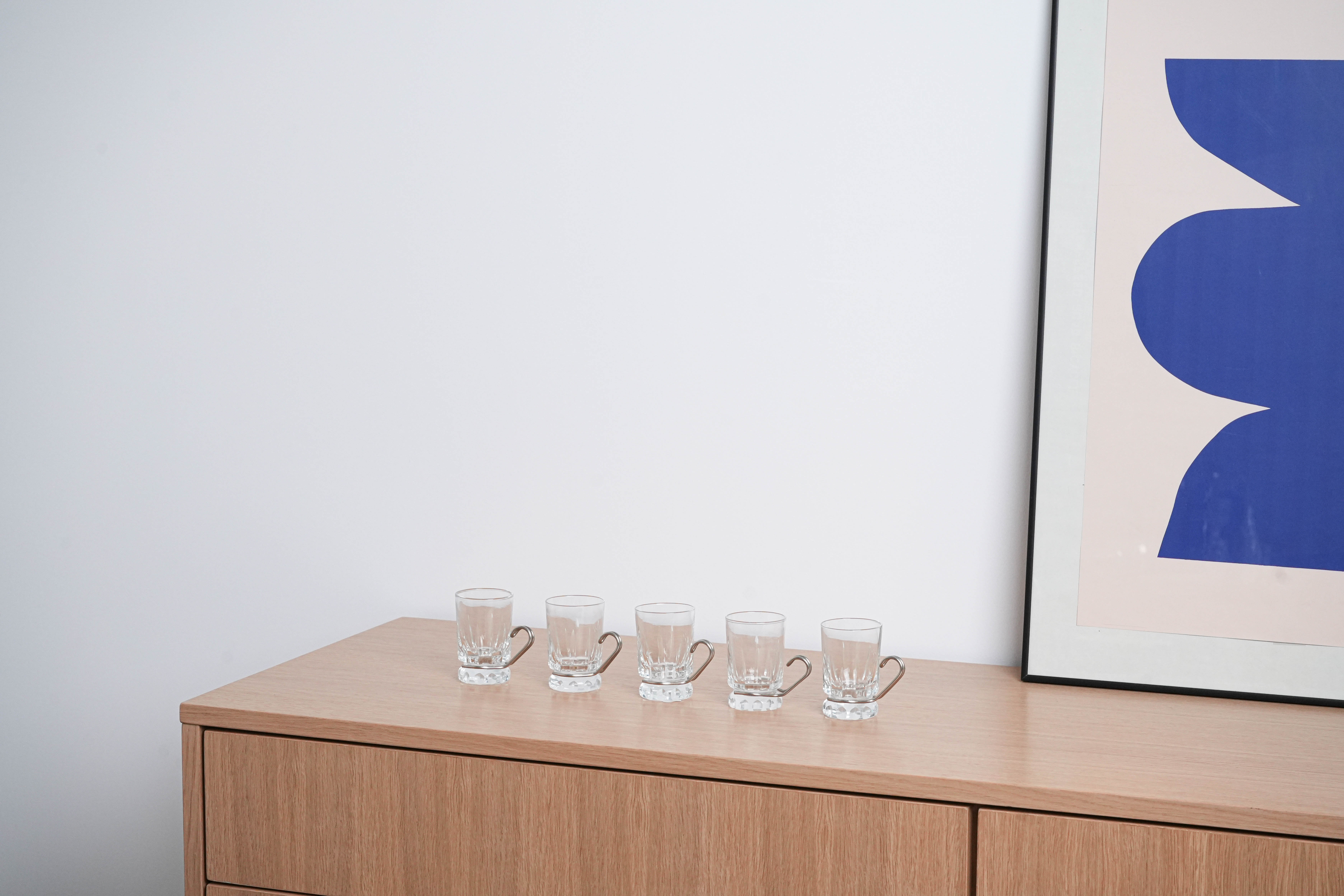 Szklanki do espresso lub herbaty w stylu modernistycznym, lata 70. XX wieku. Kryształowe szkło o grubym, szlifowanym dnie osadzone w stalowym uchwycie o minimalistycznej, geometrycznej linii. Połączenie transparentnego szkła z metalem jest charakterystyczne dla wzornictwa modern i Bauhaus revival, gdzie prostota formy spotyka się z funkcjonalnością.