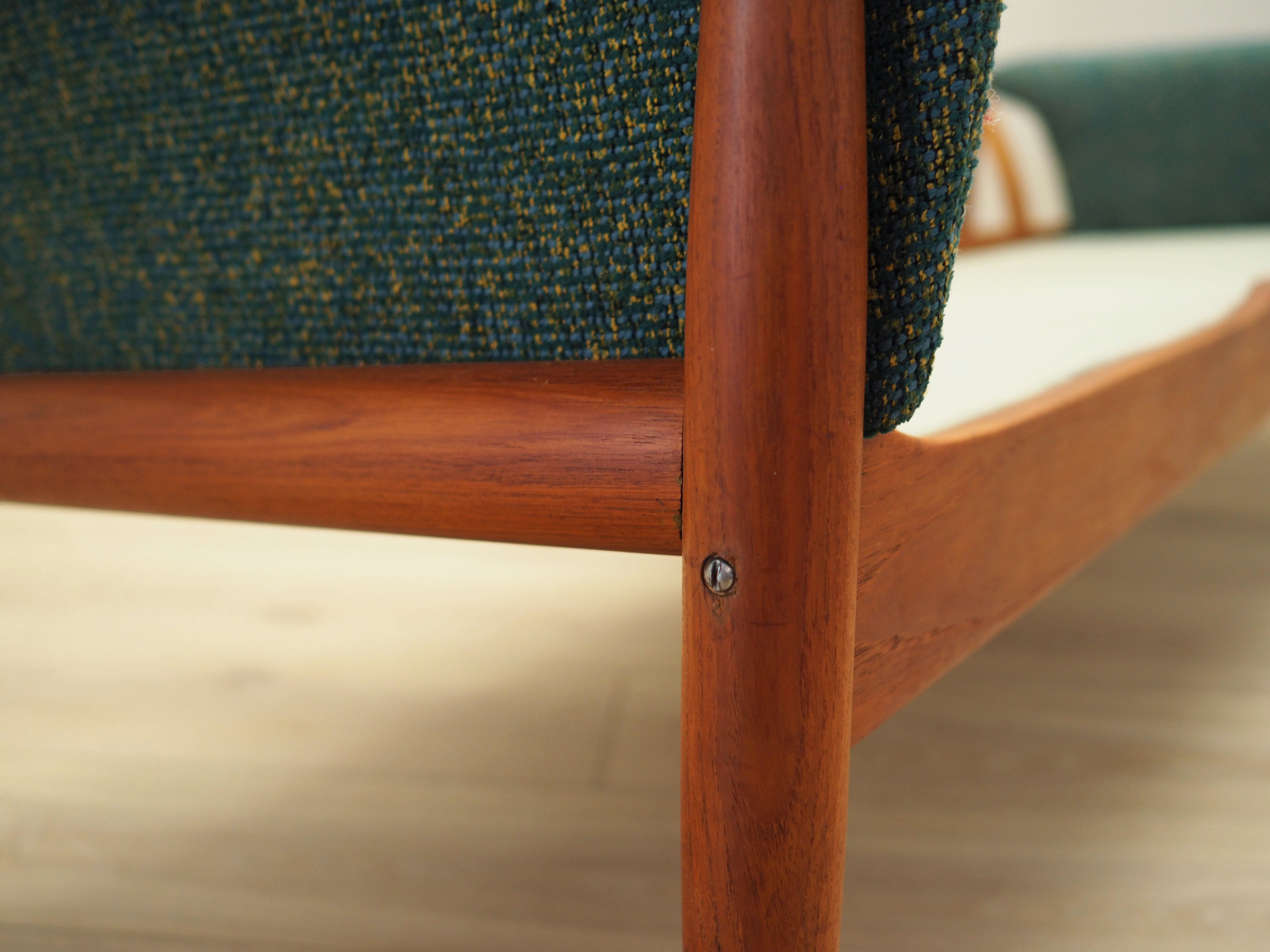 Konstrukcja mebli wykonana z litego drewna. Nogi wykonane z litego drewna tekowego. Zarówno sofa, jak i fotel, zostały poddane renowacji tapicerskiej, gąbki oraz tkanina wymienione na nowe. Tapicerka została wykonana w kolorze zielonym, wykorzystana została wysokogatunkowa tkanina melanżowa.