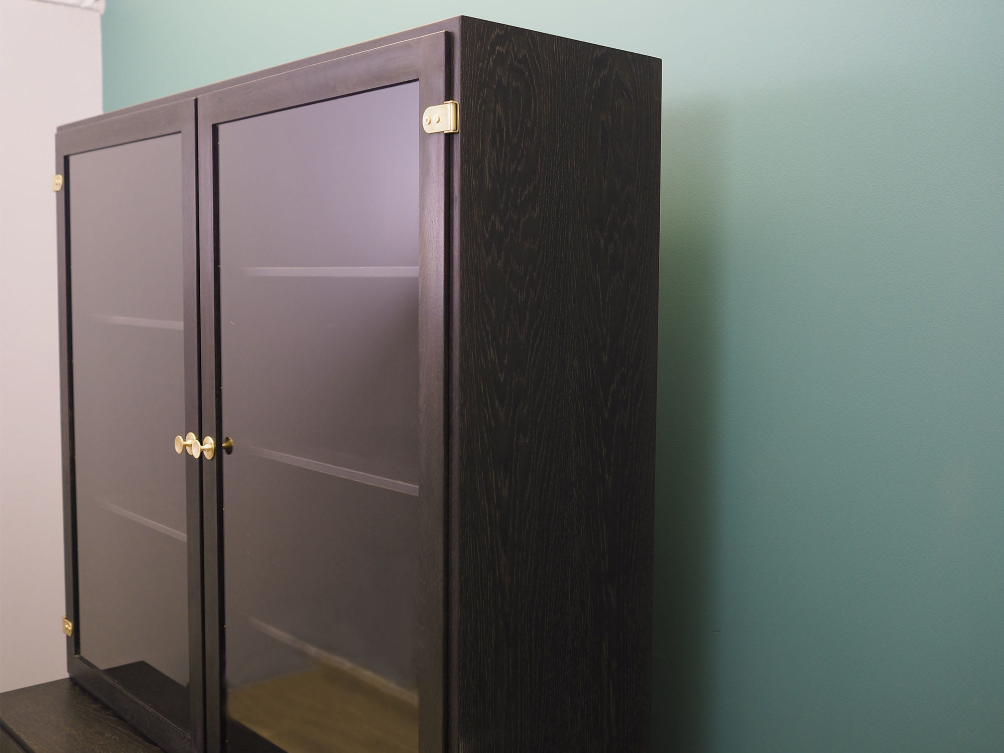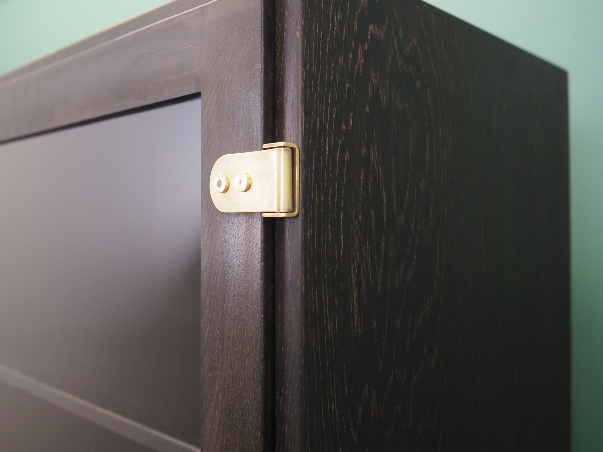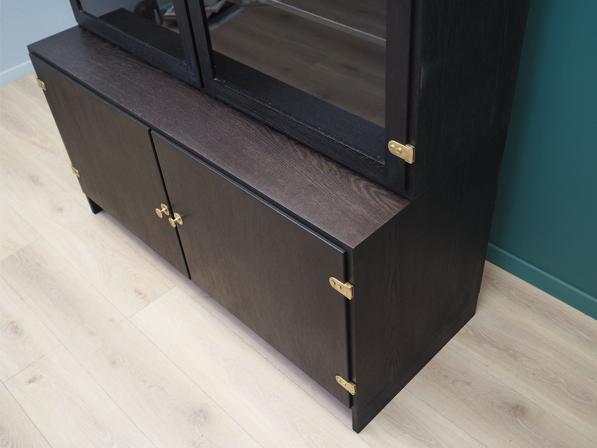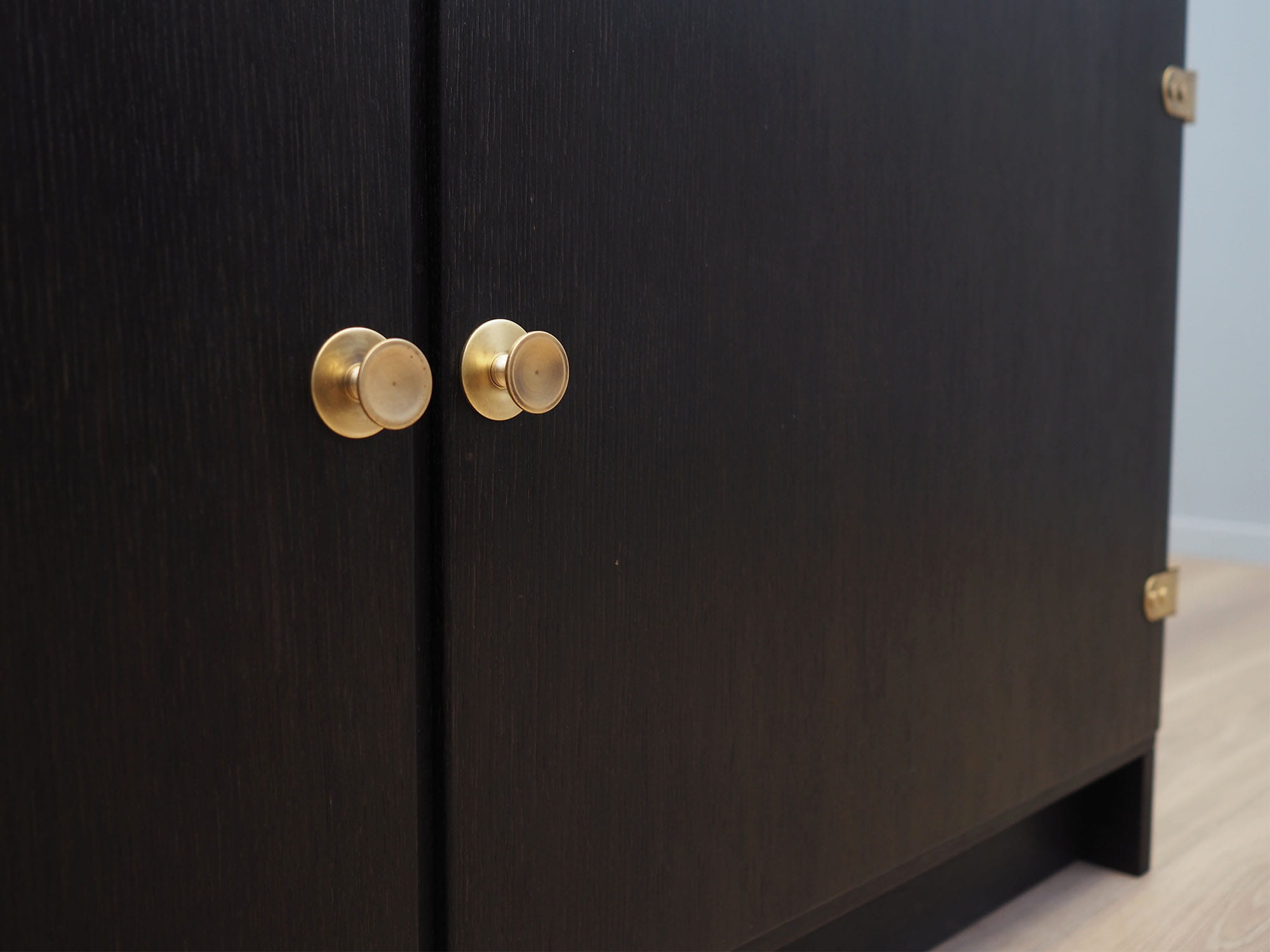 Konstrukcja pokryta jest fornirem dębowym. Uchwyty zostały wykonane z mosiądzu. Wewnątrz przestrzeń została wypełniona siedmioma praktycznymi półkami z możliwością regulacji wysokości. Mebel posiada praktyczne rozwiązanie drzwi otwieranych, dzięki czemu nie ograniczamy sobie dostępu do wnętrza. Kredens będzie idealnym dopełnieniem wyposażenia salonu bądź jadalni.