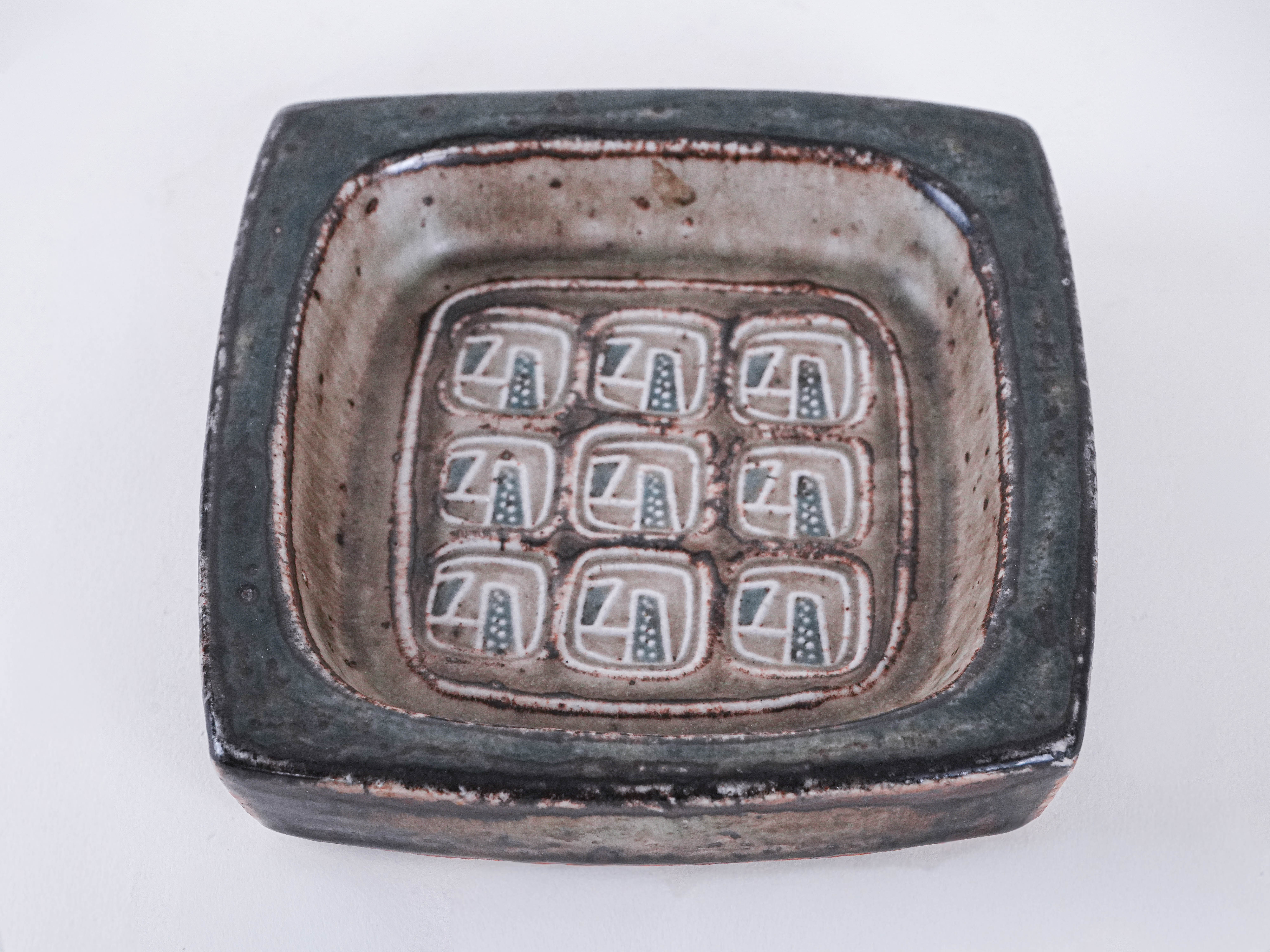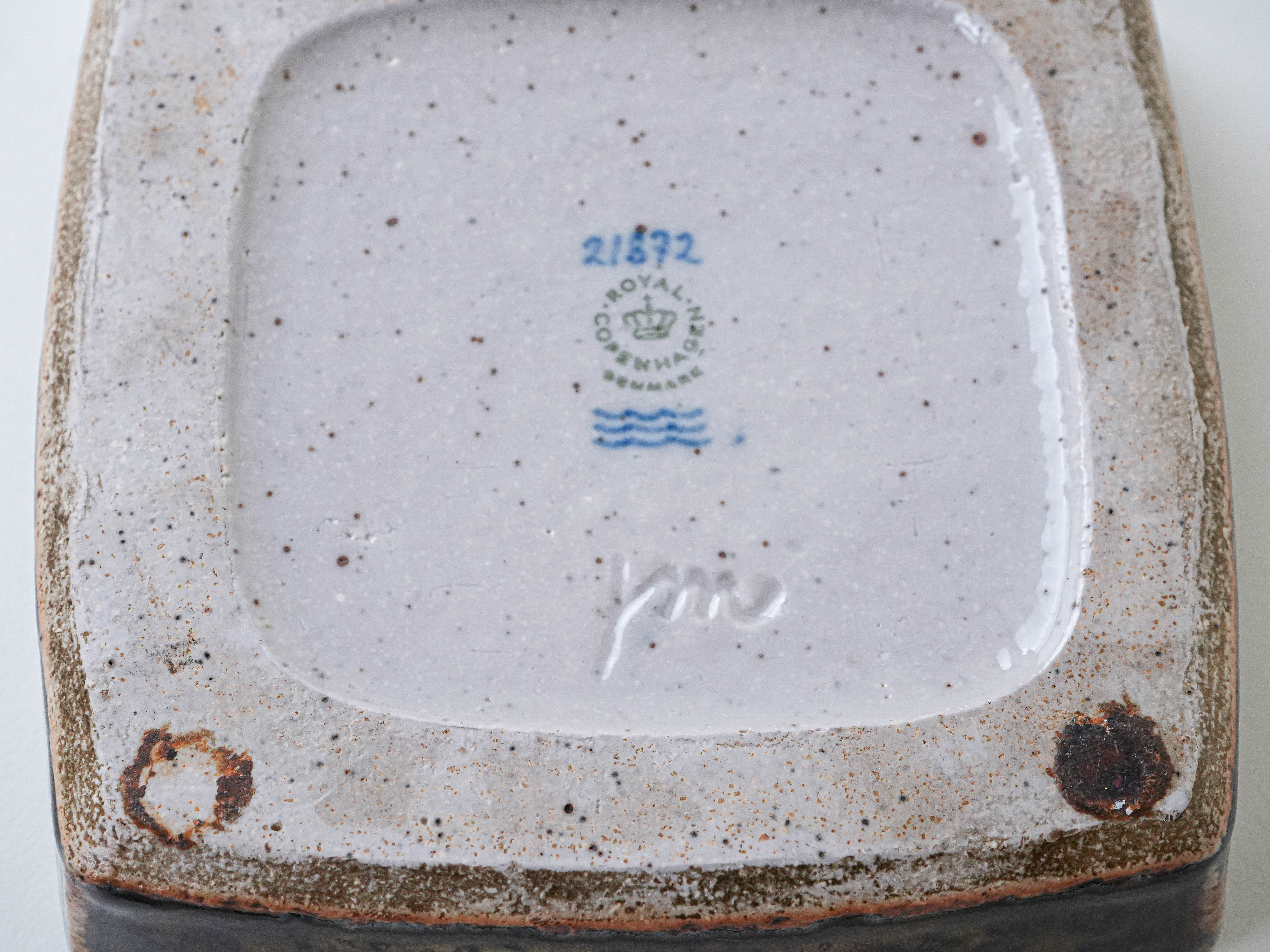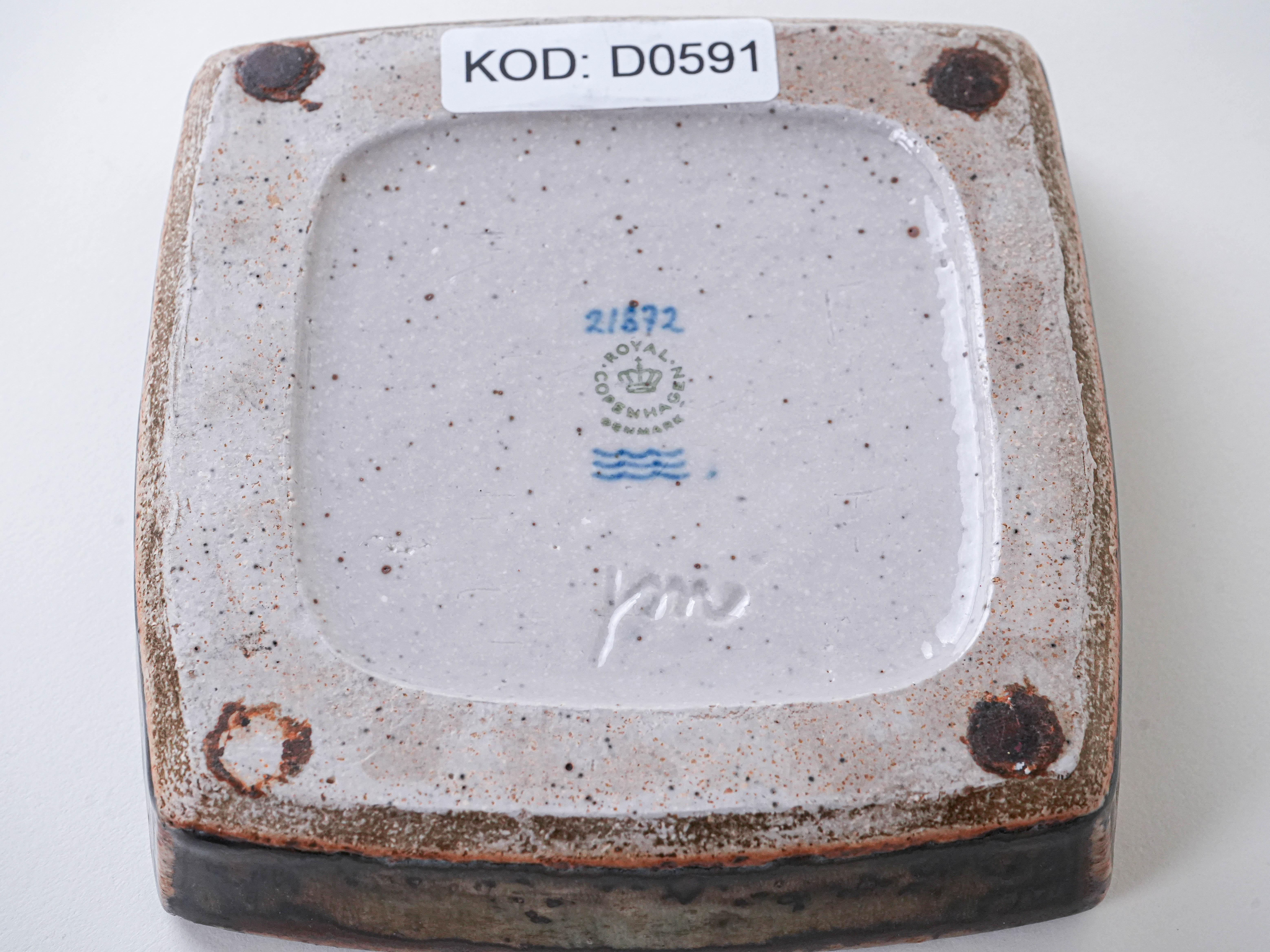 Kwadratowa, ceramiczna miseczka Royal Copenhagen, ręcznie dekorowana w abstrakcyjnym, geometrycznym stylu autorstwa Nilsa Thorssona. Szkliwo w odcieniach zieleni, beżu i niebieskości tworzy efektowną, ponadczasową kompozycję. Idealna jako mała patera, na biżuterię czy jako obiekt kolekcjonerski.