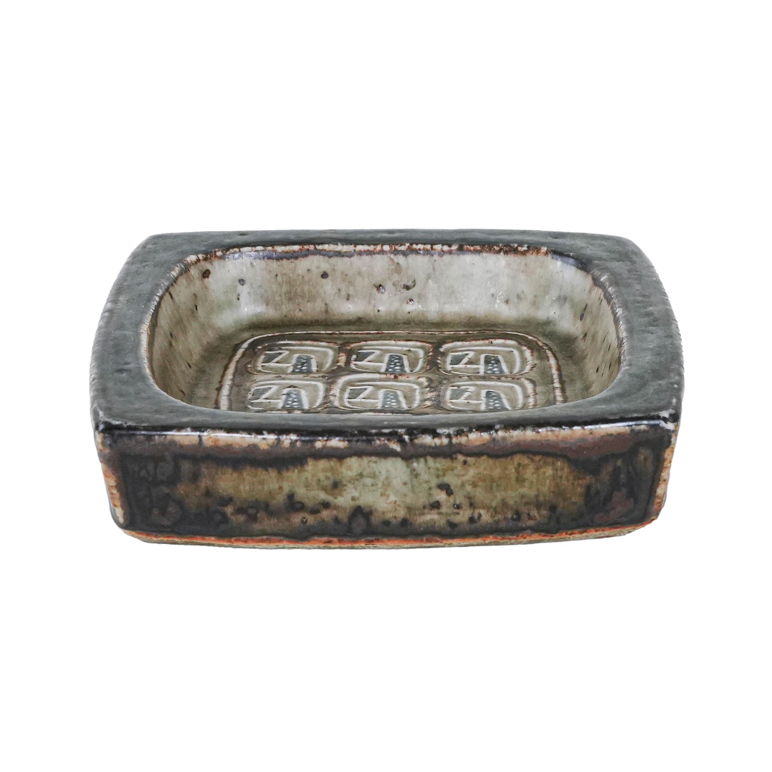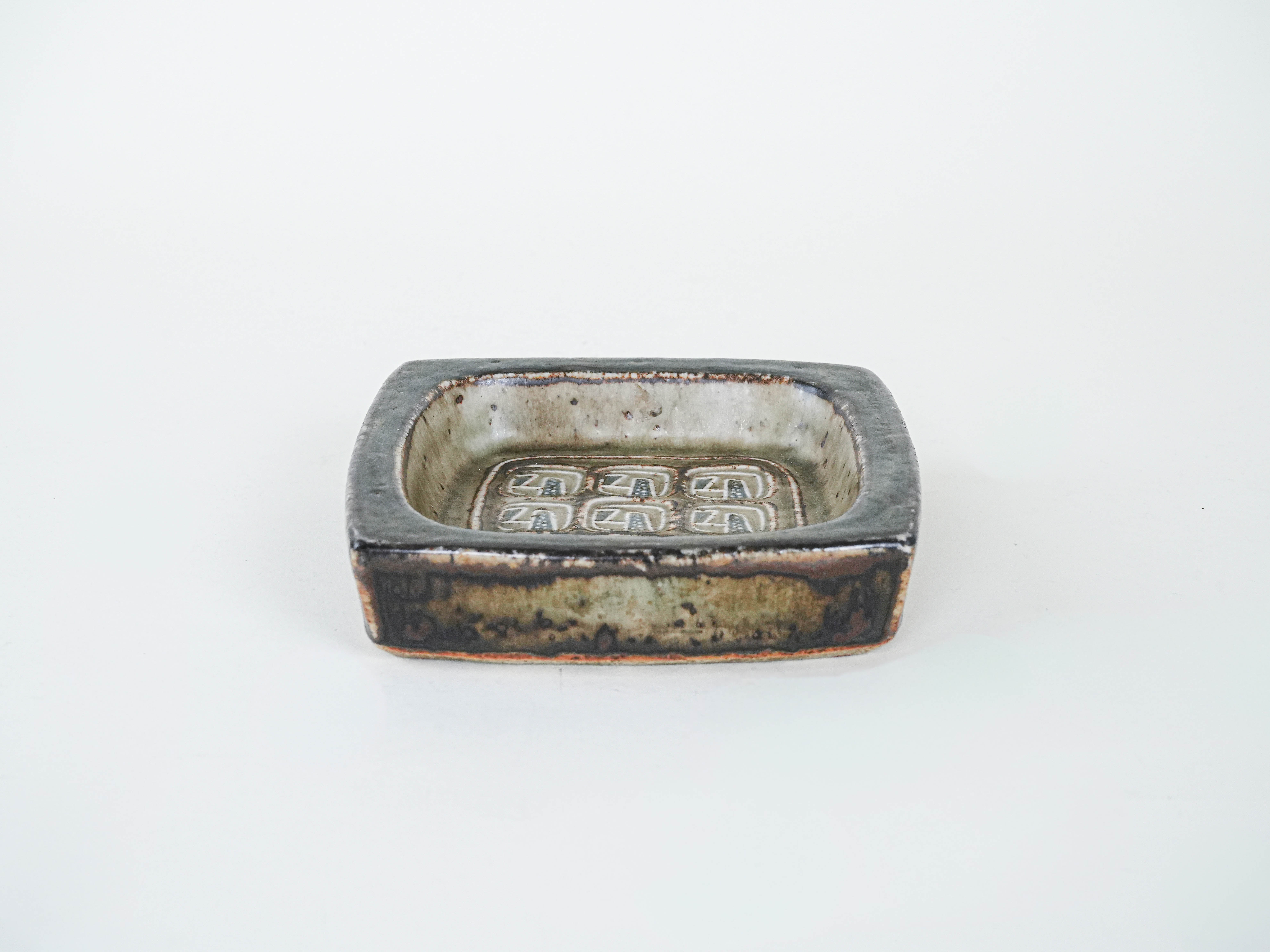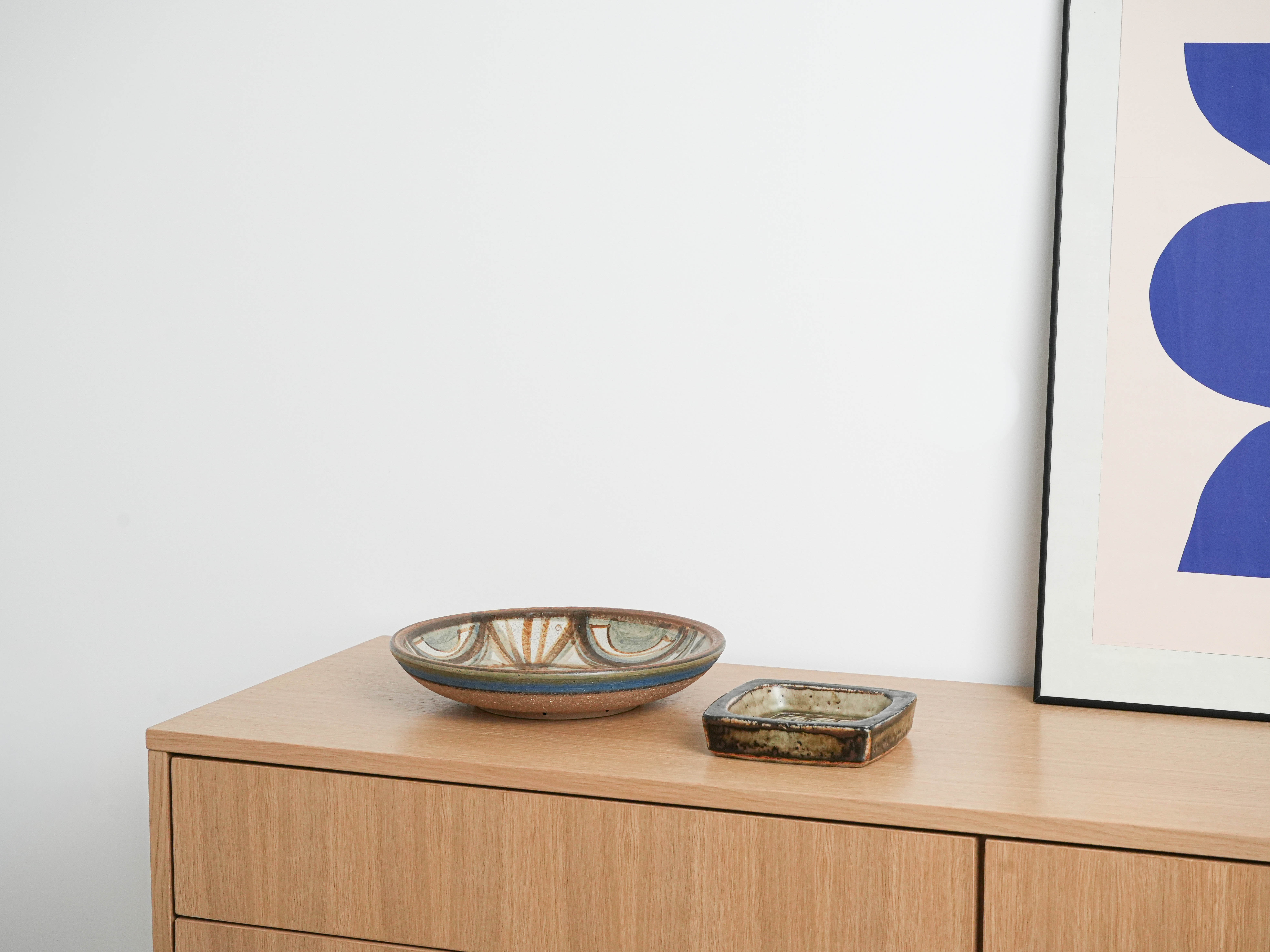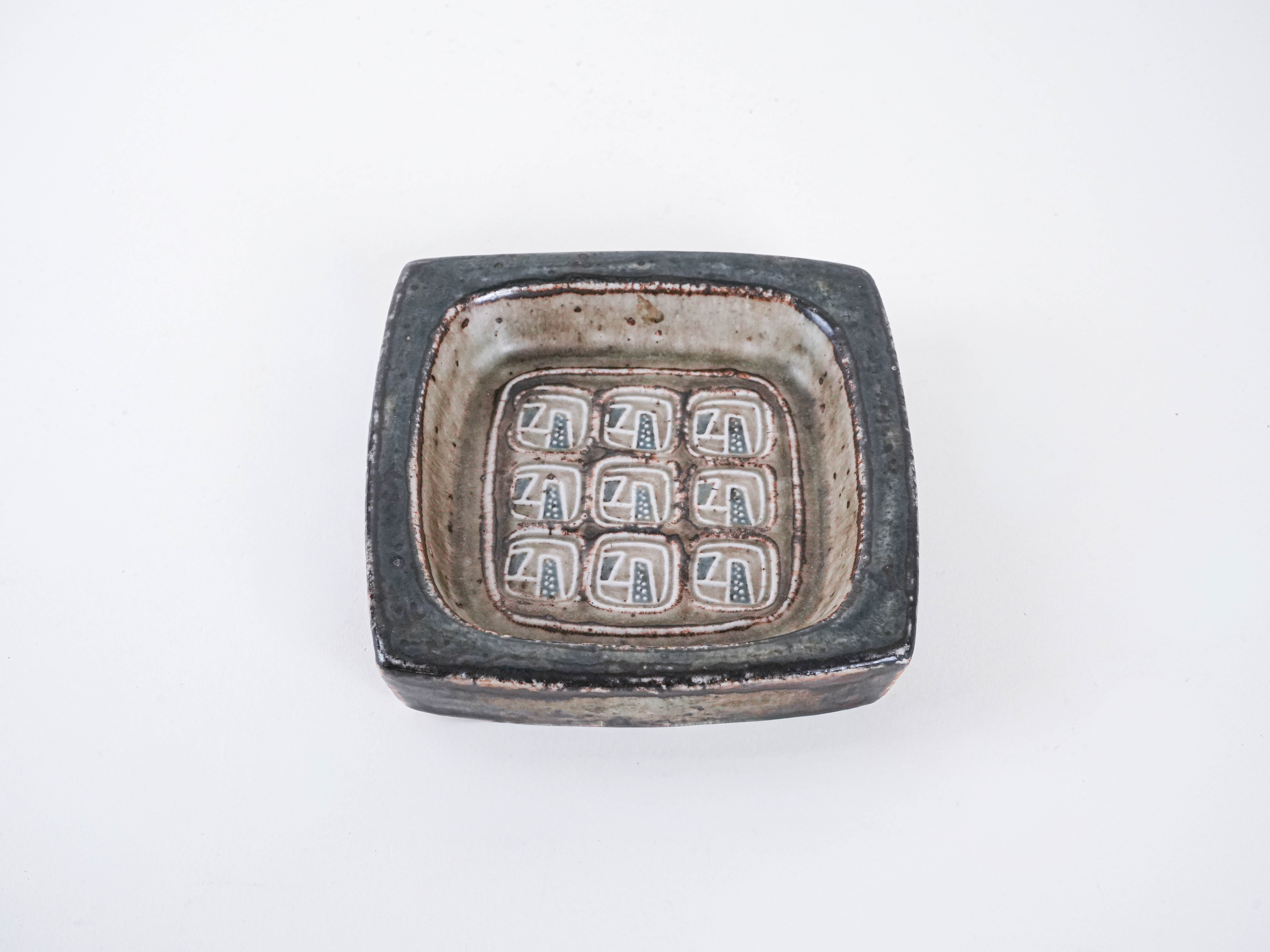 Kwadratowa, ceramiczna miseczka Royal Copenhagen, ręcznie dekorowana w abstrakcyjnym, geometrycznym stylu autorstwa Nilsa Thorssona. Szkliwo w odcieniach zieleni, beżu i niebieskości tworzy efektowną, ponadczasową kompozycję. Idealna jako mała patera, na biżuterię czy jako obiekt kolekcjonerski.