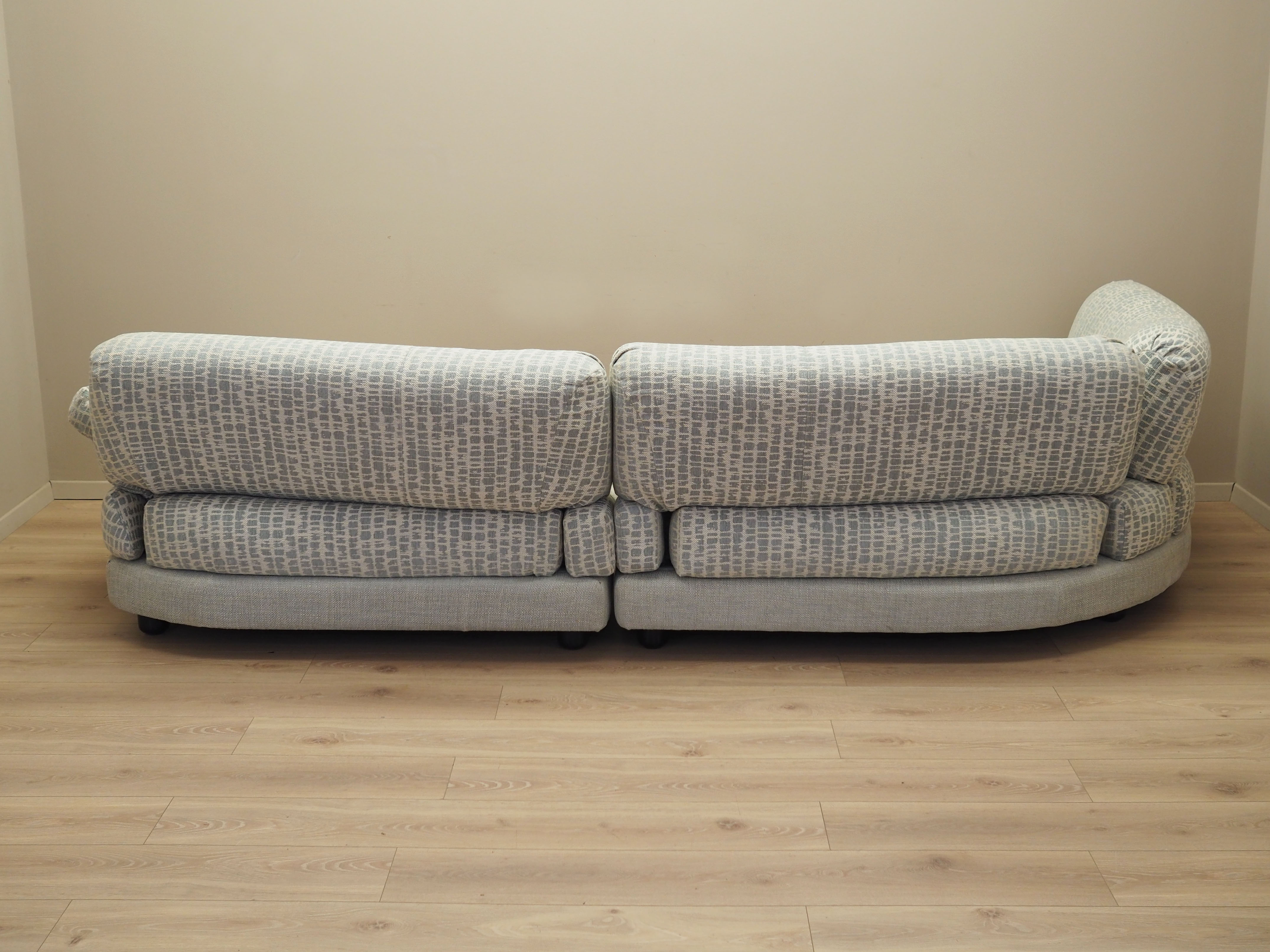 Nogi wykonane z tworzywa sztucznego. Sofa została poddana renowacji tapicerskiej, gąbki oraz tkanina wymienione na nowe. Wykorzystana została wysokogatunkowa tkanina w kolorach szarym i beżowym. Sofa składa się z trzech elementów, które można łączyć w różnych konfiguracjach. Jeden z elementów z powodzeniem może pełnić funkcję fotela.
