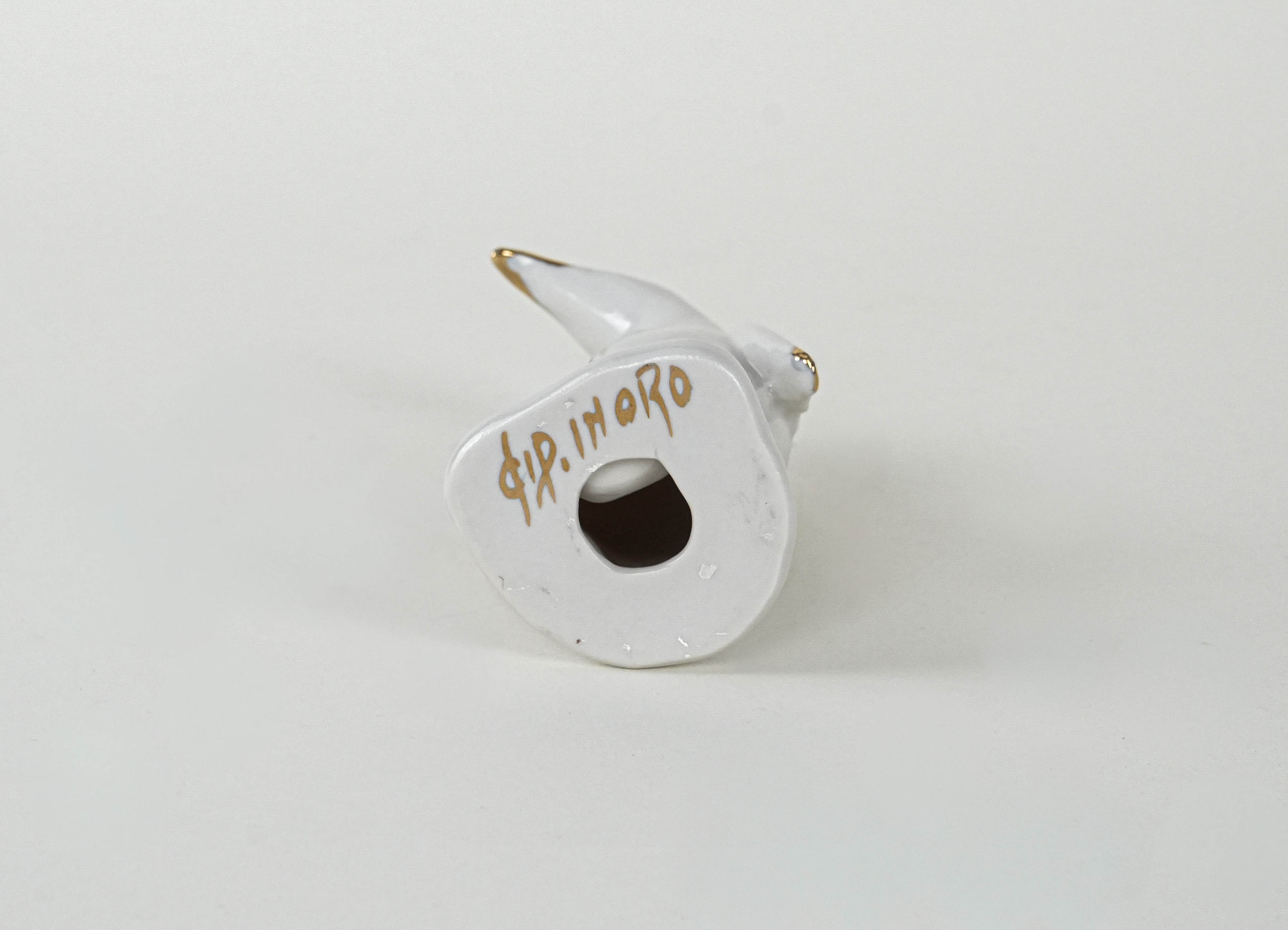 Delikatna figurka przedstawiająca pingwina, wykonana z białej porcelany i dekorowana ręcznie złoceniami na dziobie, oczach, skrzydłach i łapach. Prosta, smukła forma w stylu modernistycznym sprawia, że przedmiot doskonale wpisuje się w estetykę lat 60. i 70. XX wieku.