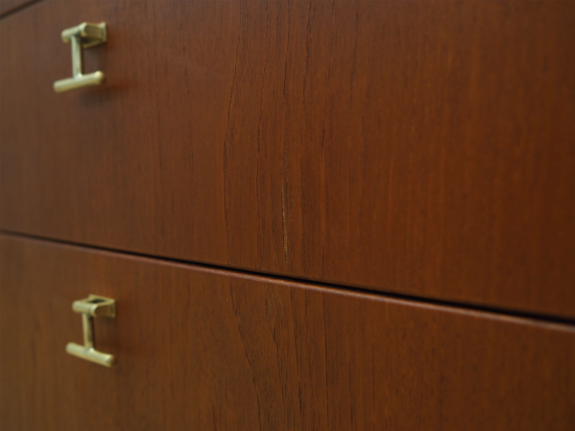 Konstrukcja pokryta jest fornirem tekowym. Uchwyty zostały wykonane z mosiądzu. Mebel umieszczony został na drewnianym cokole. Wewnątrz przestrzeń została wypełniona dziewięcioma praktycznymi półkami z możliwością regulacji wysokości oraz ośmioma szufladami. Regał jest idealnym rozwiązaniem na duży zbiór książek do zagospodarowania w małej przestrzeni mieszkalnej.
