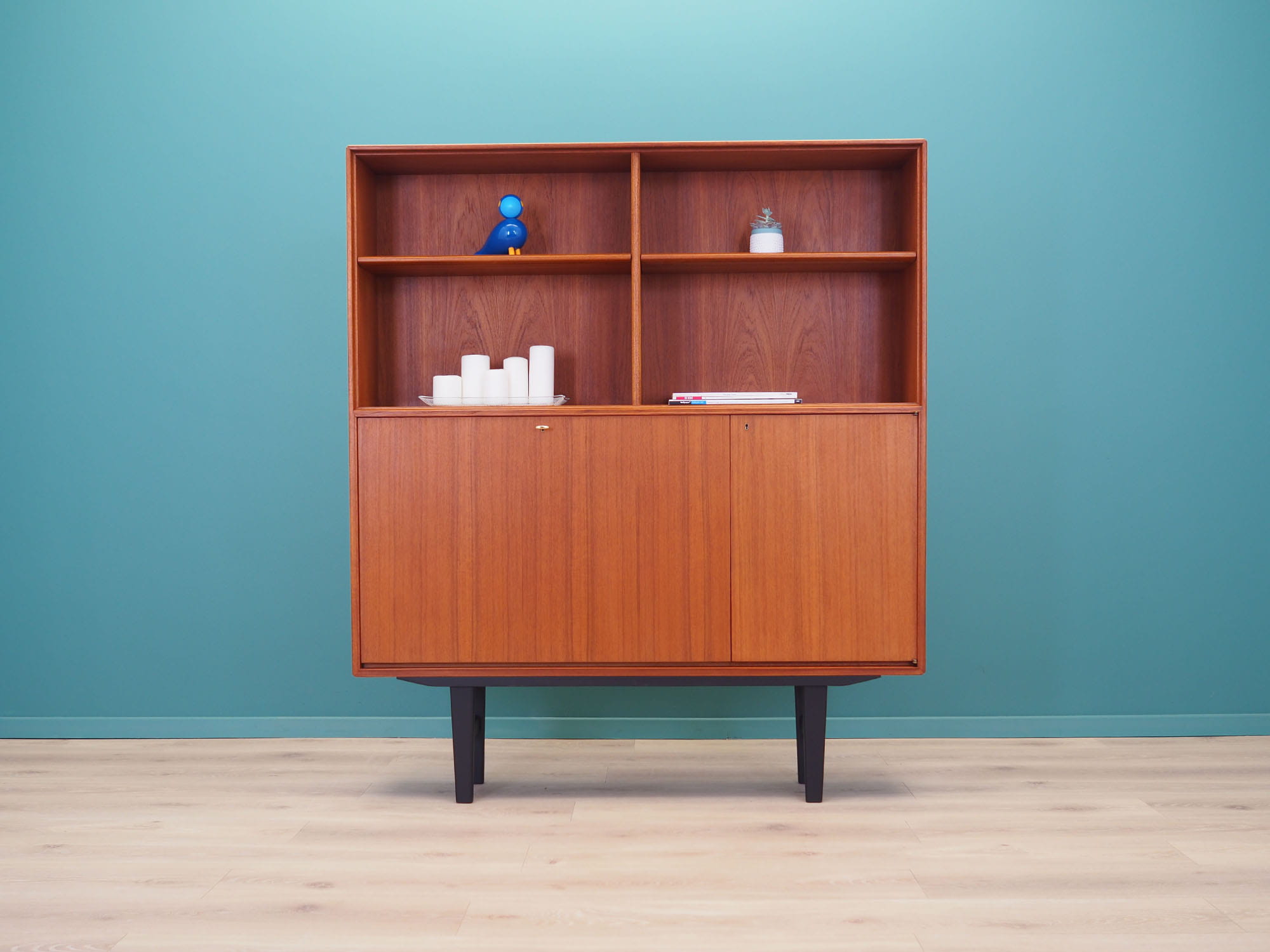 Konstrukcja pokryta jest fornirem tekowym. Nogi wykonane z litego drewna wybarwione na kolor czarny. Powierzchnia po odświeżeniu. Wewnątrz przestrzeń została wypełniona praktycznymi półkami z możliwością regulacji wysokości. Regał jest idealnym rozwiązaniem na duży zbiór książek lub przedmiotów kolekcjonerskich do zagospodarowania w małej przestrzeni mieszkalnej. Kolejnym atutem jest uniwersalny barek. Wewnątrz barku znajduje się dodatkowo wkładka z szufladkami i przegródką. Zamek sprawny, klucz w zestawie. Mebel posiada w tylnej ścianie barku otwór na kable.
