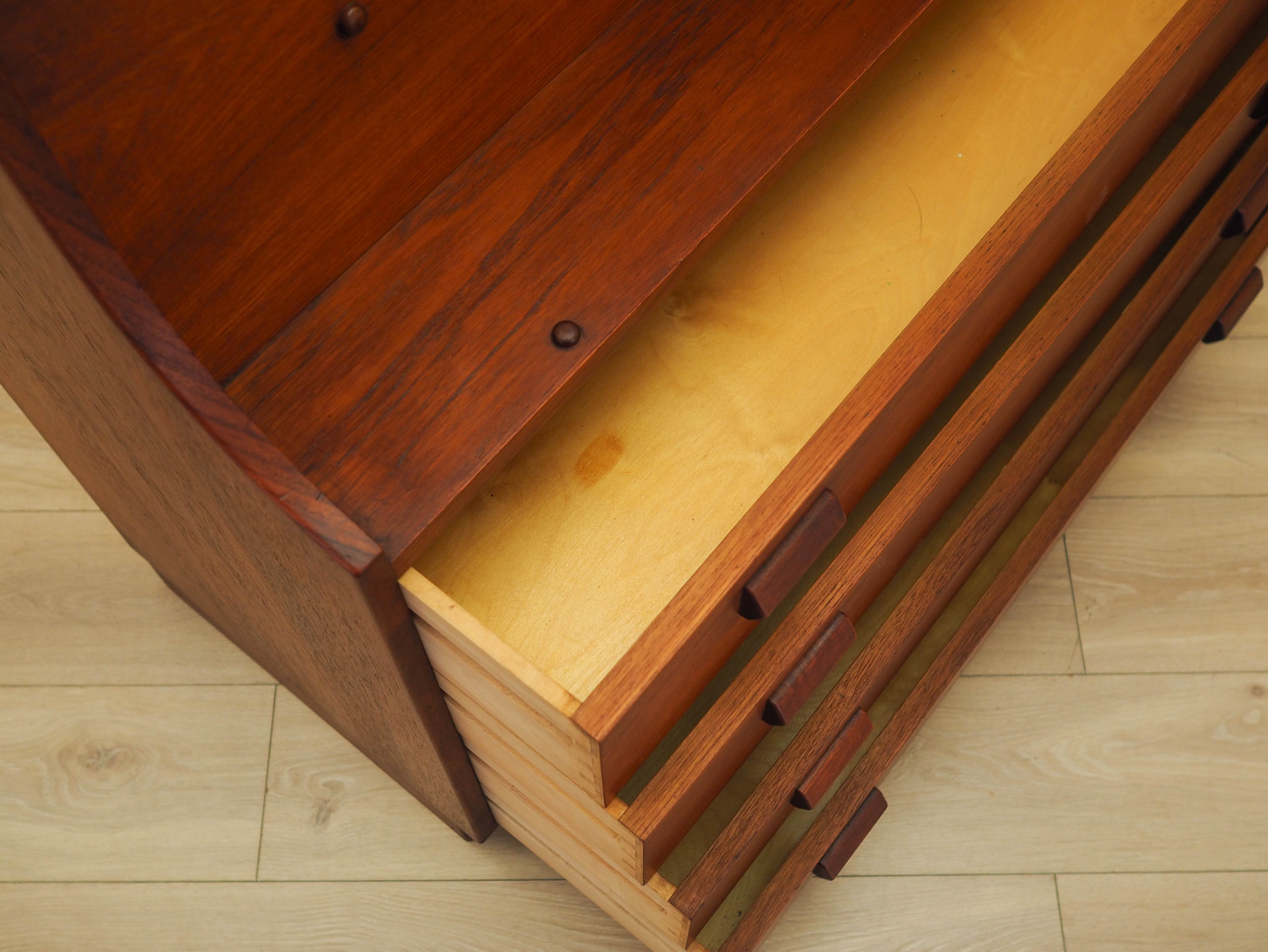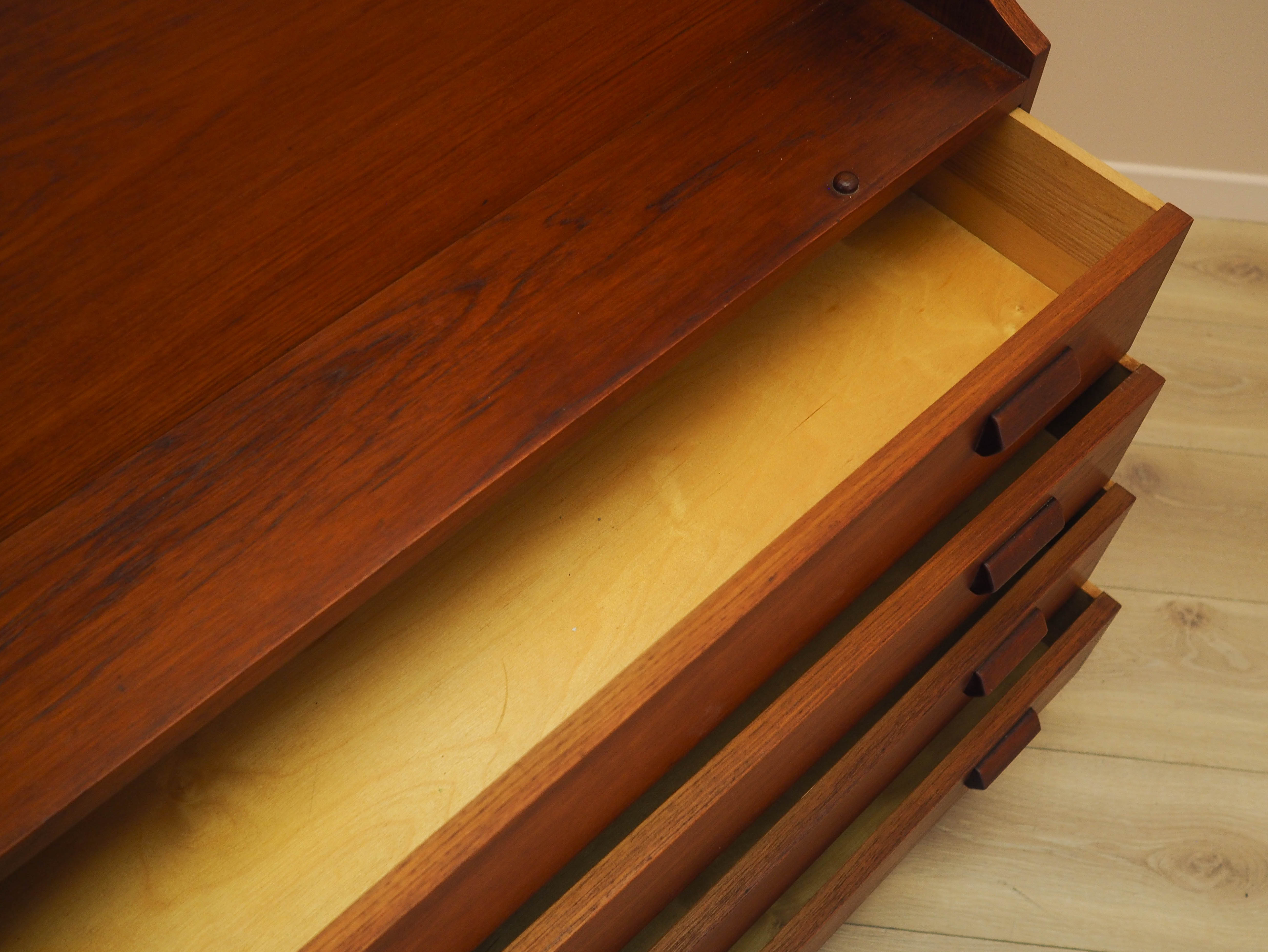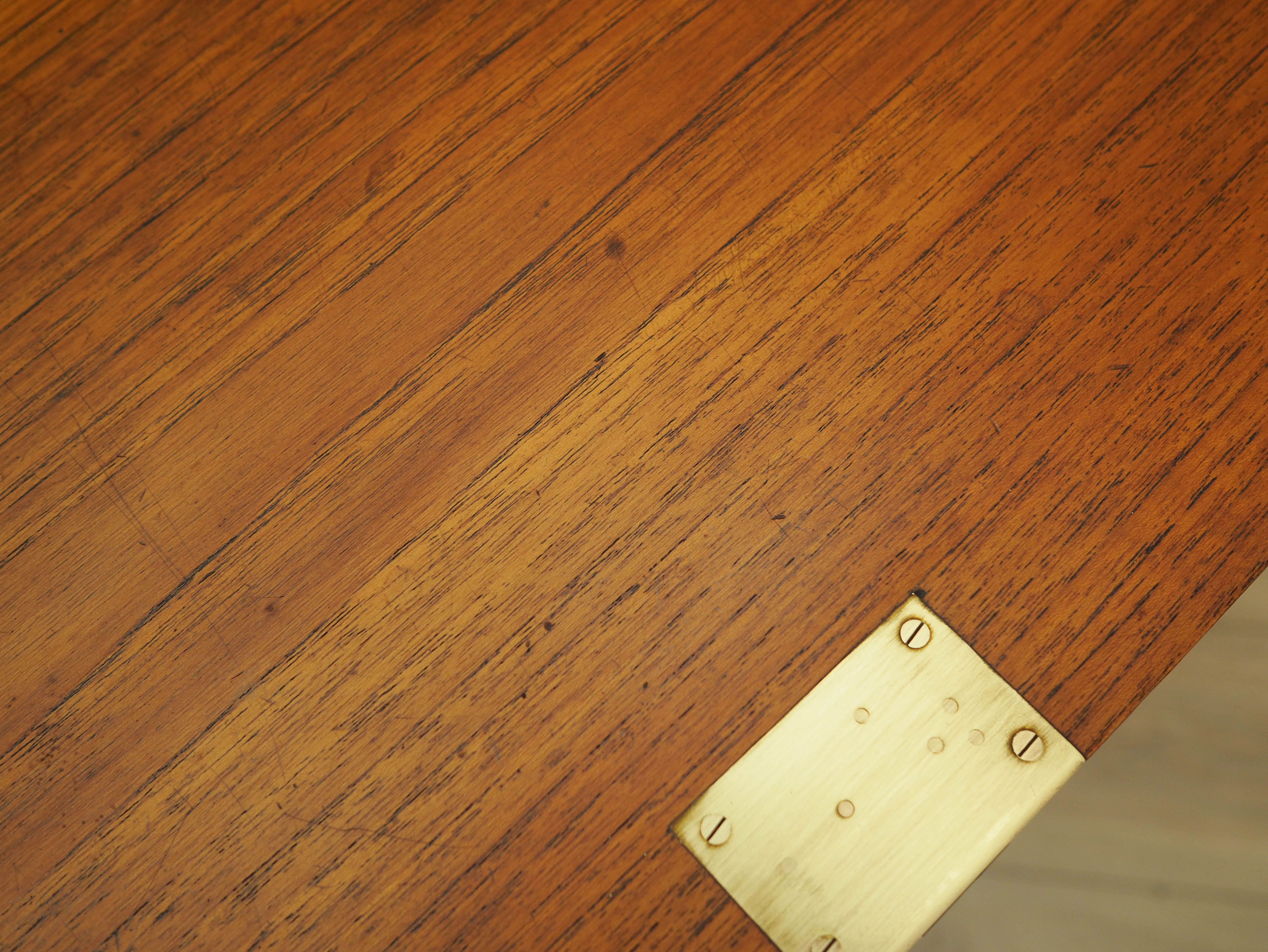 Konstrukcja pokryta jest fornirem tekowym. Mebel umieszczony został na drewnianym cokole. Powierzchnia po odświeżeniu. Wnętrze mebla zostało wypełnione czterema szufladami. Dodatkowo pod podnoszonym blatem znajduje się zamykany na klucz barek, w którym umieszczone zostały dwie szufladki oraz nieregulowane półeczki i przegródki. Sekretarzyk jest jednym z najbardziej wielofunkcyjnych mebli jakie zostały zaprojektowane w historii duńskiego wzornictwa. Może pełnić funkcję komody, dzięki czemu idealnie spełni swoją rolę jako szafka na dokumenty, zabawki w pokoju dziecięcym lub jako bieliźniarka w sypialni. Podnoszony blat pozwala na używanie sekretarzyka jako biurka. Ponadto jego ponadczasowy design nada charakteru każdemu wnętrzu, w którym będzie użytkowany. Klucz w zestawie.